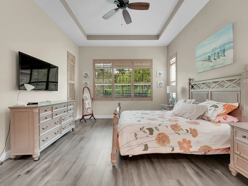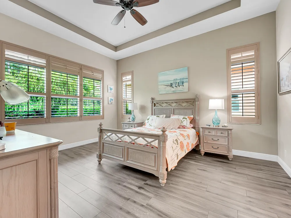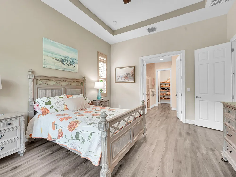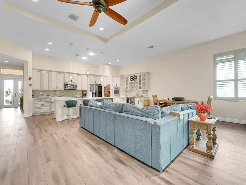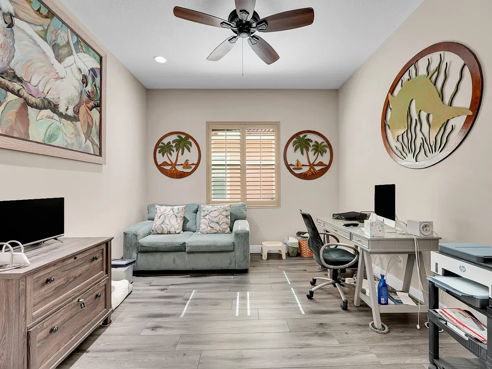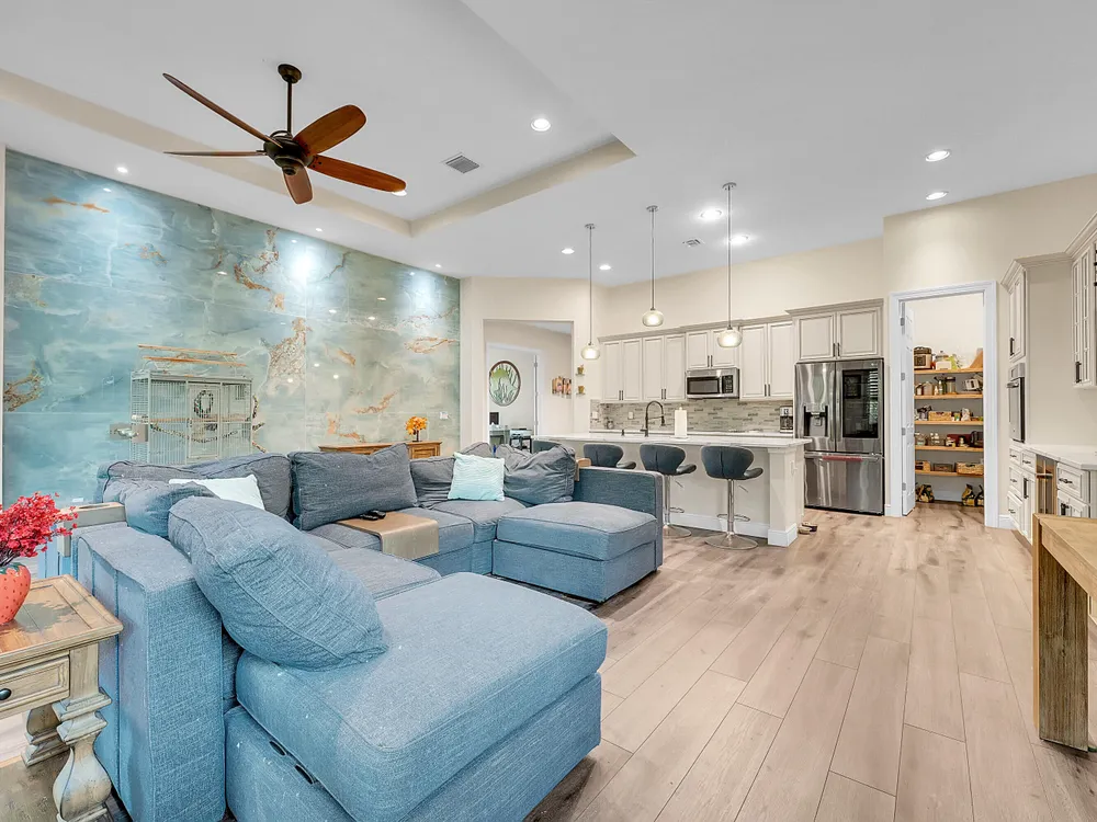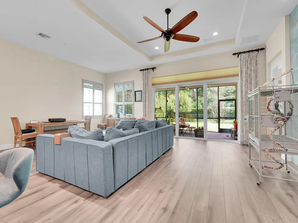 This sought-after Lago plan offers an exceptional open-concept design. Situated in the f PGA Verano community, the home boasts a fantastic location: directly across the street from a tranquil pond and backing up to a lush hedge that provides a peaceful buffer from the PGA golf course.The thoughtful layout features a spacious owner's suite with a large master bedroom and a functional den, conveniently located immediately off the foyer. Culinary enthusiasts will appreciate the dedicated pantry and the separate laundry room. The expansive living space flows seamlessly into a lovely screened-in patio at the rear of the house, where you can relax and enjoy the serene and private backyard setting. This home is an ideal blend of luxury, privacy, and convenience. Live the Verano Life Style today!