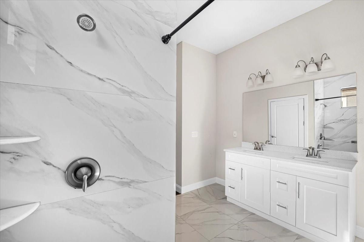Open floor plan, vaulted ceilings, modern kitchen with 42-inch shaker cabinets all wood, double stainless-steel sink, goose neck faucet, quartz counter tops, functional cooking island, huge Lanai Master bedroom is oversized with trey ceilings, double walk-in closets. pull down-stairs to attic access. Garage is extra deep to accommodate extra-long vehicle. Short walk to community mailboxes. This is a must see.