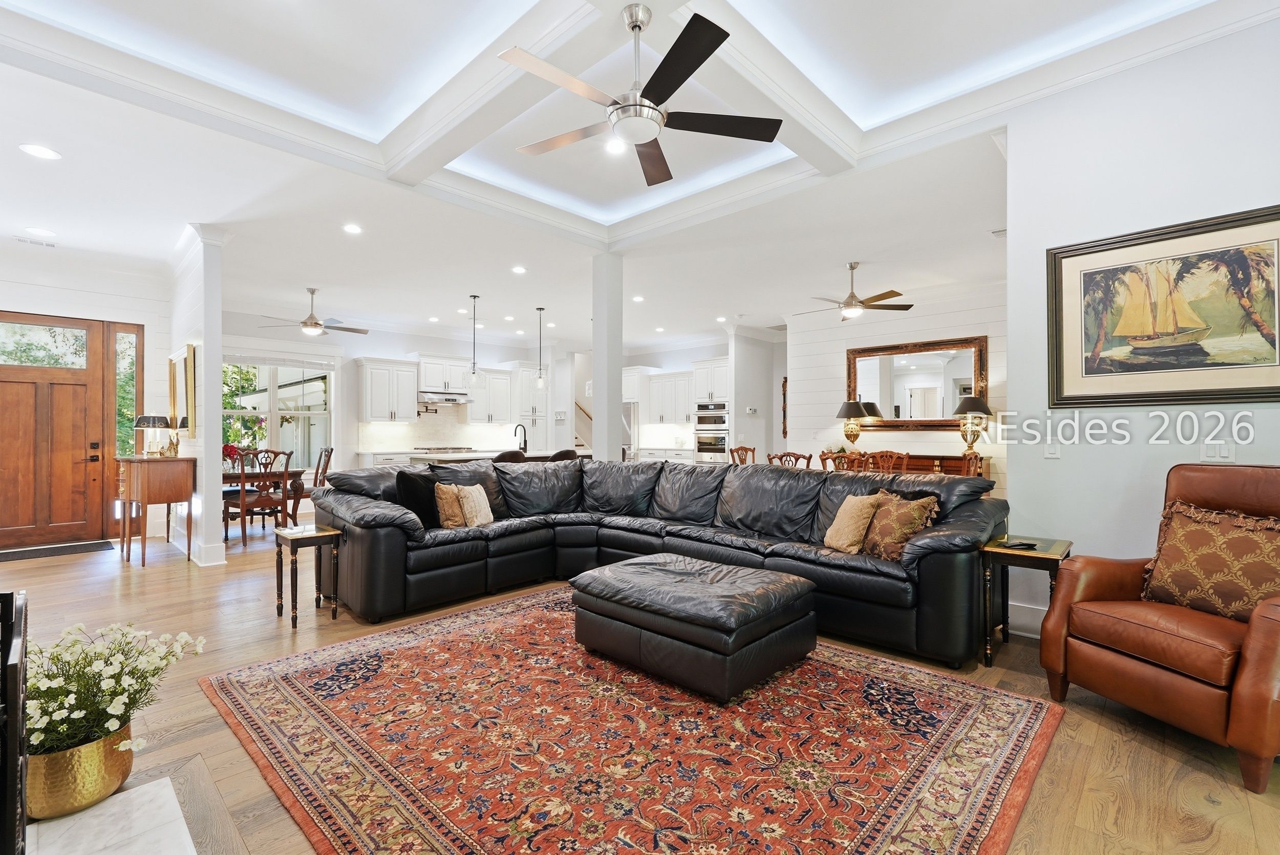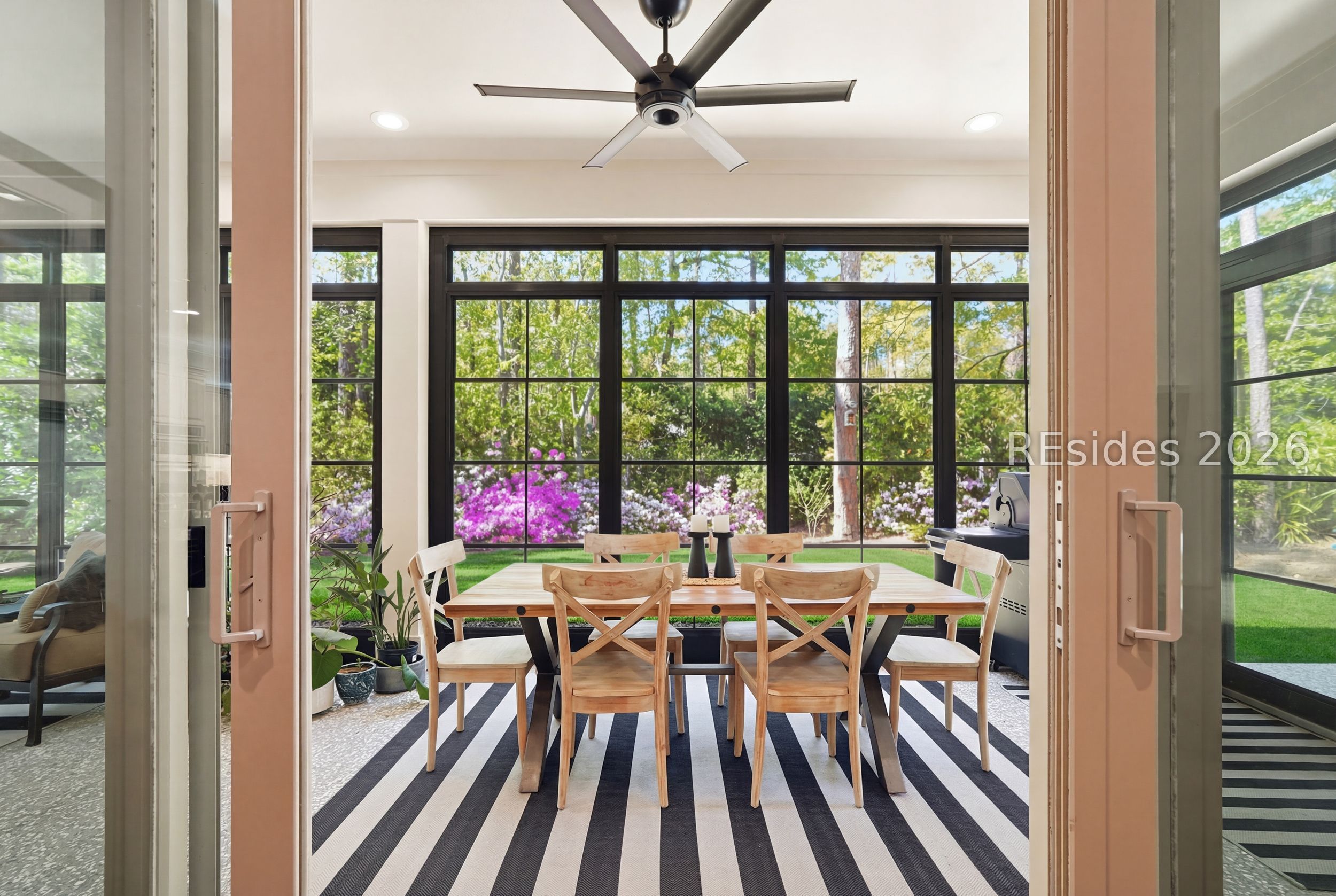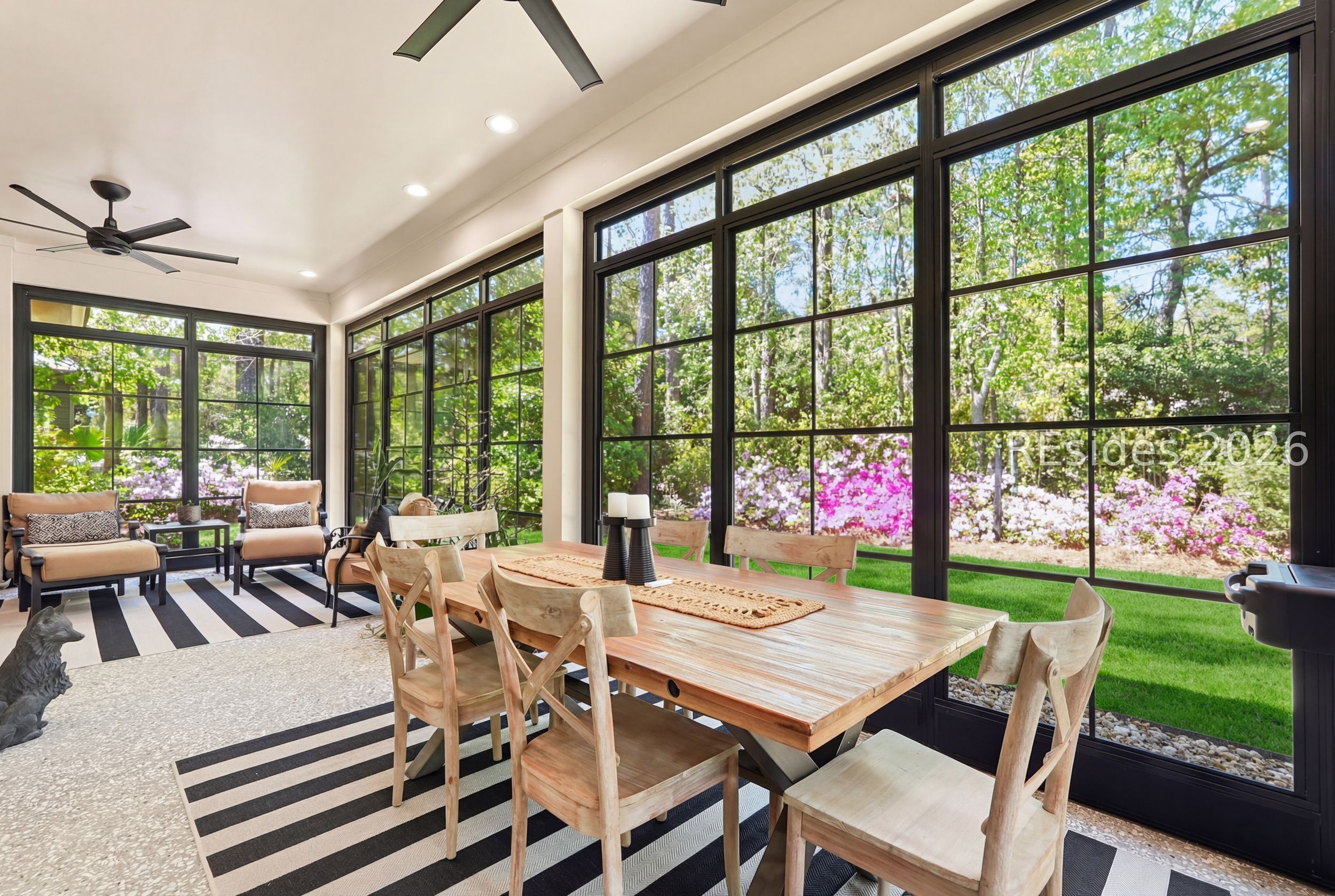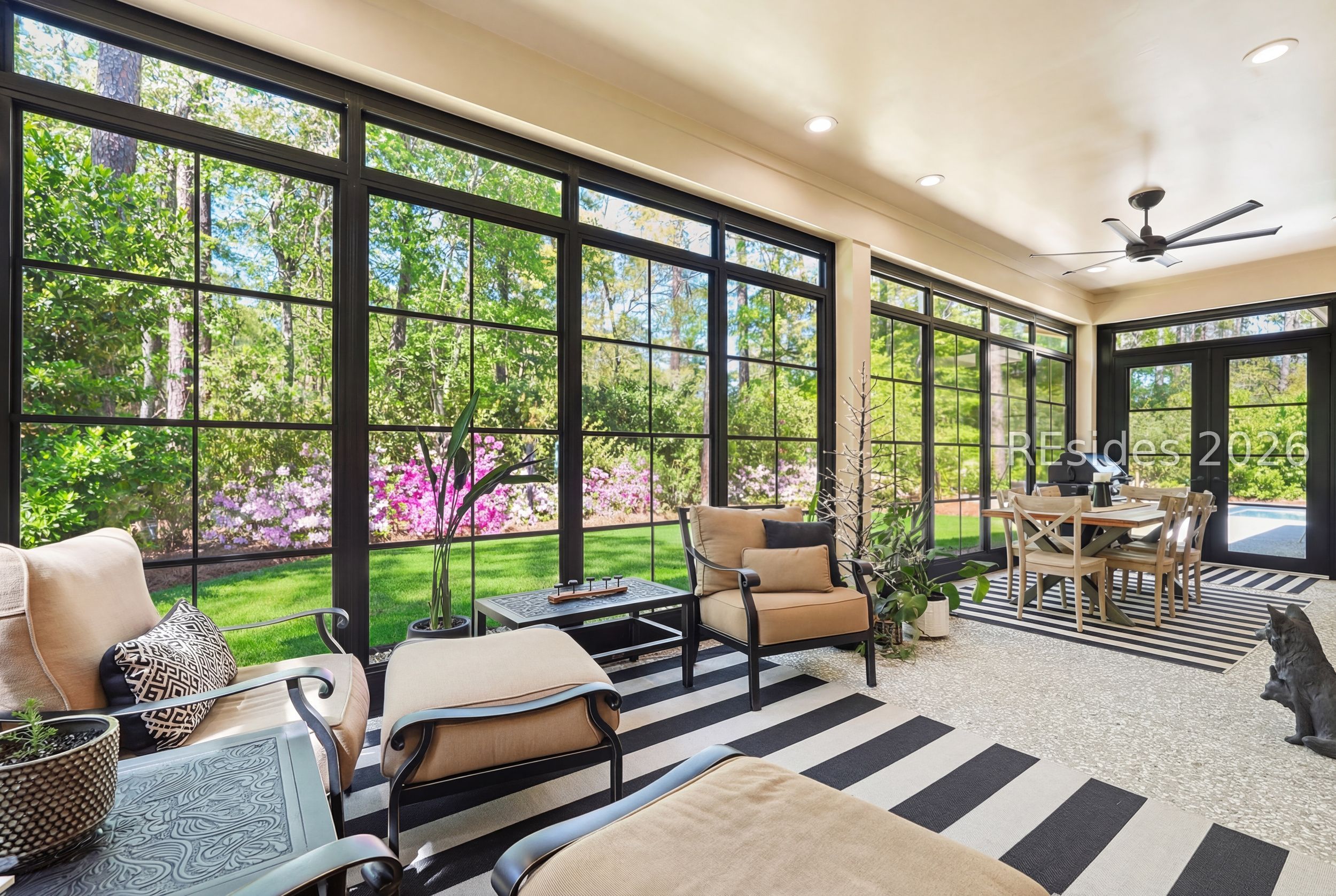 Set on one of the highest elevations on Hilton Head Island (approximately 20 feet above sea level, Zone X), this thoughtfully designed home built in 2021 provides both security and a true sense of retreat-surrounded by mature trees and lush, curated landscaping that creates a secluded, garden-like setting. Inside, the home is equally impressive. Light-filled living spaces with 10+ ft ceilings flow effortlessly into a stunning open-concept design anchored by a beautifully appointed gourmet kitchen. Featuring an 11-foot quartz island, custom cabinetry with extensive drawer storage, honed marble backsplash, gas cooktop, double ovens, and a butler's pantry with beverage center, this space was designed for both everyday living and exceptional entertaining. The home offers four spacious ensuite bedrooms, including a luxurious first-floor primary suite with dual walk-in closets, spa-like bath, and elegant finishes throughout. A large second-floor flex suite provides ideal space for guests, media, or a private retreat. One of the home's most captivating features is the all-season porch-nearly 300 square feet of additional living space-designed with a convertible SunSpace system that transitions from enclosed to screened, allowing you to enjoy coastal breezes, abundant natural light, and peaceful garden views year-round. Step outside to a private outdoor oasis. The saltwater pool with Italian travertine decking offers both sun and shade throughout the day, while the expansive surrounding deck provides generous space for lounging or dining. The landscaping-featuring over 300 flowering plants across 58 varieties-creates a vibrant, ever-changing backdrop, with blooms extending from spring through late fall and even into winter. Designed with entertaining in mind, the home comfortably accommodates large gatherings, with space for up to 24 guests, dual refrigerators, a premium Scotsman nugget ice maker, and ample parking for family and friends. Located just minutes from the Bluff Trail, Dolphin Head Beach, golf, and miles of leisure paths, this home offers a unique blend of privacy, natural beauty, and coastal lifestyle-an exceptional opportunity in one of Hilton Head's most desirable settings.