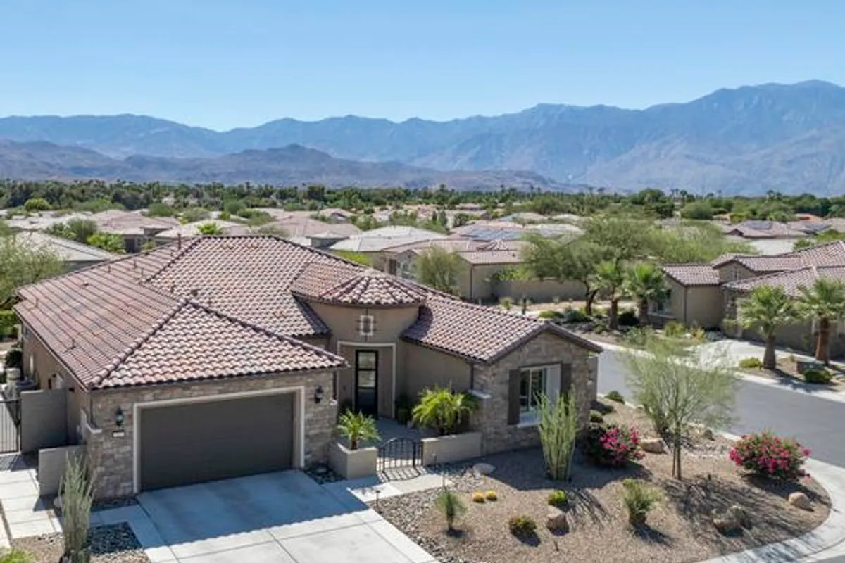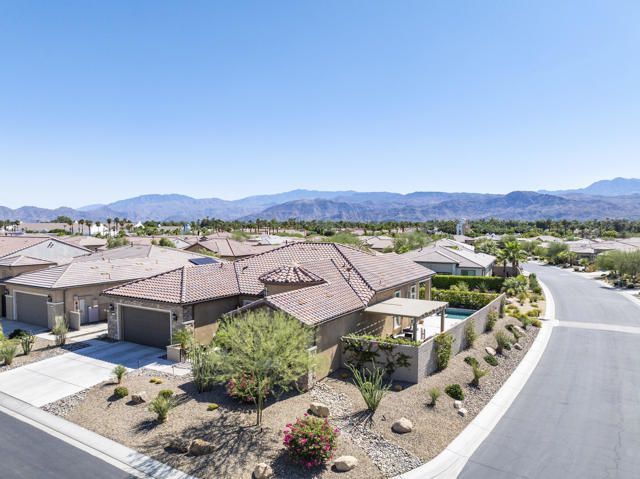 BEST VIEW AT DEL WEBB! Welcome to this stunning SERENITY model with OWNED SOLAR and situated on an elevated corner lot to capture panoramic MOUNTAIN VIEWS. Featuring high ceilings and walls of glass, the home exudes luxury the minute you step into the rotunda foyer from the courtyard. The open floor plan centers on a sleek kitchen with KitchenAid appliances, granite countertops and an expansive island that flows into the living area with a MULTI PANEL SLIDING DOOR SYSTEM opening to a resort style backyard for true indoor/outdoor living. Enjoy the sparkling PebbleTec pool and spa plus side patio with pergola for BBQ and al fresco dining. Two private ensuites are well separated for privacy and the luxurious primary suite with spa like bath and custom walk-in closet opens to the pool and fabulous mountain views. The office/den with french doors and custom built-ins can also be used for a third sleeping space. Conveniences include a wine fridge, laundry room with sink and the garage features a built-in workshop, lots of storage, a water softener, tankless water heater plus its own A/C unit and insulated garage walls/ceiling. With all the finest finishes and details, this home has been meticulously maintained and is ready for you to enjoy. Del Webb Rancho Mirage is the premier 55+ community with walking trails, incredible views and so convenient to upscale shopping and dining. Residents enjoy a low HOA fee that includes cable and internet, Clubhouse, pools, tennis courts, pickelball, putting green, fitness center and endless activities. Call today to schedule your private showing.