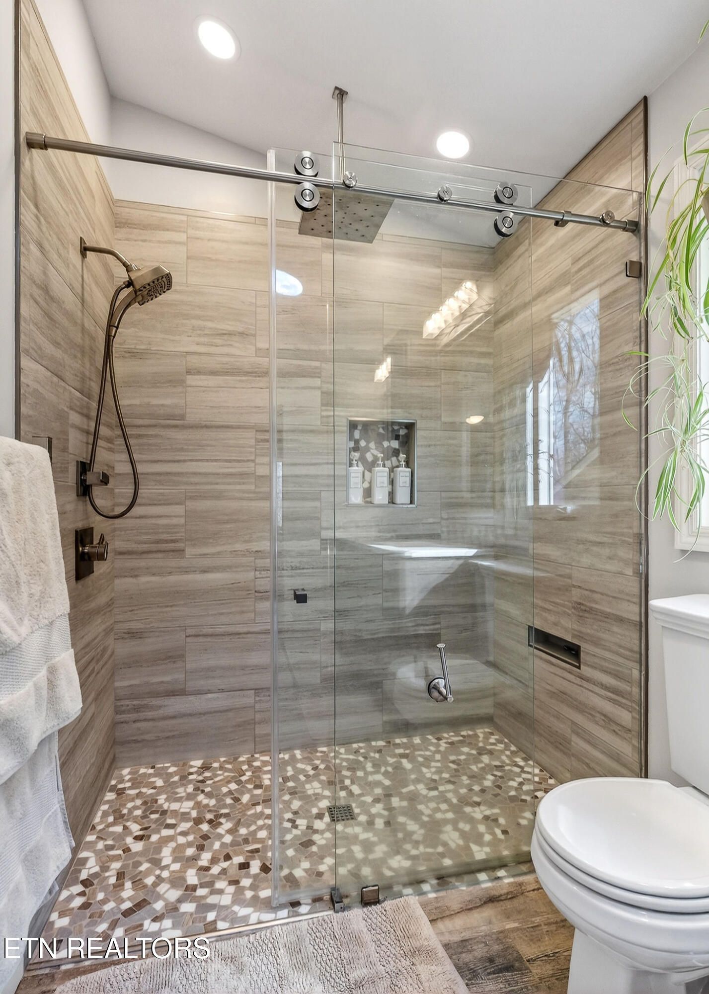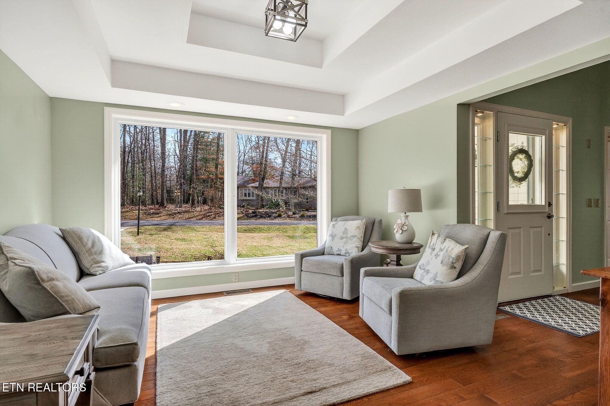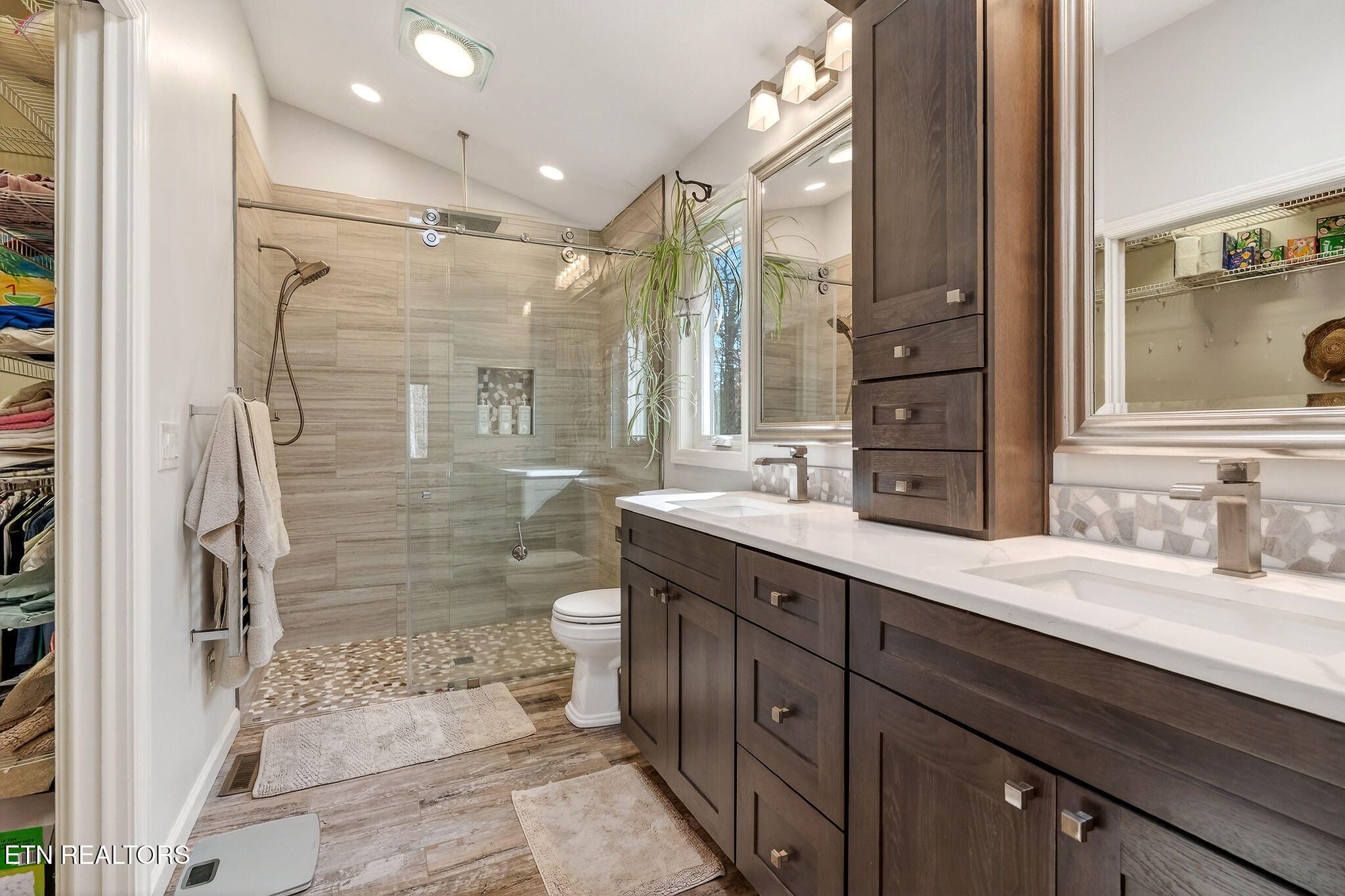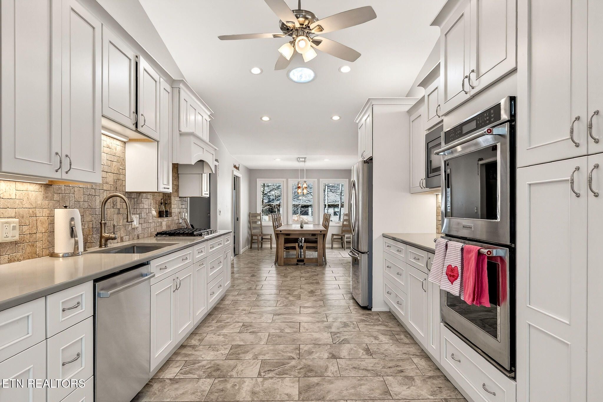 Step inside this beautifully reimagined, single-story ranch home where thoughtful design meets effortless living. Completely renovated from top to bottom, this 2,070-square-foot residence offers the rare combination of refined finishes, functional flow, and true main-level living. Warm wood floors and elegant tile set the tone as you enter, leading you into a spacious great room crowned by a vaulted ceiling and anchored by a cozy gas fireplace—an inviting heart of the home made for gathering. Just beyond, a sunroom captures natural light and offers a peaceful retreat, while a small formal living area adds flexibility for entertaining or quiet conversation. The beautifully appointed stain glass windows are removeable, but they add to the ambiance of the room. The kitchen is both stunning and smartly designed, featuring quartz countertops, stainless steel appliances, double ovens, microwave, gas cooktop, soft-close cabinetry, and beautiful under- and over-cabinet lighting that adds warmth and dimension. Whether hosting friends or preparing a quiet meal at home, this space was created to be enjoyed. The same elevated finishes continue into the bathrooms, where quartz counters and quality details shine. The primary suite is a true sanctuary. The spa-inspired bath boasts a luxurious, no-curb walk-in shower with three shower heads, a towel-warming rack, dual sinks, and exceptional storage. An impressively large walk-in closet completes the suite, offering both elegance and ease. Two additional bedrooms provide comfort for guests or family, one featuring distinctive architectural ceiling details that add character and charm. Practical upgrades are woven seamlessly throughout the home, including a recently installed recirculating water heater, new windows, lever door handles for ease of use, ceiling fans, and generous storage spaces. A dedicated utility and mudroom enhance everyday living, while the open deck invites outdoor relaxation and entertaining. Car enthusiasts, hobbyists, or craftsmen will appreciate the oversized garage, which goes beyond a traditional two-car setup with an extra bay ideal for a workshop or additional storage. Perfectly located, this home places you close to nature and convenience alike—just minutes from two nearby lakes, less than half a mile from the boat ramp, under a mile to the grocery store, and only moments from restaurants and I-40 for effortless access. This is more than a home—it's a thoughtfully crafted lifestyle, where comfort, beauty, and location come together in perfect harmony.