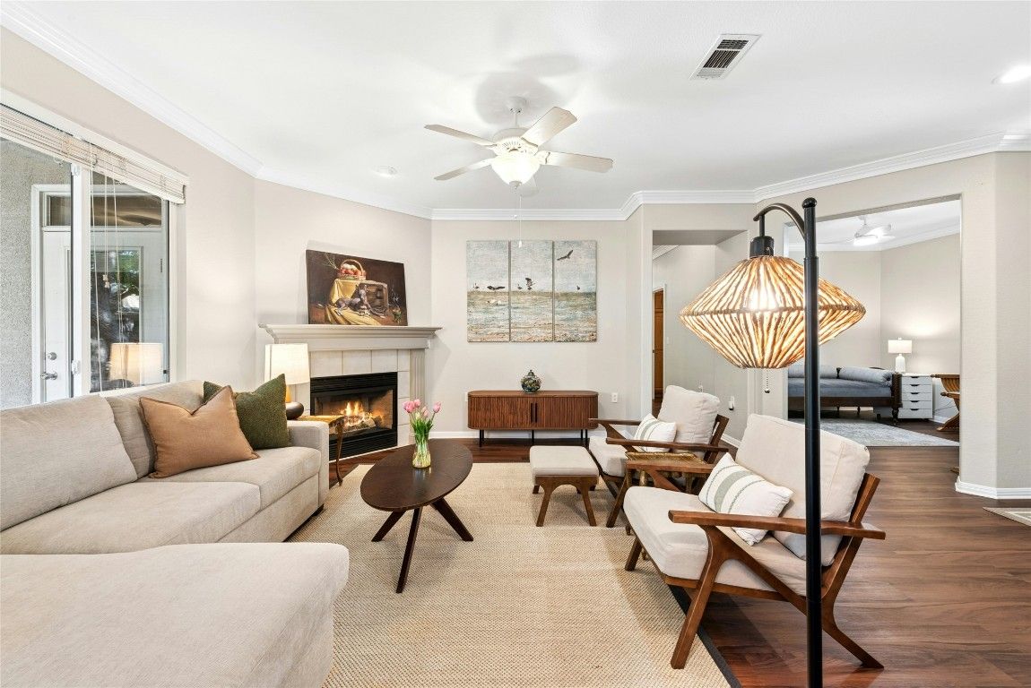 This wonderfully updated Del Webb-built "Dickinson" floor plan home offers a bright and welcoming feel in an "easy-to-everywhere" Sun City setting! The kitchen features a one-level quartz breakfast bar and counters, LG gas range, pull-out cabinet trays, and a custom pantry — perfect for everyday cooking and entertaining. The living room includes a cozy gas log fireplace and crown molding detail for added charm. Wood-look vinyl plank flooring extends throughout the home — no carpet anywhere. The spacious main bedroom provides private access to the covered back porch, while the updated main bath showcases a frameless glass shower. Additional highlights include an extended, no-step garage with decked attic storage, a professionally xeriscaped front yard and a fully fenced backyard for easy maintenance and outdoor enjoyment. Energy-efficient upgrades include radiant barrier attic insulation and a 2024 water heater. 2013 Roof.