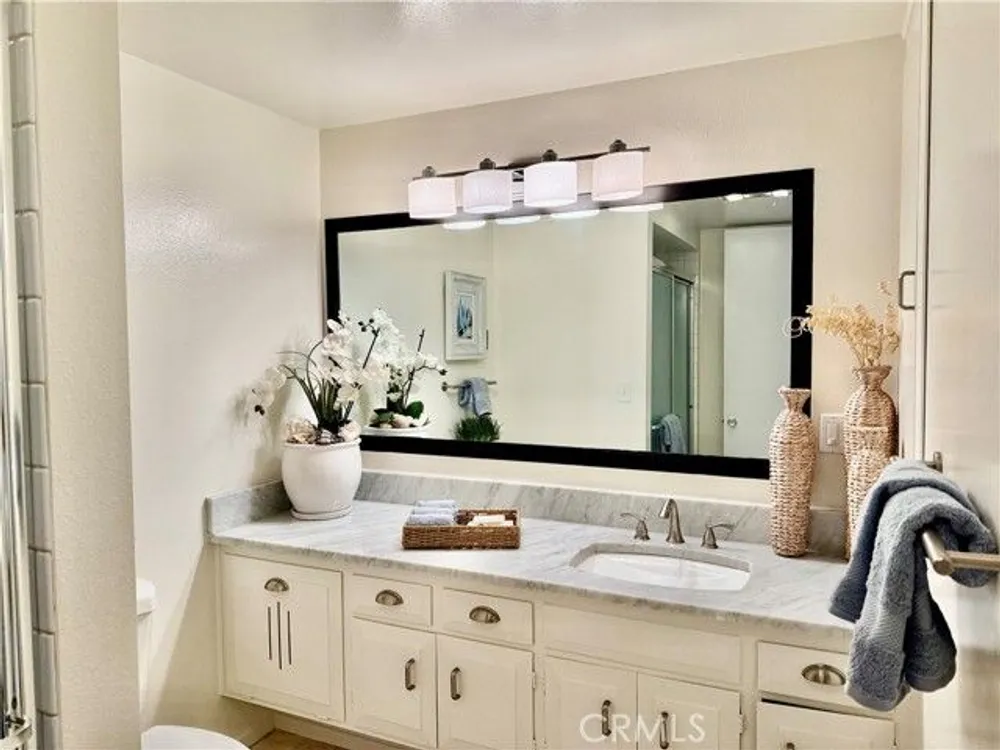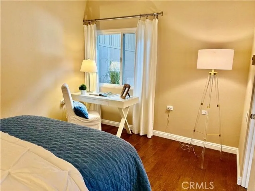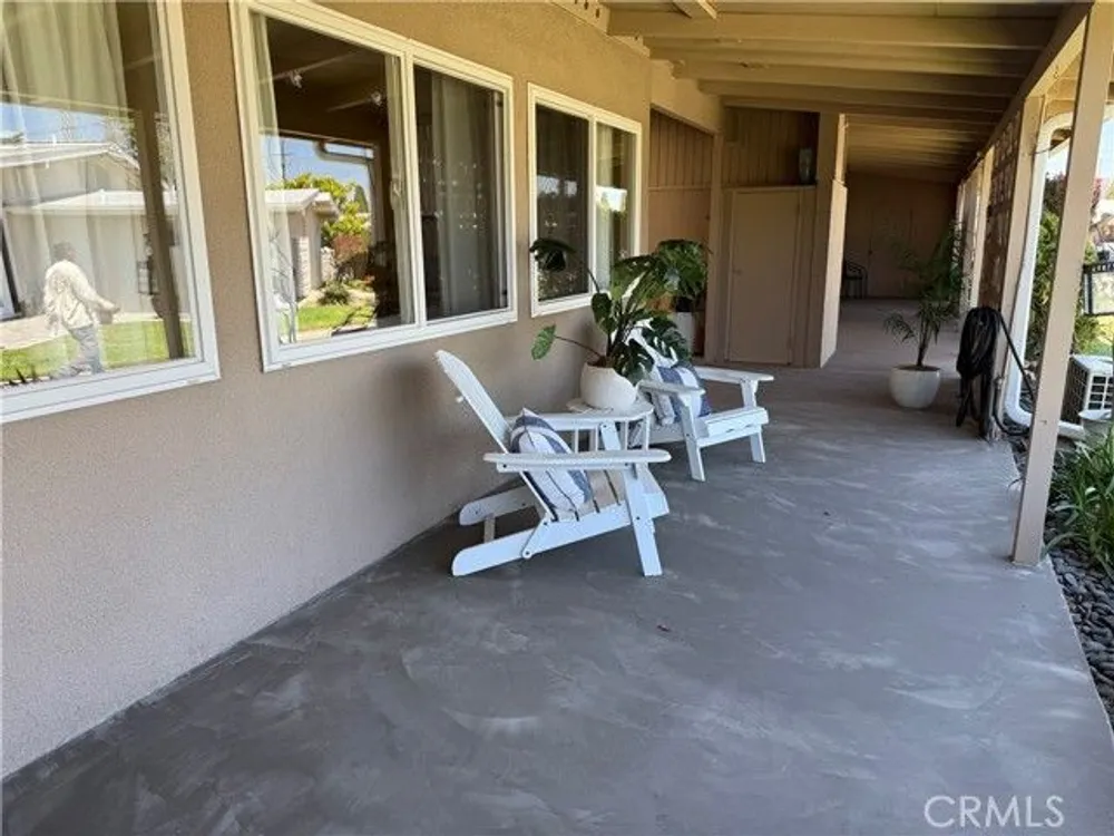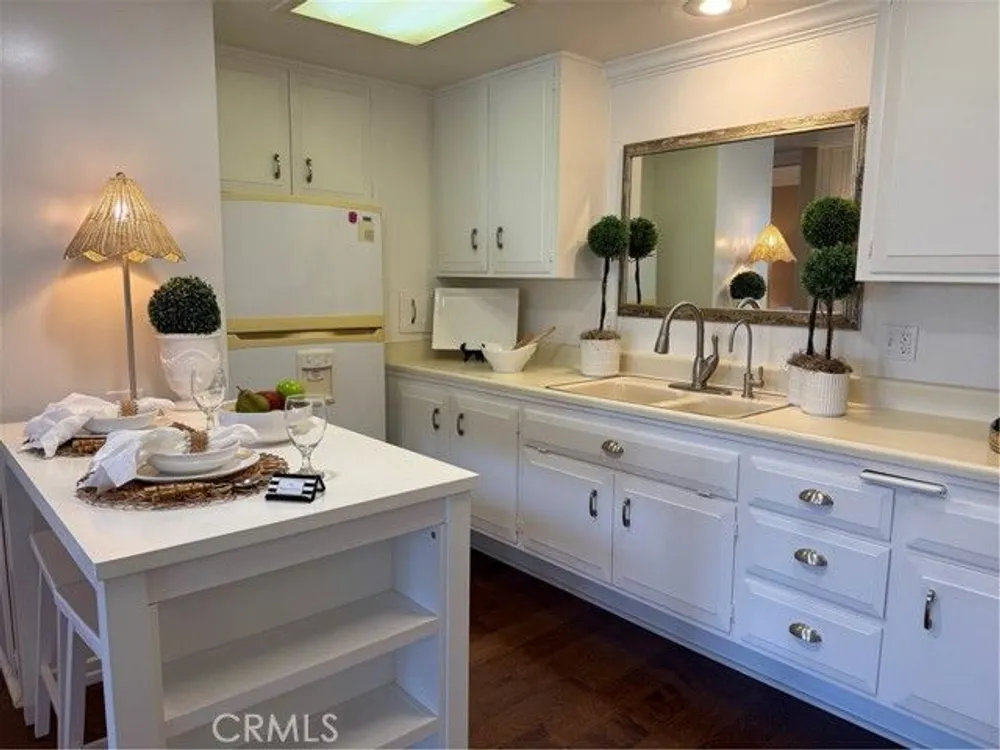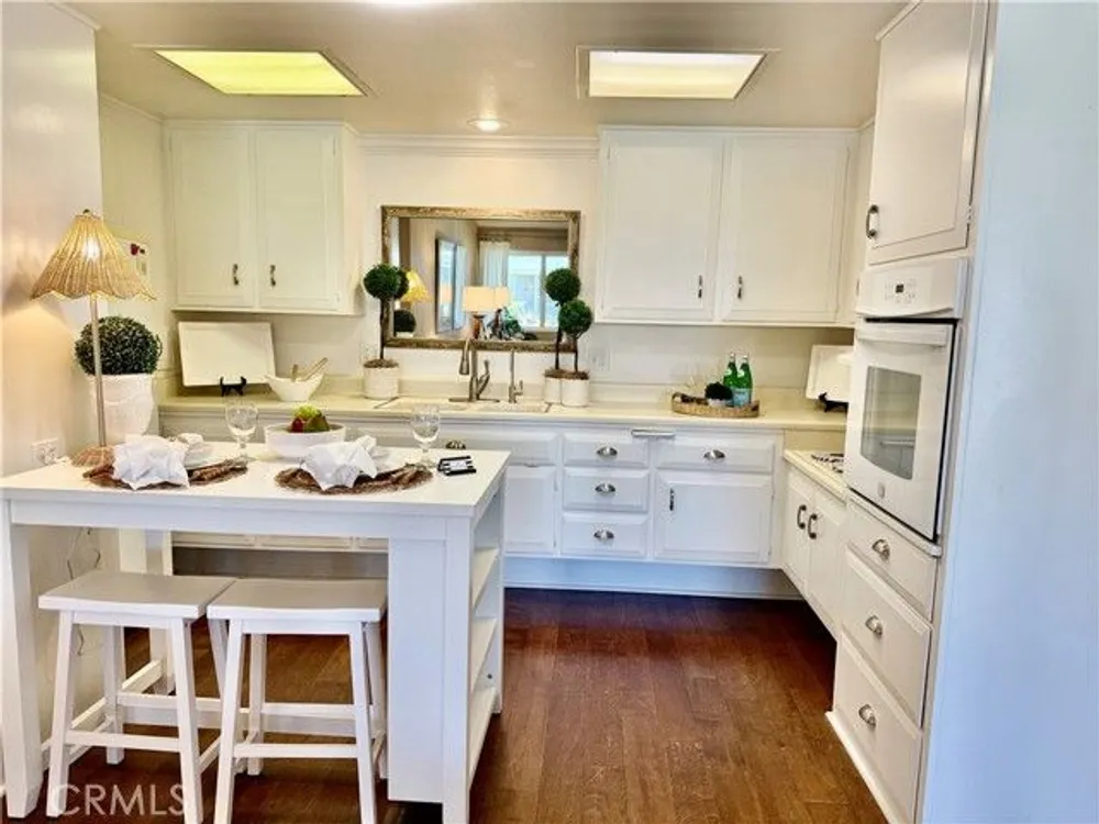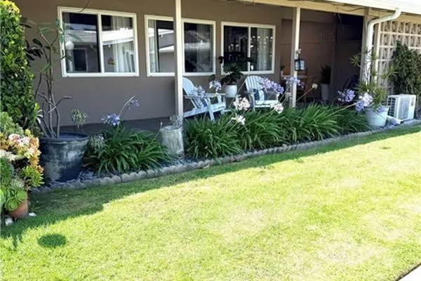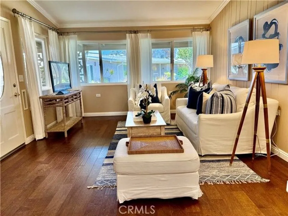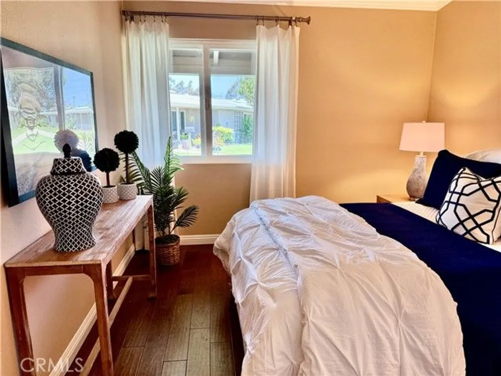 This elegant 2 bedroom one bathroom home is located in a serene green location and enjoys a great view. The leaded glass door enters into a spacious living room that features hardwood plank flooring, double pane windows, crown molding, and has been freshly painted. These upgraded features continue through-out this lovely home. The kitchen has built-in electric appliances including a stove top, oven and refrigerator. Both bedrooms and the living room over-look the inviting wrap around private patio that has been newly resurfaced. The bathroom has tile flooring, a custom walk-in shower and marble countertops. This charming home is light, bright, and ready to move in. Relax on the patio, enjoy the surroundings, the wonderful ocean breezes, and all that that this community has to offer. Leisure World Seal Beach is a resort-like community and has over 160 clubs, organizations and activities including a nine-hole 3 par golf course, swimming pool, Jacuzzi, bocce ball, shuffle board, table tennis, a variety of card and exercise groups, ceramics and art room, lapidary, and so much more.