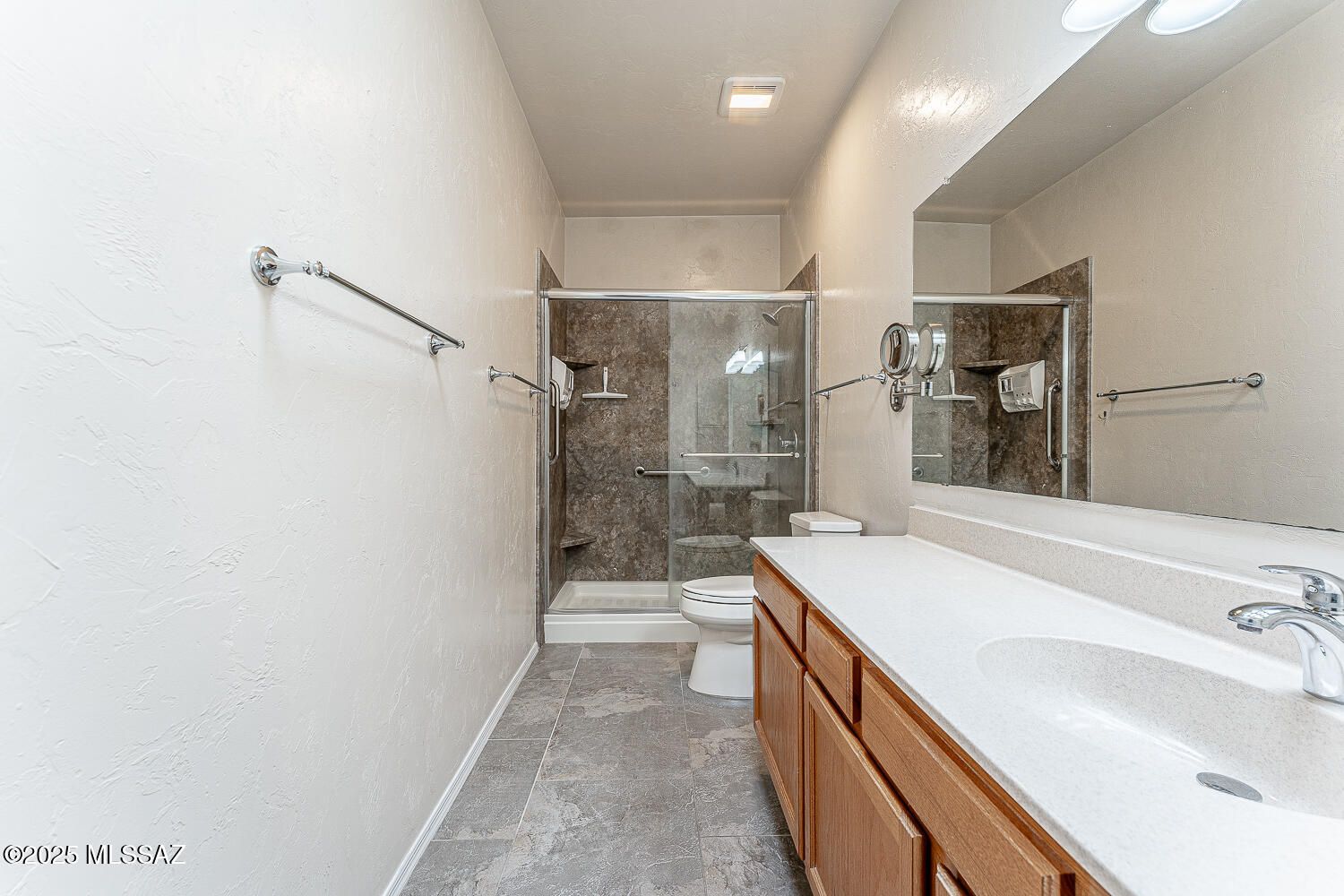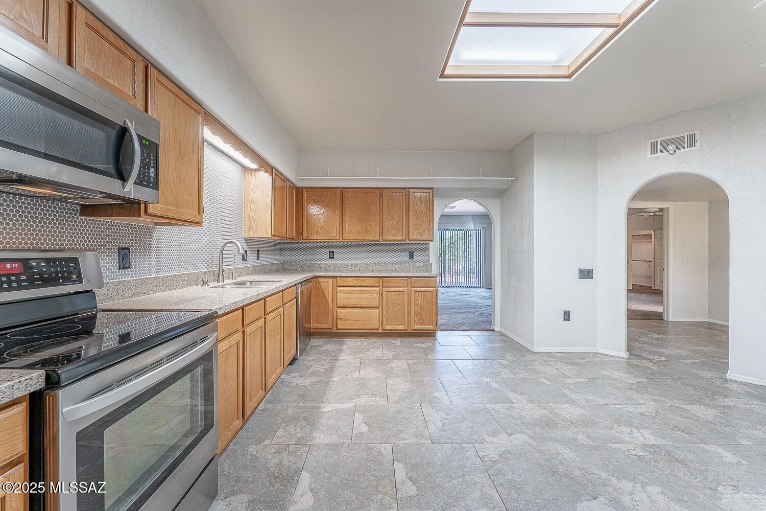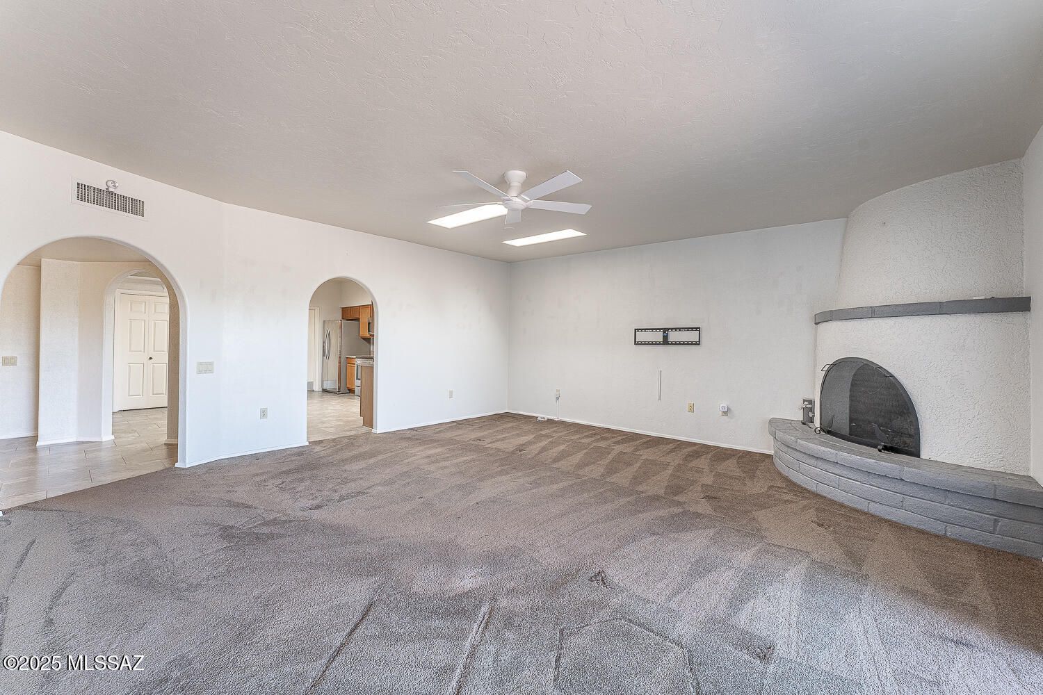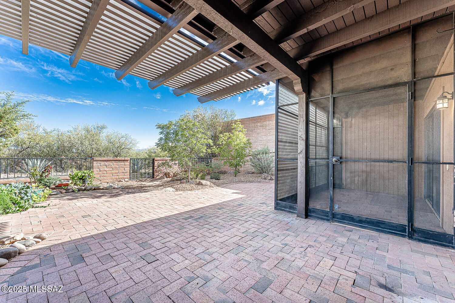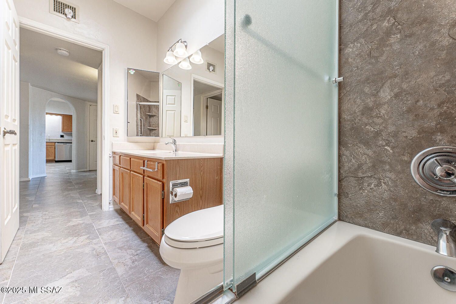 Beautifully updated home with newer tile and carpet, a spacious eat-in kitchen with quartz countertops, abundant cabinets and newer stainless appliances. Classic archways add charm throughout. Enjoy a very private backyard with pergola and lovely Santa Rita Mountain views. The generous primary suite features an updated bath with walk-in shower; a comfortable guest suite adjoins the hall bath with soaking tub. Owned solar, 2016 HVAC and access to a 5+ mile neighborhood trail enhance the easy Green Valley lifestyle.