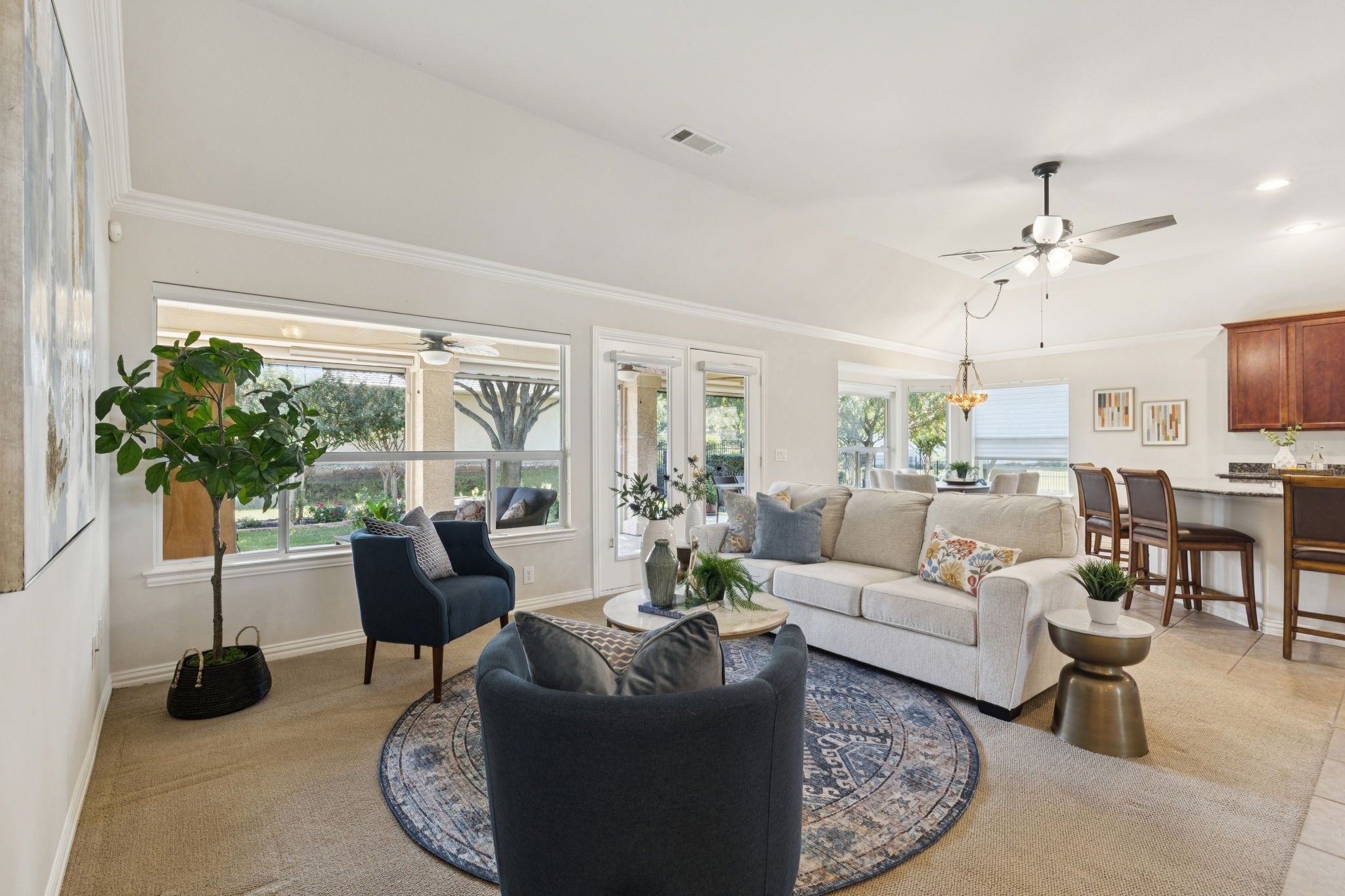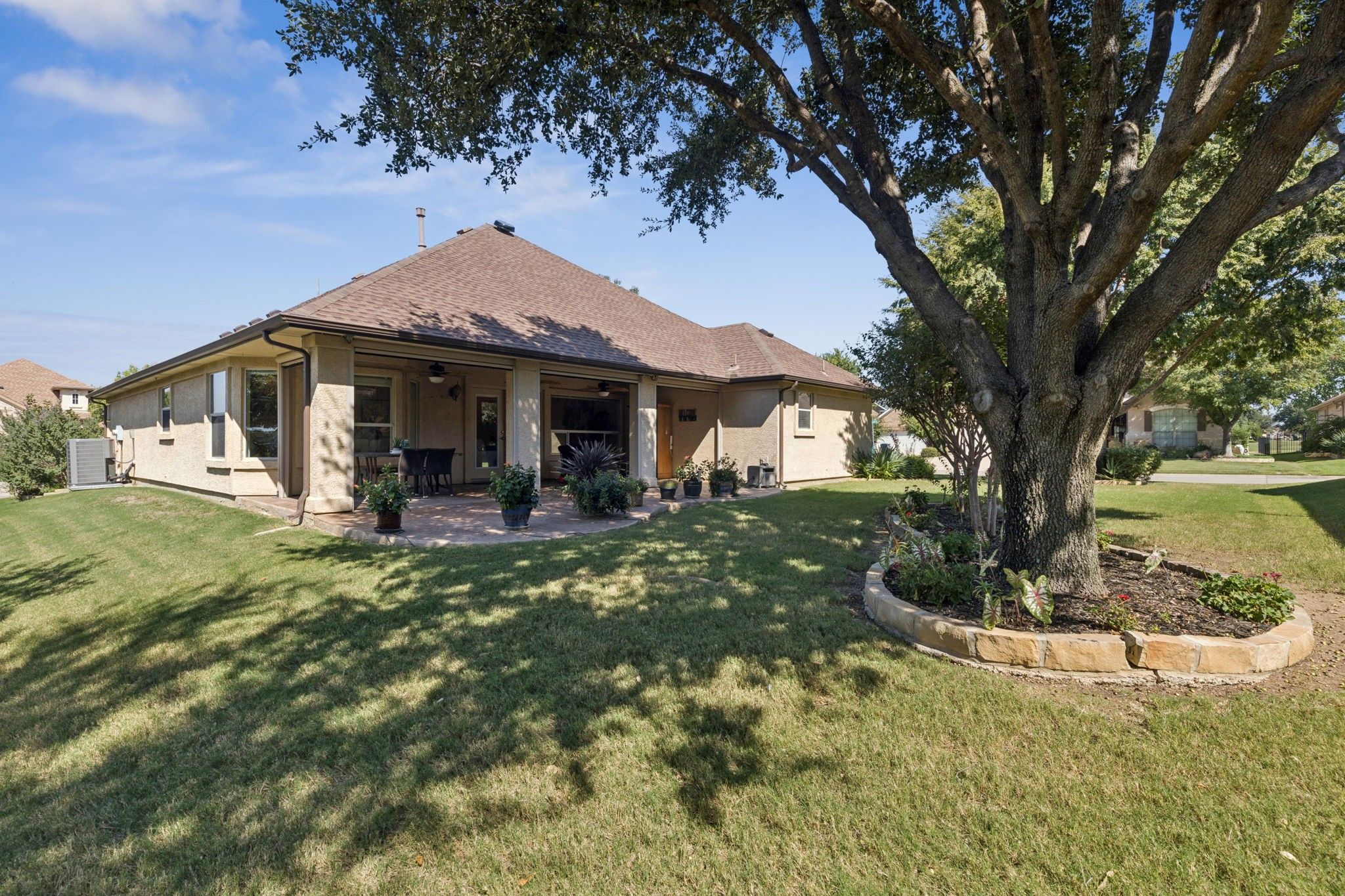 ***Motivated Sellers*** Nestled in a beautifully landscaped setting and shaded by mature trees, this well-maintained single-story home offers comfort, style, and space in the vibrant 55+ active adult community of Robson Ranch. Step inside to an open floorplan filled with natural sunlight, creating a warm and inviting atmosphere throughout. The eat-in kitchen is a chef’s dream, featuring granite countertops, stainless steel appliances, an oversized island, and abundant cabinet space for all your storage needs. It flows seamlessly into the living and dining areas, perfect for both entertaining and everyday living. Retreat to the spacious primary suite, complete with a large walk-in closet, dual sinks, and a built-in vanity—your private sanctuary after a long day of golfing and activities. The bonus room has beautiful French doors that can be used as an office, flex space or another living area. Both bedrooms and the flex room have plantation shutters. Enjoy outdoor living year-round on the oversized covered back patio with motorized screens. You are surrounded by lush greenery and shade, ideal for relaxing or hosting guests. This extended Augusta floor plan includes an extra 3 feet on one side of the house allowing for larger bedrooms and closets, which most plans do not offer. Water heater replaced in 2025, HVAC replaced in 2023 and all kitchen appliances replaced in 2020. Robson Ranch offers a wide array of amenities including championship golf course, restaurant, clubhouse, fitness center, multiple pools, creative arts center, walking paths, pickleball courts, dog park, too many more to mention, They offer 100+ clubs and activities so there is something for everyone. You can be as busy or as relaxed as you choose so every day feels like a holiday.