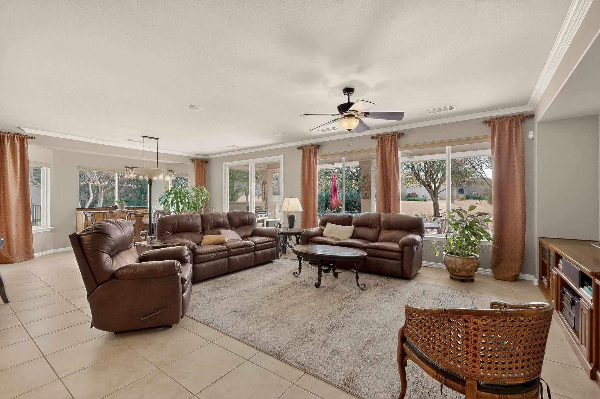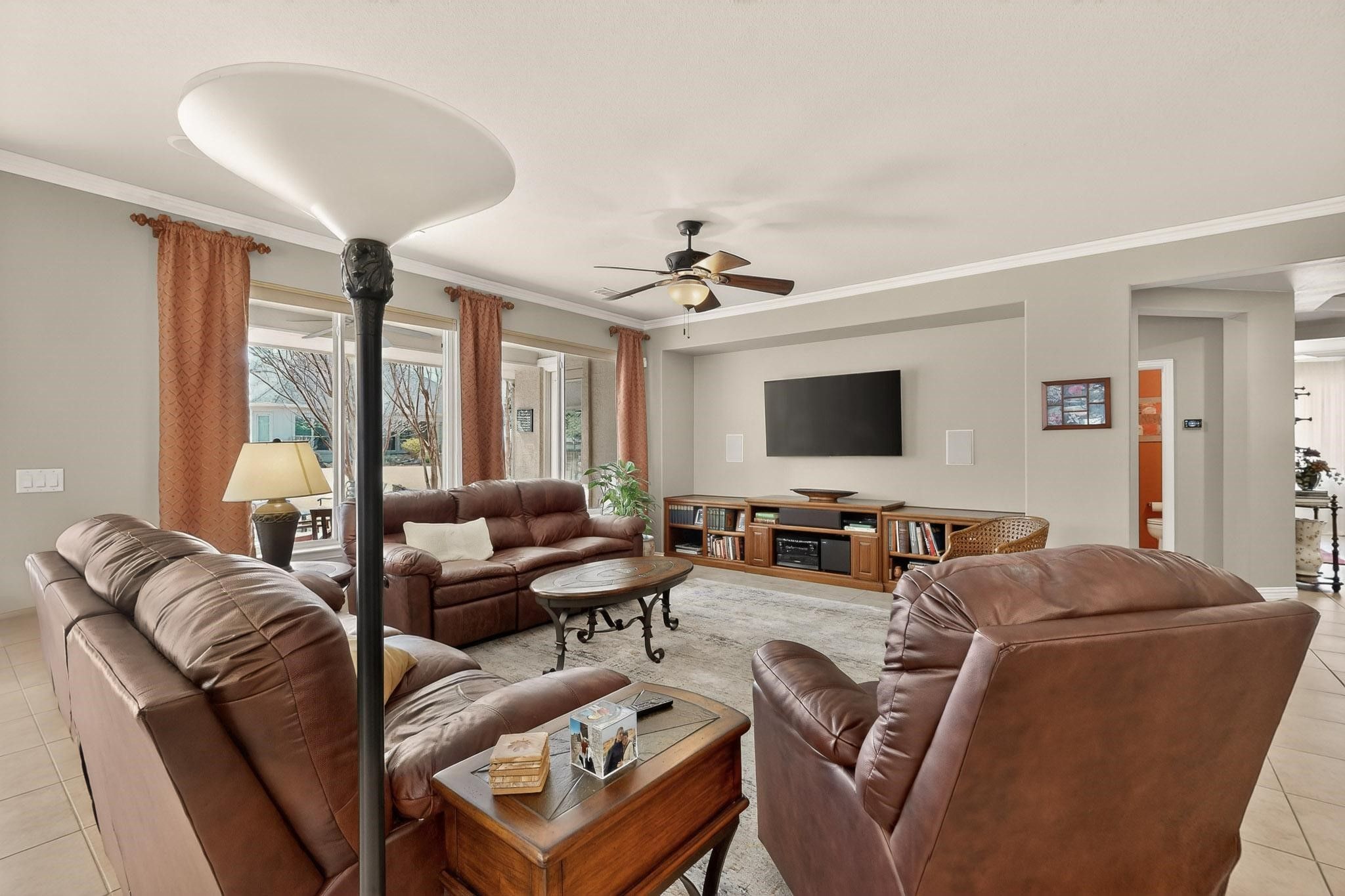 Well-maintained Talavera model home. Surrounded by flowering trees and shrubs. The open floor plan is perfect for family and friends to gather. The living room has a built-in media cabinet, crown molding, large daylight windows, a fan, and surround sound. The spacious cabinet-packed kitchen offers a large island with quartz counters, pendant lighting, seating, and lots of storage. There is plenty of counter space, subway tile backsplash, and a secretary desk area. Stainless steel appliances and a newer dishwasher and microwave. The bay window complements the dining area. The primary bedroom has a bay window, a side door to the patio, speakers, crown molding, and a fan. The luxurious bath offers a soaking tub, frameless shower door, framed mirror, and a medicine cabinet. The guest bedroom has a fan and plantation shutters. The office has a built-in desk with side shelves. The laundry has an upper and lower cabinet, a sink, and a built-in workstation. This home also offers a bonus room for a second office, hobby room, or extra storage space. The back yard has an extended patio with a stone seating wall. This home is very convenient to the amenity center and restaurant. Roof and gutters were replaced in 2017 with 40-year shingles. Water heater 2020. Small AC 2016. Large AC 2022. There is a 4 ft extension to the insulated garage, and has a side man door. The attic is floored and has a lift. Circulating pump and timer at the water heater. Come view this beauty today.