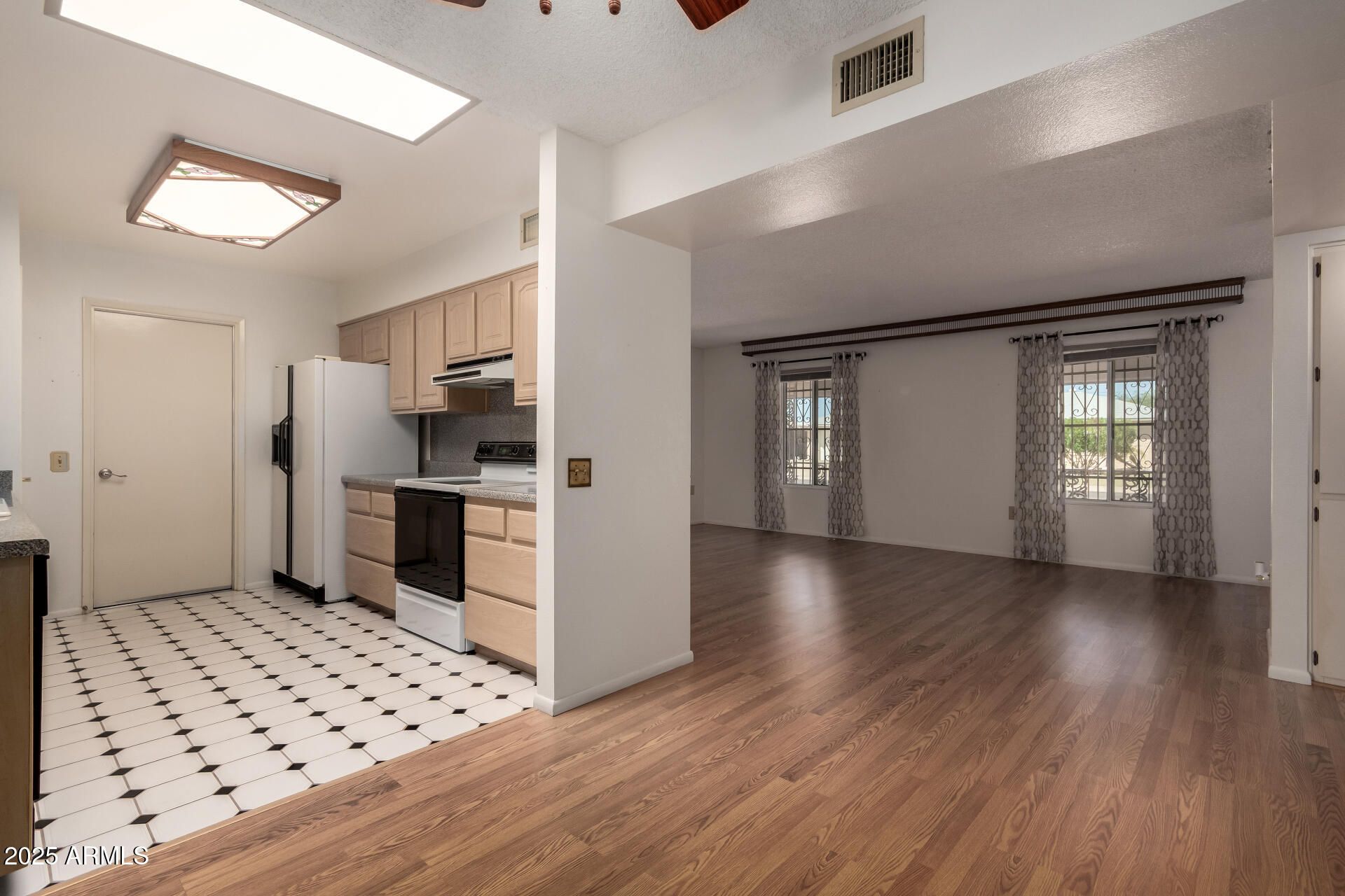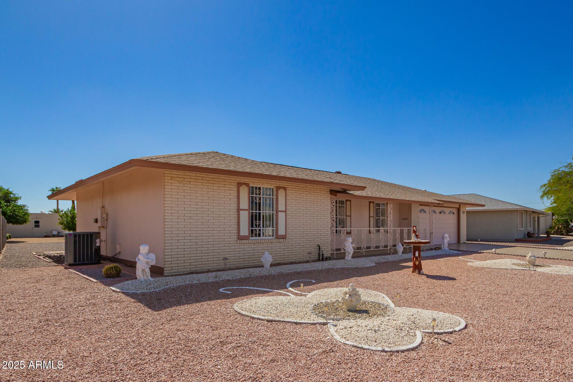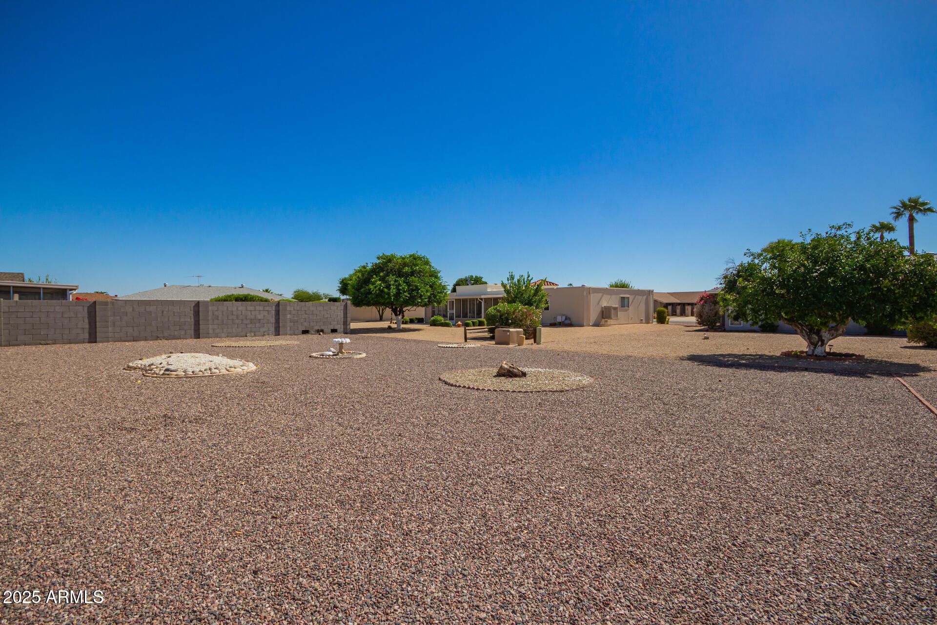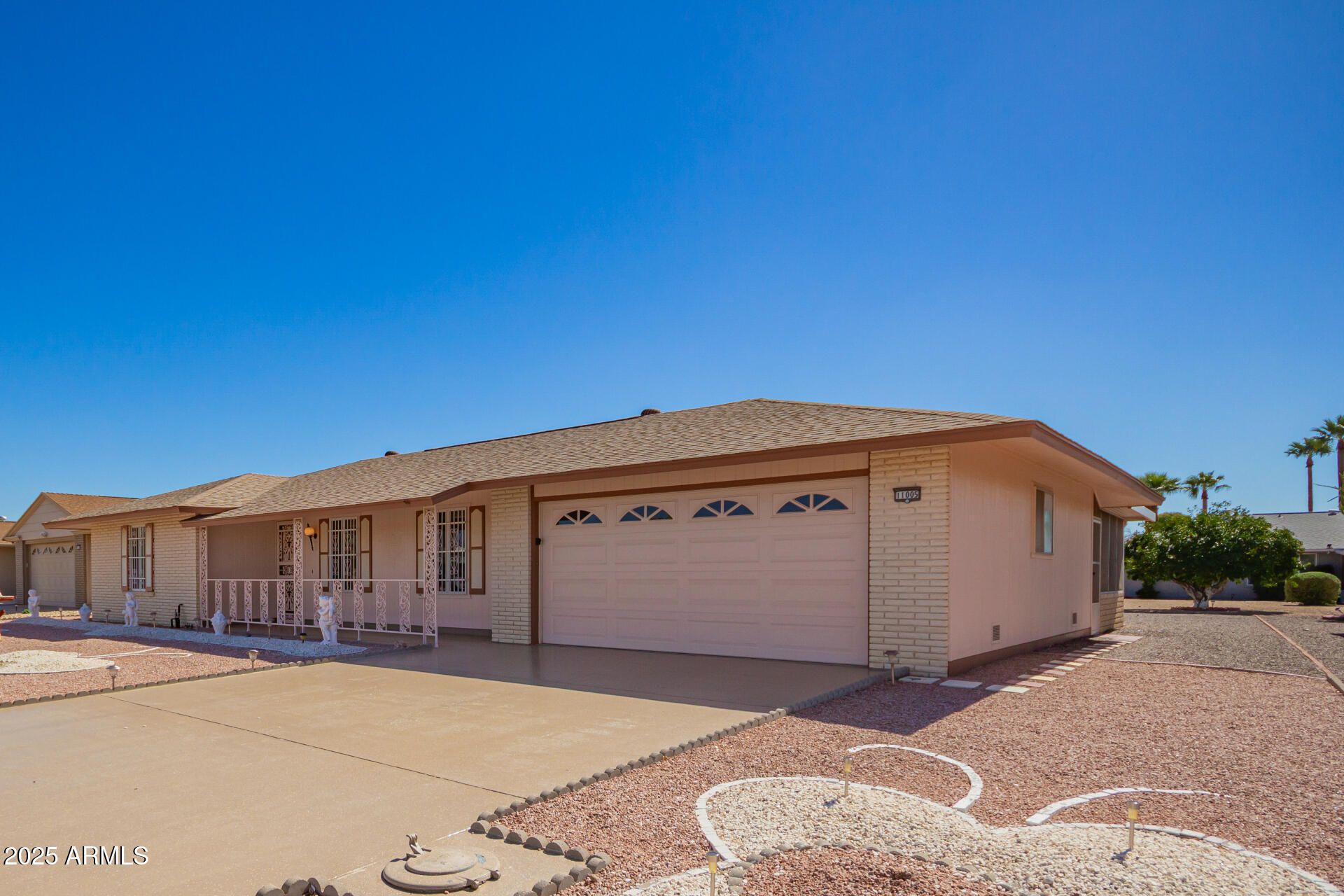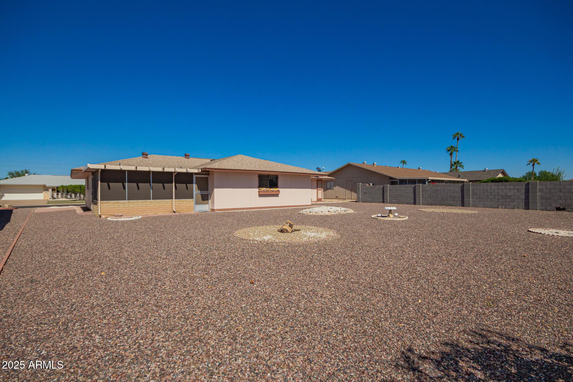 Discover the perfect blend of comfort and community living in this charming 2-bedroom, 2-bath home right in the heart of Sun City! From the moment you arrive, you'll love the inviting curb appeal with easy-care desert landscaping, a cozy front porch, and a spacious two-car garage with built-in storage and sink - ideal for your next project or hobby space. Inside, natural light fills the open living and dining area, creating a warm and welcoming atmosphere. The updated flooring and neutral palette make it easy to add your own personal touch. The kitchen is perfectly set up for everyday living, complete with ample cabinetry, counter space, and built-in appliances. When it's time to relax or entertain, head to the family room - a true highlight of this home! With rich wood paneling, a custom-built bar, and a comfortable seating nook, it's made for game nights, happy hours, or just unwinding with friends. The screened-in patio is your private retreat for enjoying the Arizona weather any time of year, while the spacious backyard gives you room to breathe, garden, or simply soak up the sunshine.