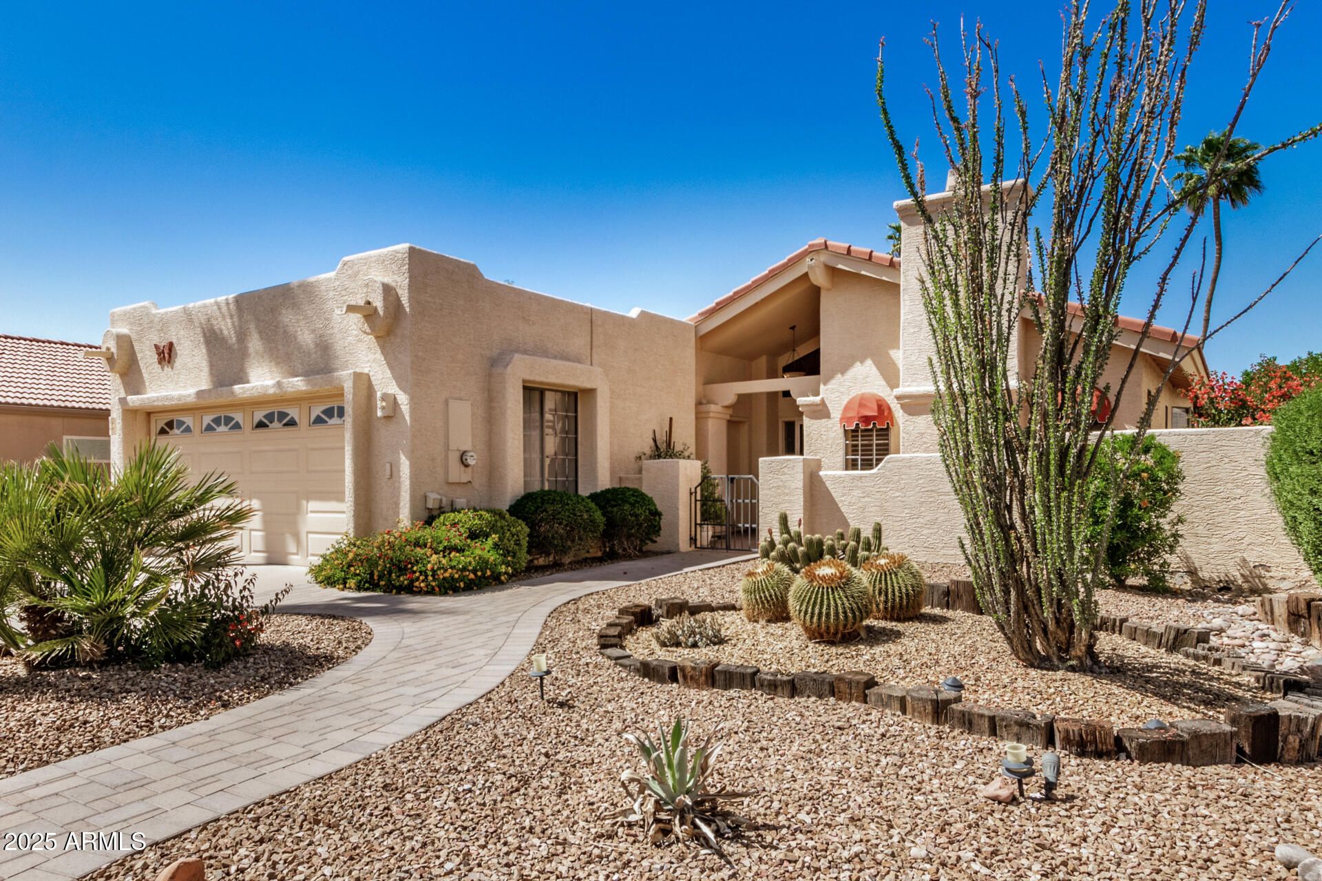 This lovely Cimarron floor plan is in the sought-after Palo Verde community on the golf course! The spacious entryway leads into a welcoming living room with a cozy fireplace, seamlessly connected to the formal dining room. The kitchen boasts granite countertops, an eat-in dining area, and ample cabinetry. Enjoy privacy from the living and dining rooms while still maintaining a connection through a window opening with a wet bar—perfect for entertaining! The primary bedroom features two walk-in closets, a full bathroom with double sinks, and direct access to the covered patio. A large guest bedroom and bath provide a comfortable retreat. Extended two-car garage. Relax on the covered patio with your favorite beverage enjoying the stunning golf course and water views. A MUST SEE.