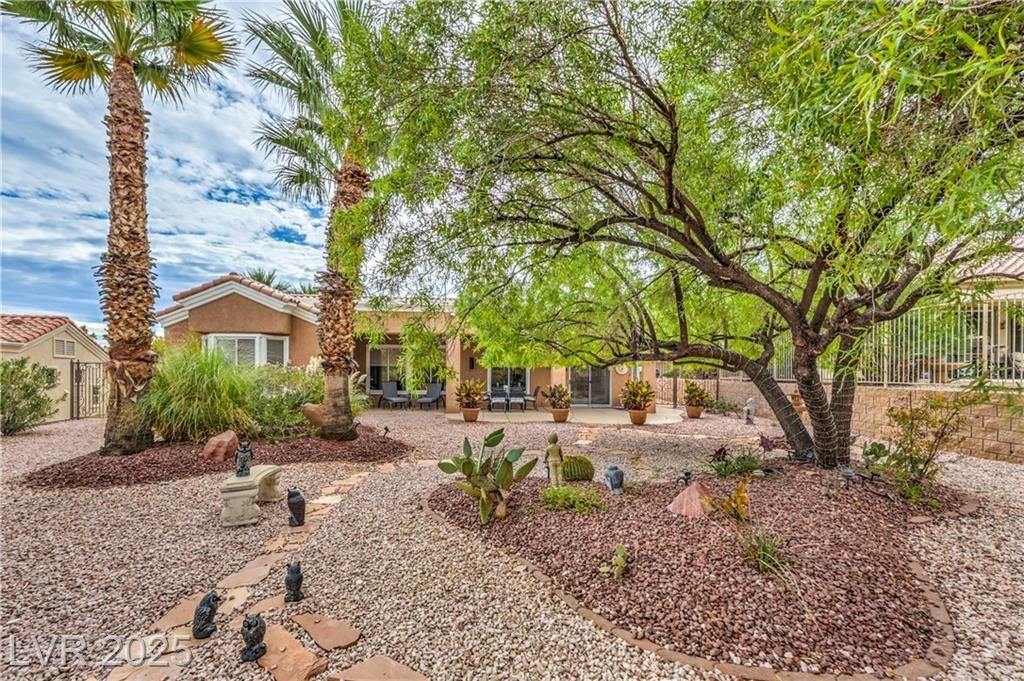 This Summerlin single family home in Sun City boasts an eye-catching exterior that it situated on a large lot of more than 10,000 square feet. Versailles is a plan that offers considerable comfort and luxury. This highly sought-after floor plan (that’s been well maintained and includes a home warranty) is characterized by a spacious interior layout, containing two spacious bedrooms and a study area. Updated features of this house include a modern walk-in shower, the garage has been finished and the floor sealed and is spacious, and a covered patio that looks out onto a yard landscaped. Beautiful gardens can be both front and back yard enhancements. Situated in the Summerlin area, Sun City Summerlin is a 55+ community which features immaculately manicured grounds, diverse social activities, a highly regarded golf course and easy access to the Summerlin Parkway, casinos, restaurants, leisure activities and medical centers nearby.