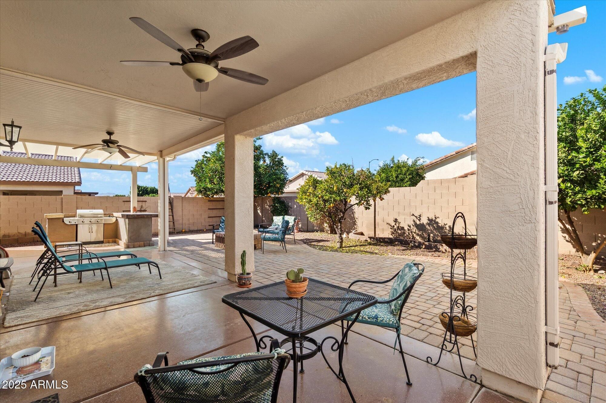 Welcome to Active Adult Living in Desirable Ventana Lakes! Discover the perfect blend of comfort and community in this charming single-level home, nestled in the heart of the sought-after Ventana Lakes neighborhood. This well-maintained property offers a serene retreat with a host of amenities designed for an active 55+ lifestyle. 1,707 sq. ft. of living space, designed with a functional, open great room floor plan and no interior steps. 2 spacious bedrooms plus a separate den/office with Murphy bed, and 2 bathrooms, including a master suite with a 3/4 bath, double vanity, and walk-in closet. An open, eat-in kitchen perfect for entertaining, featuring a large center island, breakfast bar, granite countertops, and modern appliances. Enjoy neutral diagonal tile and carpet flooring, ceiling fans, dual-pane windows with sunscreens, and a cozy gas fireplace in the family room. Step outside to a low-maintenance backyard oasis featuring a covered patio (extended with pavers), a built-in BBQ grill/island, and a gas fire pit. The home also includes an RV gate and a 2-car garage with an epoxy-finished floor. You'll also have access to an impressive array of resort-style amenities. Nine beautiful lakes with opportunities for fishing, access to community pools (heated), a community spa, a fitness center, and a clubhouse/rec room. Tennis courts, racquetball courts, bocce ball, pickleball, and scenic biking/walking paths. Conveniently located near shopping, dining, and local attractions, this home provides an incredible opportunity to embrace the vibrant Sun City active adult lifestyle.