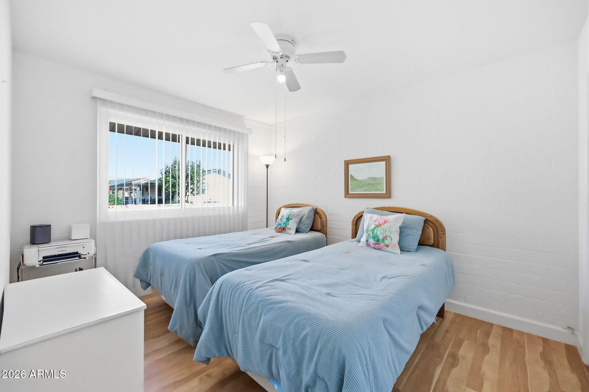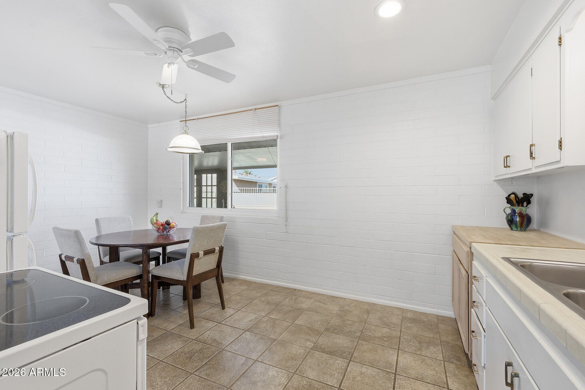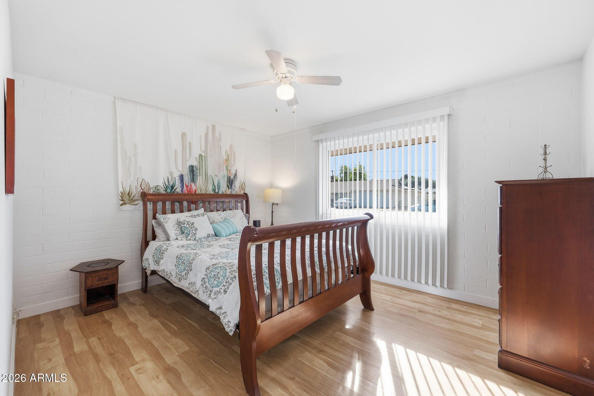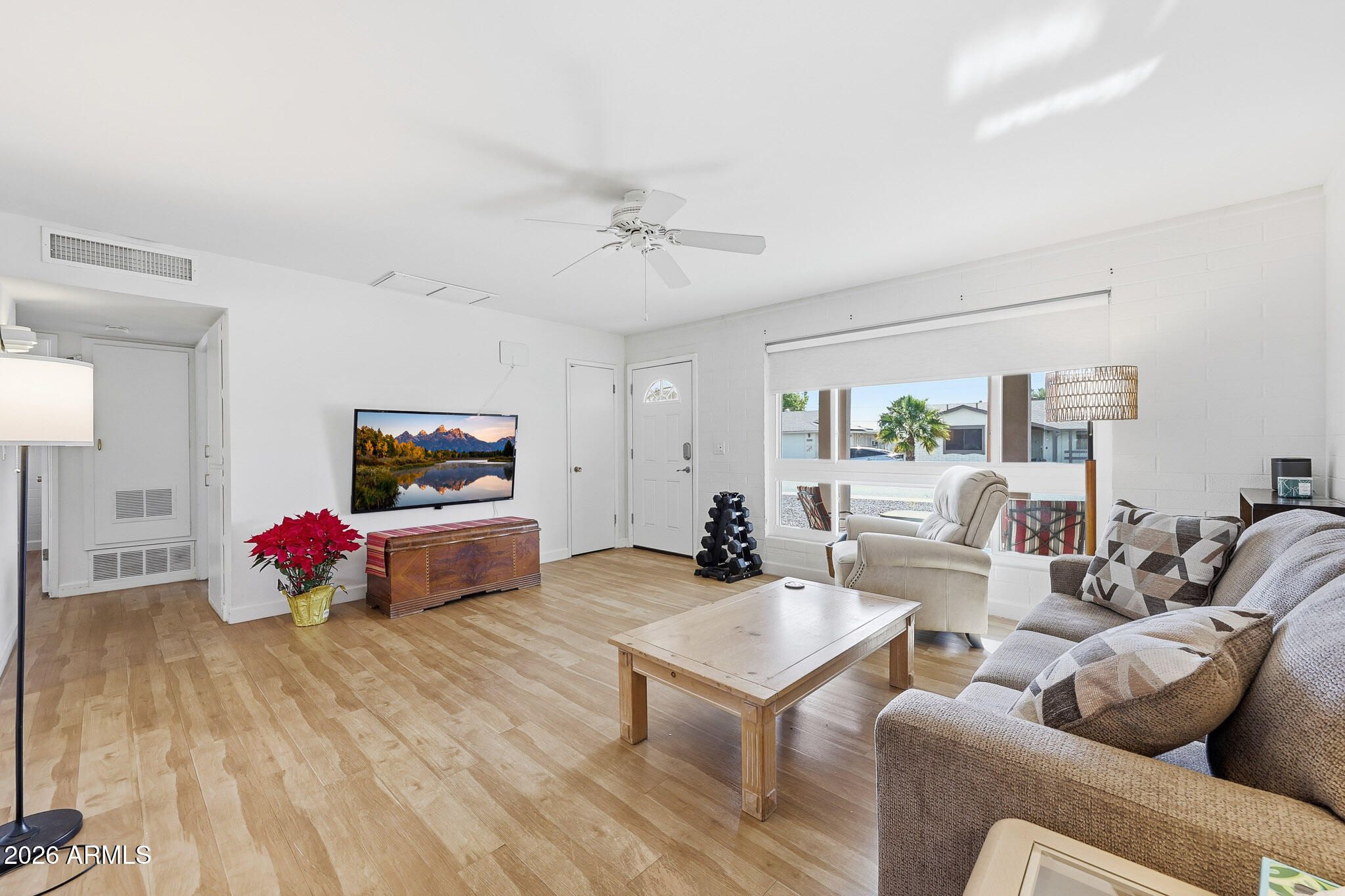 Well-maintained 2-bedroom, 1-bath home located in Sun City's desirable age-restricted community on a large corner lot. This clean, move-in ready property features dual-pane windows, ceiling fans in every room, no popcorn ceilings, gas heat, and a front security door. The fully fenced backyard offers privacy and low-maintenance enjoyment. Major updates include a new roof and A/C in 2017 and sewer line replacement in 2020—big ticket items already done. Comfortable, efficient, and priced to sell, this home is an excellent opportunity to enjoy the Sun City lifestyle.