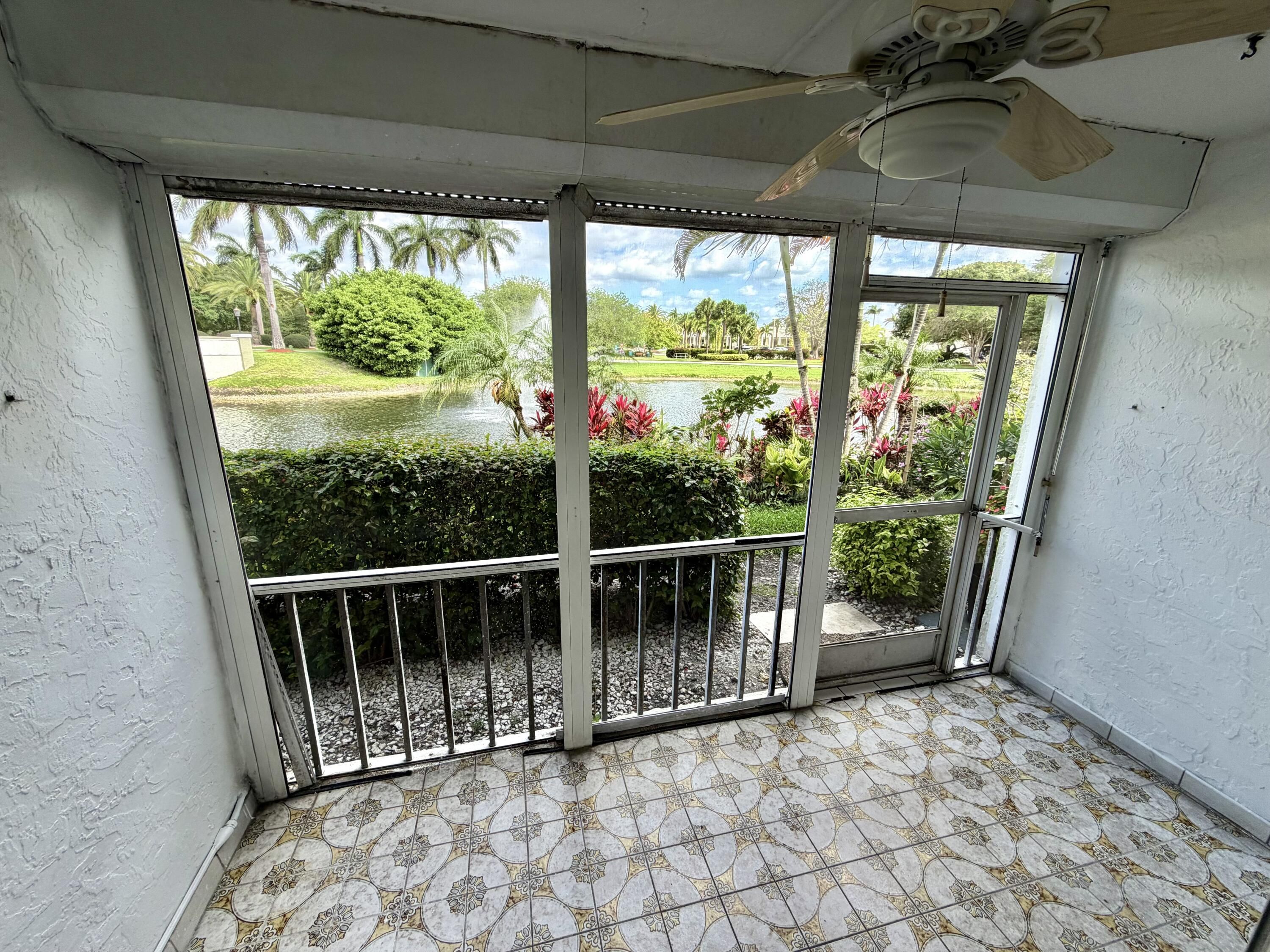 Corner Unit first-floor 3-bed, 2-bath residence offering breathtaking panoramic lake, and fountain views with ideal north/south exposure. Perfectly positioned near the gated entrance with convenient access to I95 & Turnpike, this unique unit combines privacy, accessibility, and stunning scenery in one exceptional package. Step inside to find all-tile flooring, a recently painted interior, creating a clean, modern feel that's ready for immediate occupancy. Enjoy the ease of first-floor living with parking directly in front of the building—no elevators or long walks required. This home is built for both comfort and peace of mind, featuring accordion hurricane shutters and a premium corner location that maximizes natural light and views. Located in a guard-gated, resort-style community, residents enjoy an active lifestyle with top-tier amenities including a golf course, tennis, pools, fitness center, theater, on-site restaurant, and community bus service, along with convenient access to shopping, dining, hospitals, and major expressways. Water and basic cable are included.