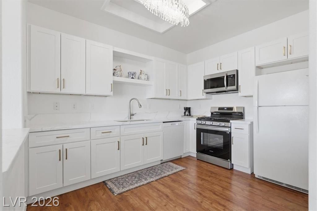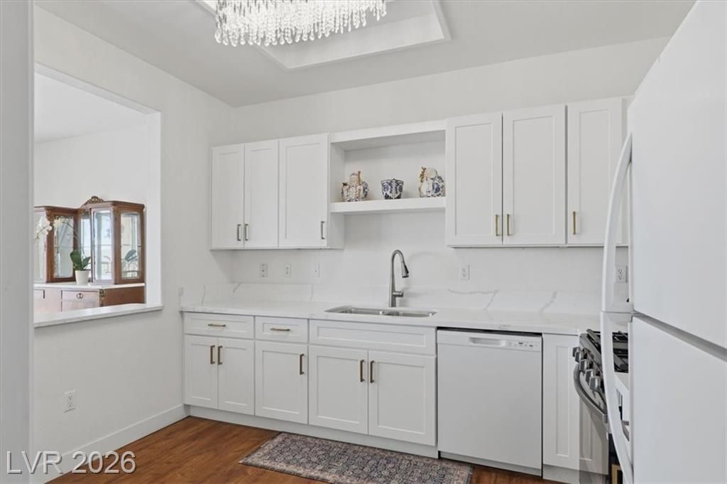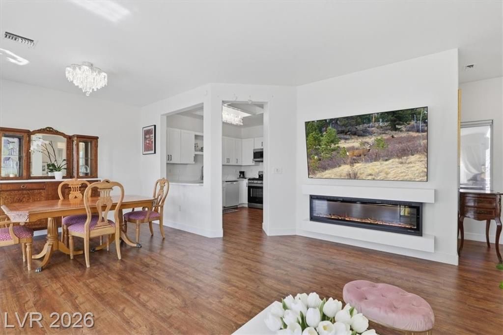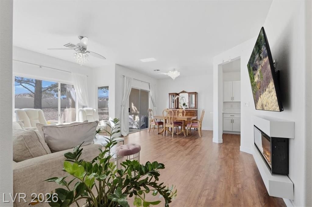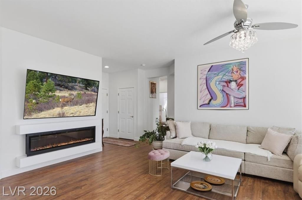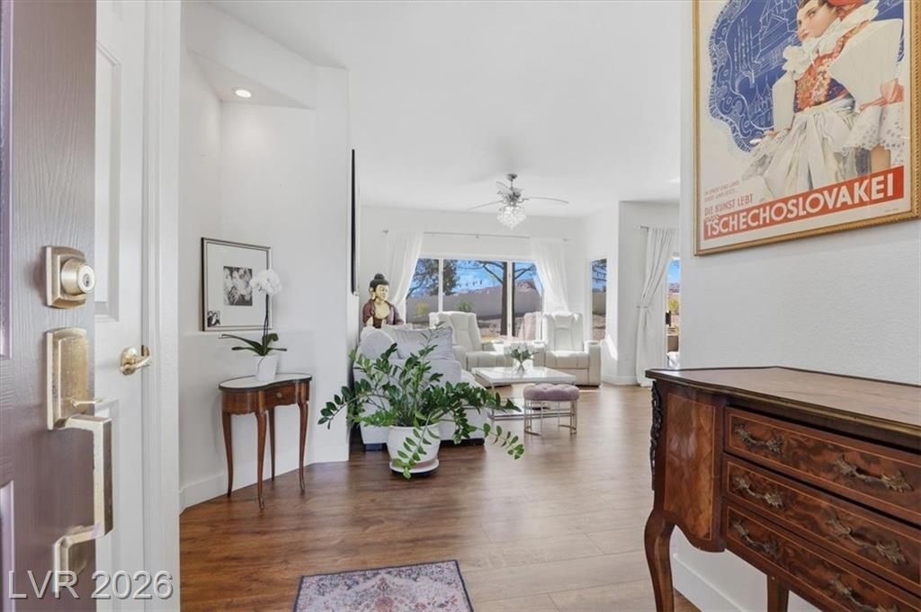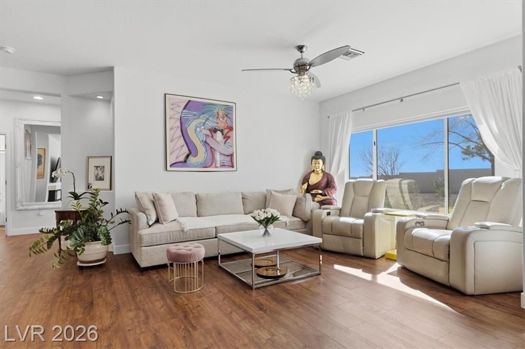 Welcome home to the Warwick model, a single story townhome on a cul de sac providing tons of privacy with the beautiful mature treelined streets of Sun City Summerlin! This home boasts an open concept with lots of natural lighting, a den, warm luxury vinyl flooring & fresh paint throughout, LED fireplace with multiple settings, Chandeliers in dining room & kitchen, updated lighting fixtures throughout, & private courtyard in the front & back w/mountain views. Kitchen has been remodeled with brand new shaker cabinetry, gold hardware, quartz countertops, Stainless steel stove & microwave & pantry. Primary suite is separate from other bedroom w/ walk-in closet & spacious bath w/ walk-in shower. Sun City offers an active 55+ lifestyle w/ a social calendar, multiple club houses, pools & spas, fitness centers, pickleball courts, tennis courts & golfing! Property is low maintenance & move in ready! Don't wait to schedule your private tour of this property as it wont last long!