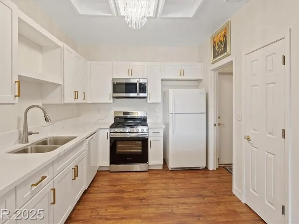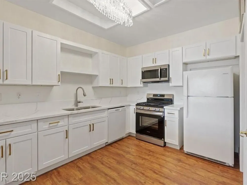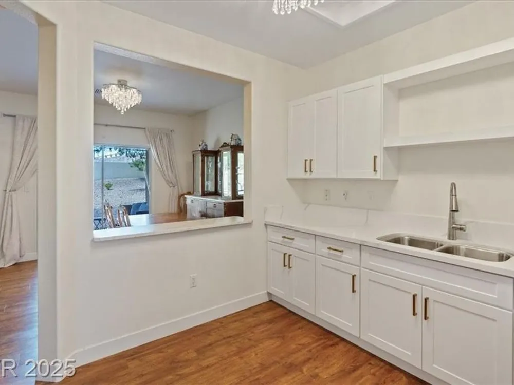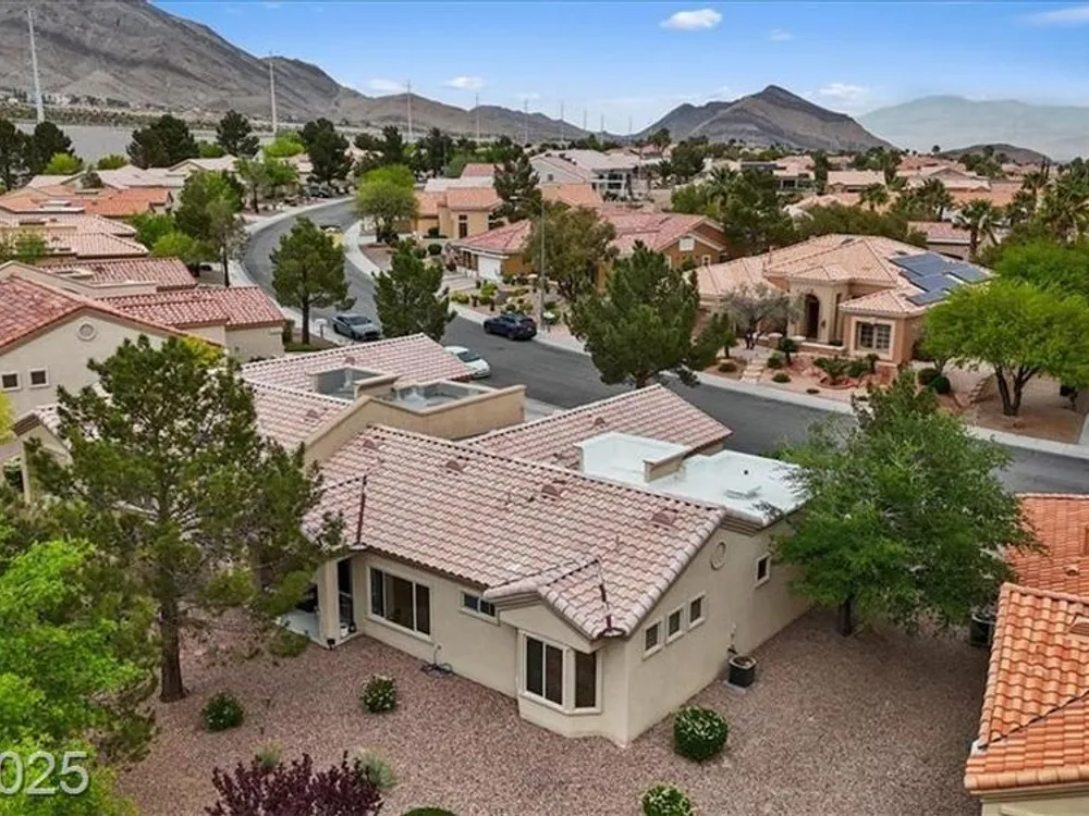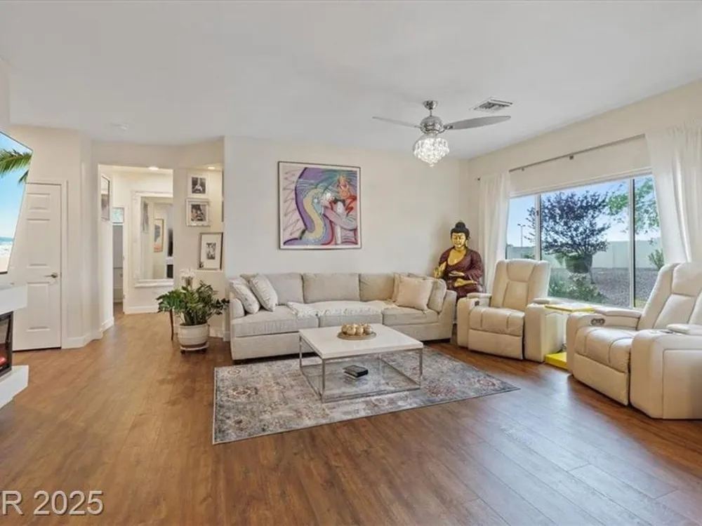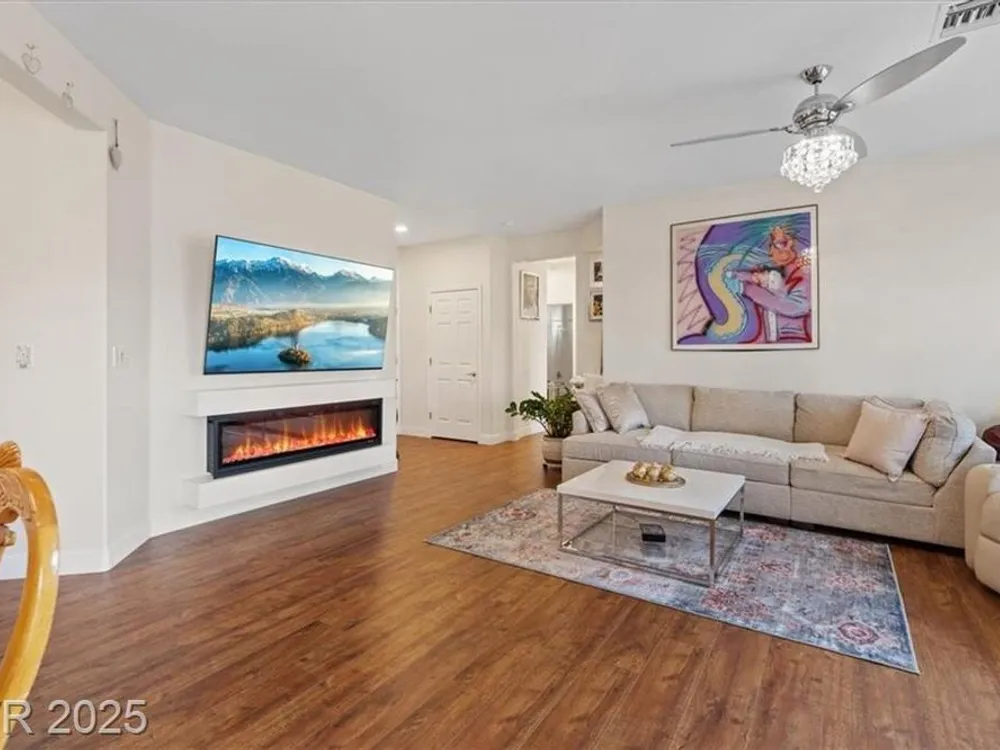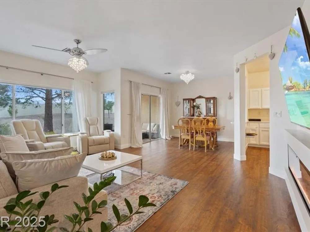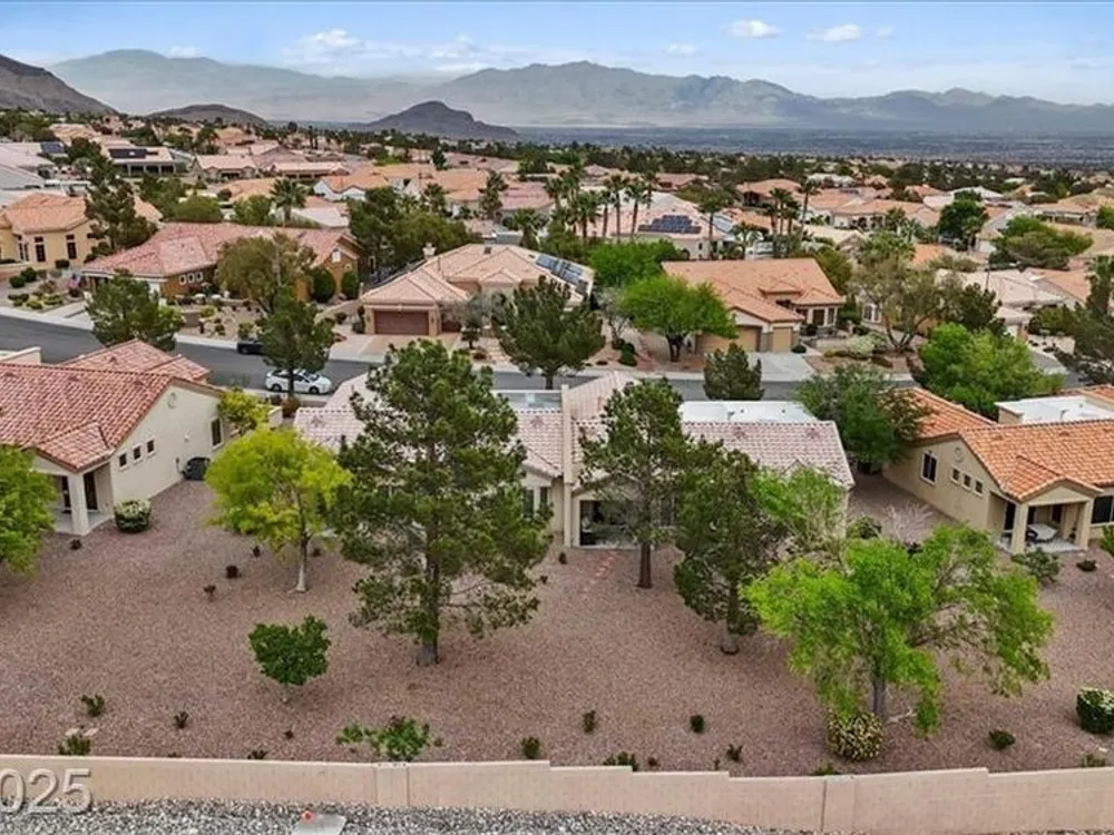 Discover privacy and charm in this 2-bedroom, 2-bath townhouse, ideally positioned at the top of Sun City Summerlin. With no rear neighbors and backing to open space, this home offers mountain views and a quiet retreat, set well away from the community wall. Brand new kitchen cabinets & countertops just installed. Includes 3 mounted TVs and $4,000 in chandeliers. The great room features a newly added electric LED fireplace for a cozy vibe. Stylish upgrades include new wood-look LVP flooring, sleek white cordless window shades, and an EV hookup in the garage.This premier 55+ community provides access to 4 fitness centers, 3 golf courses, and abundant recreational options like Pickle Ball, Bocce Ball, Tennis, and more! The HOA includes roof maintenance, exterior painting, and front landscaping.Don’t miss this opportunity to own a beautifully updated home in one of Las Vegas’s most desirable active adult communities!