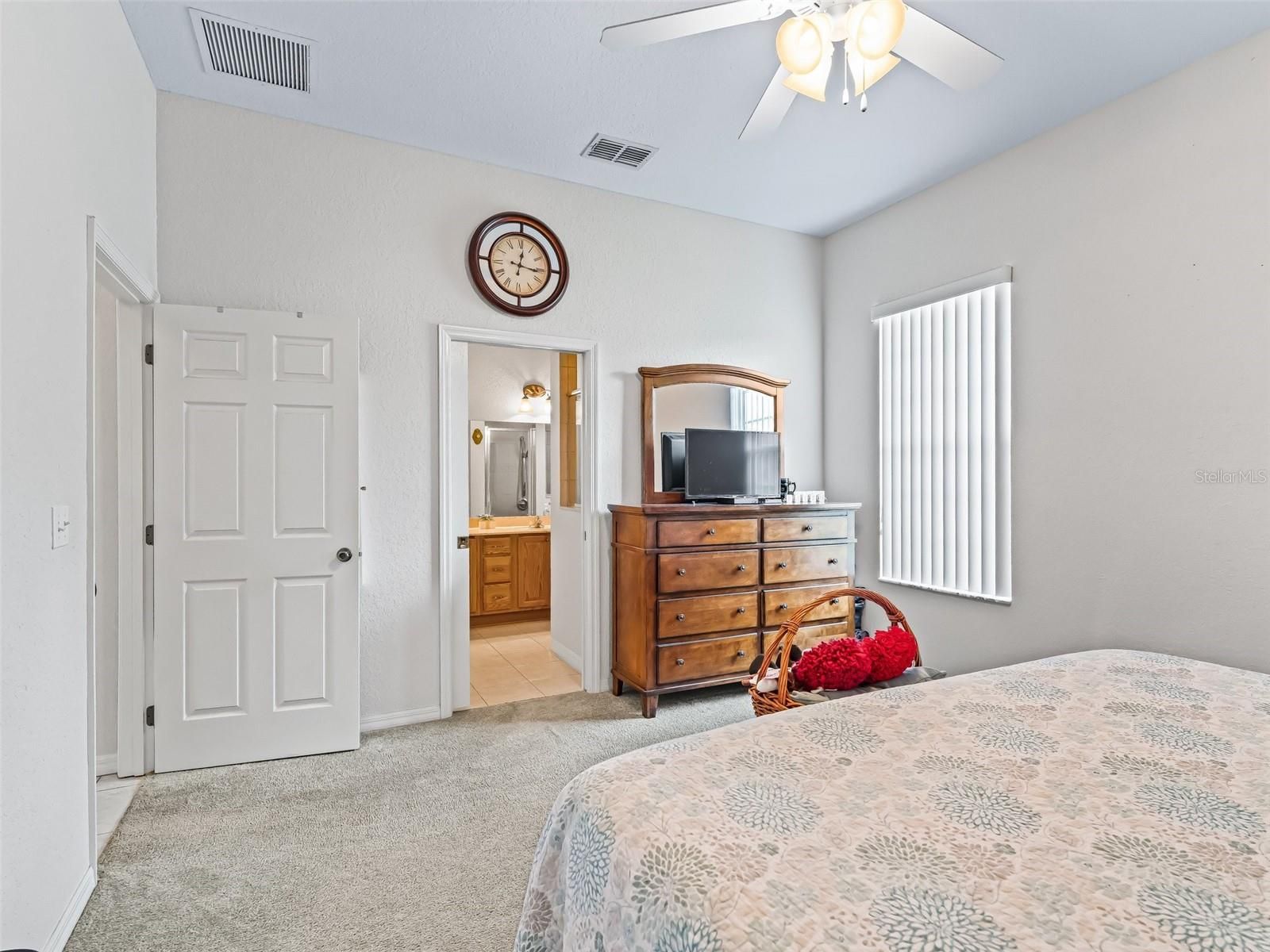 - Ceiling Fan(s), Eat-in Kitchen, High Ceilings, Living/Dining Room, Open Floorplan, Main Level Primary, Solid-Wood Cabinets, Split Bedrooms, Thermostat, Walk-In Closet(s)