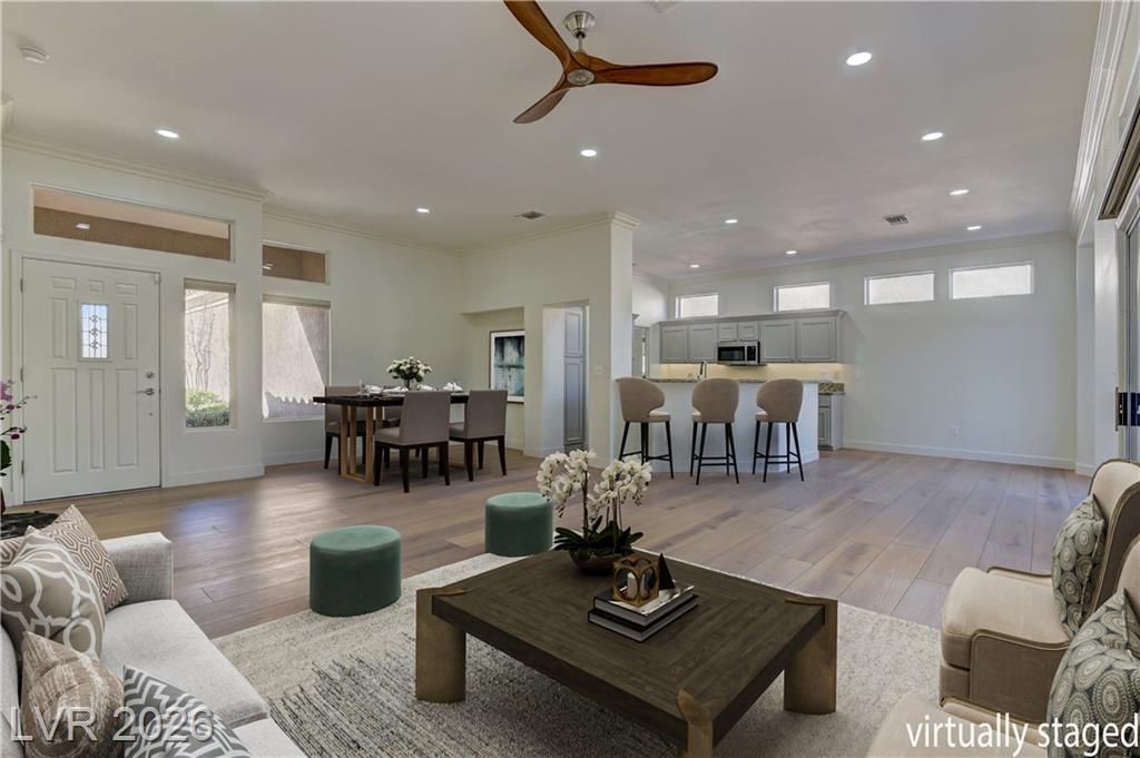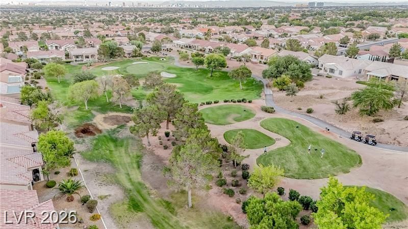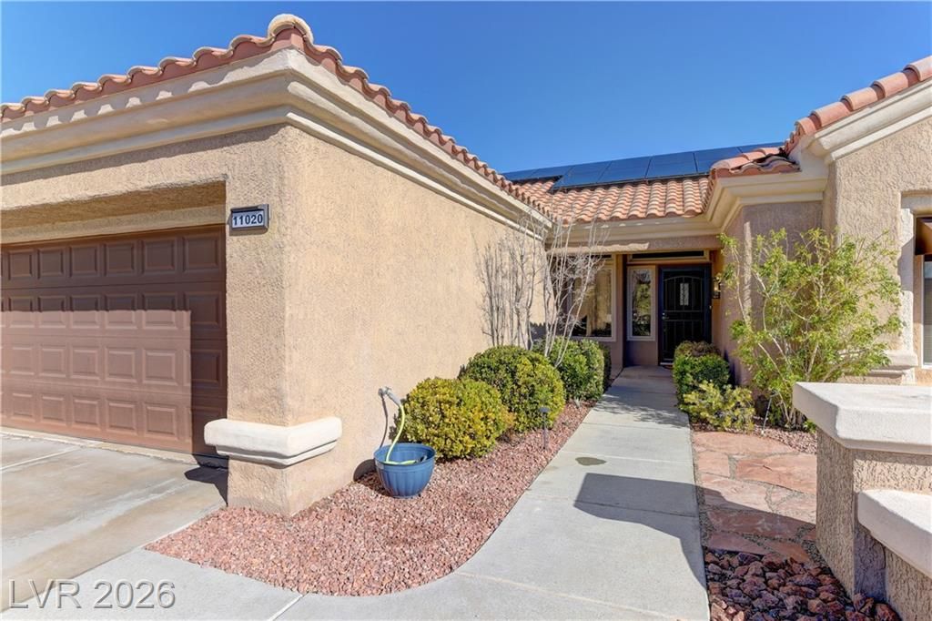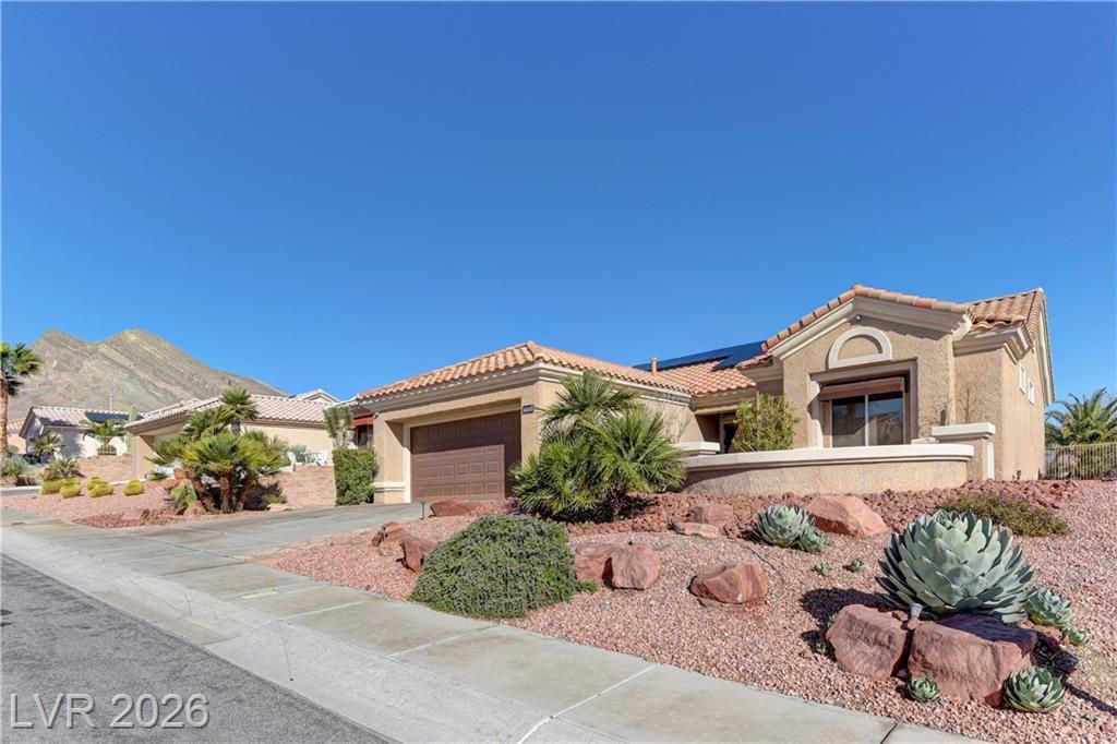 Move-in ready and thoughtfully upgraded, this home features owner-owned solar for energy savings! Interior updates include LVP Plank flooring, upgraded baseboards, LED recessed lighting, and designer ceiling fans. The refreshed kitchen offers updated cabinetry, granite countertops, and LG stainless steel appliances, including a double-oven gas range, dishwasher, microwave oven and counter-depth refrigerator. Both bathrooms feature matching cabinetry, granite countertops, and LED lighting. Laundry room features new utility sink, LG WashTower and storage. Major updates include a newer HVAC system and water heater (2022), plus a smart thermostat and water treatment system. Enjoy Strip views from the front patio and Red Rock mountain views from the oversized rear patio. The epoxy-coated garage includes built-ins, overhead storage, & a 50-amp EV outlet. Located in a premier 55+ golf community with extensive amenities.