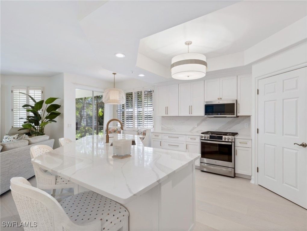 This is a must see tropical retreat in the prestigious Gulf Harbour Yacht & Country Club. A carriage home, first floor condo. Enjoy the open floor plan with a newly renovated coastal feel. The home includes wide-plank wood floors, white kitchen cabinetry & Bathroom vanities, stylish quartz countertop and backsplash, gorgeous lighting, and freshly painted walls and trim. The kitchen has a large island, breakfast nook/seating area, walk in pantry, and new stainless steel appliances including a gas range. Along with the kitchen the dining area and family room are open for entertaining family and friends. Master bedroom and spa like ensuite bathroom with walk in closet are large and include updated walk in shower and dual sinks. Two guest bedrooms have new luxury carpet and walk in closets. The spacious lanai with new no see um screen and ceiling fans is quiet and over looks the lush Florida green landscape. Spacious 2 stall garage with adequate room for storage and recently painted epoxy floor, newly installed life-time warranty garage door opener and new hot water heater. All electrical outlets and switch plates are upgraded. When away from home, enjoy the peace of mind with the ring technology to monitor your entry doors and the Nest thermostat to track your indoor air climate. Enjoy the Florida lifestyle and amenities including clubhouse, Fitness & Spa center, Tennis courts, 18 Hole Championship Golf course, Marina and so much more! Club membership available for purchase but not mandatory. Membership is required to use amenities. In addition, the Association pool is steps away from the condo. Enjoy the worry free benefits of condo living. While enjoying your free time all landscaping and building exterior are well maintained.The property is located within close proximity to Fort Myers Beach, Sanibel Island, Shopping, Fine Dining, Sports Bars, and nightlife of downtown Fort Myers. Come and take a lok at this move in ready resort like property! Club renovation has begun please see attached information and photos!