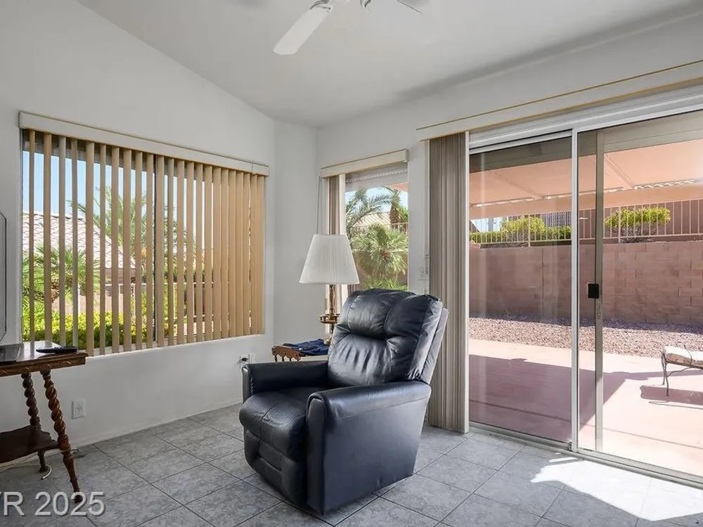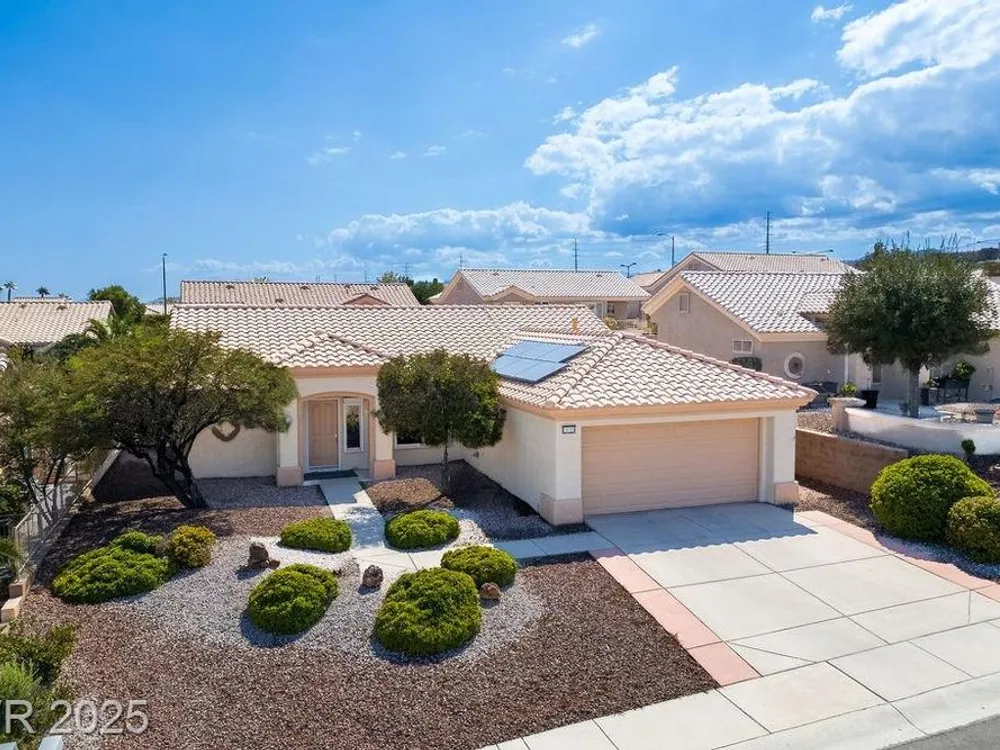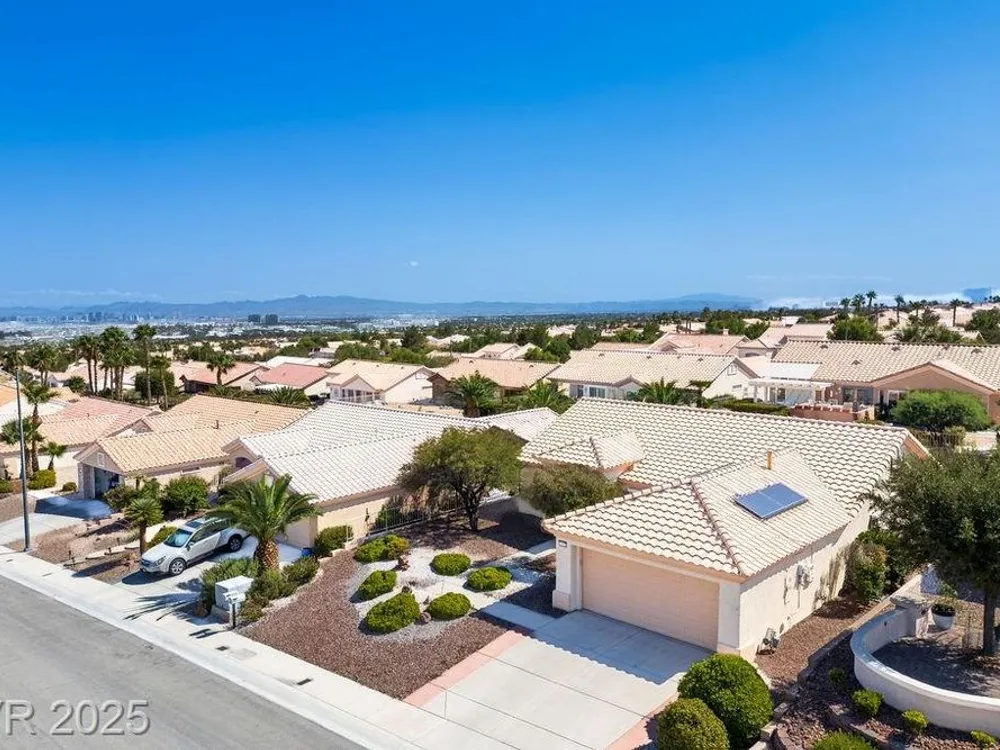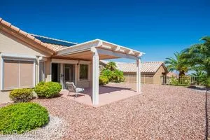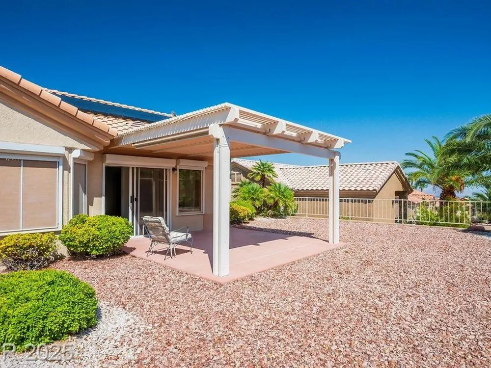 Beautifully expanded Reno model with 1,502 sq. ft. of living space per Assessor’s page. The 102 sq. ft. addition creates a versatile flex area, perfect for an office or retreat. Enjoy an open layout with seamless flow between living and dining rooms, ideal for relaxed living and entertaining. Bedrooms and baths on opposite sides provide exceptional privacy. The well-appointed kitchen opens to a sunny bay-window nook, while the spacious primary ensuite offers its own bay window, walk-in closet, and shower. Solar panels help lower energy costs. Relax in the low-maintenance backyard with desert landscaping and an adjustable Alumawood slat patio cover. A 2-car garage includes built-in storage and laundry area. Located in Sun City Summerlin, a premier 55+ community with golf, pools, fitness, clubs, and activities, all near Downtown Summerlin’s dining, shopping, and sports venues.