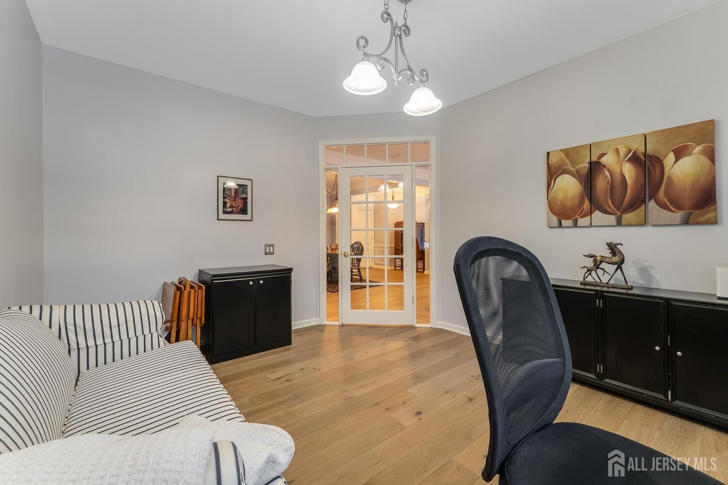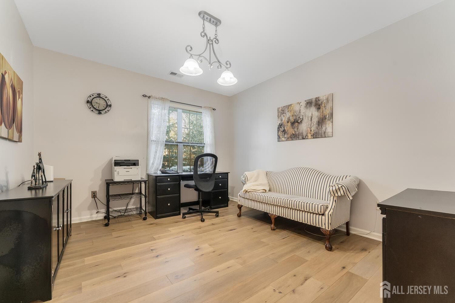 Located in Somerset Run, a Del Webb 55+ Community. Live your best life in this gated community with a 25,000 SF club house, indoor and out-door pools, fitness center, billiards room, arts-n-crafts room, club rooms, tennis+ more. First floor Amber model offers highly desirable one floor living with a thoughtfully designed 1731 SF layout that feels open and elegant. Formal living and dining rooms, a private library with French door entry, two bedrooms, two full bathrooms, a laundry room, and a storage room provide comfortable, easy-care living. A complete 2020 renovation of the kitchen and both bathrooms gives this condo a modern reset, enhanced by custom mouldings and engineered hard-wood floors that flow seamlessly from the foyer into the main living areas and library. The eat-in kitchen features raised panel cabinetry, closet pantry, quartz countertops, a subway tile backsplash, stainless steel appliances by GE and Bosch, and a neutral ceramic tile floor for a timeless aesthetic. The open floor plan between the dining and living room creates an inviting space to relax or entertain, with slider access to a covered balcony that extends the living area outdoors. A tray ceiling highlights the primary bedroom with en suite bath. The beautifully updated bath features sconce lighting, dual stylish vanities with rectangular sinks set in quartz tops, oversized shower in subway tile surround with bench and grab bars, private water closet, mosaic tile floor, linen closet and large W/I closet. On the opposite end of the condo, the second bedroom provides privacy, generous closet space, and neutral carpet. The updated hall bath with sconce lighting, quartz top vanity, wall cabinet, tub-shower, linen closet and ceramic tile floor. The laundry room is well equipped with built-in cabinetry, utility sink + washer and dryer. Ideally positioned moments from markets, eateries, pharmacies, banks and everyday conveniences.all within a stone's throw. Additionally: Updated Lighting Throughout; Ceiling Fans in BRs and Living Room; HWH 2024; Storage Closet on Balcony + Large Temperature Controlled Storage Room in Hall; 1 Parking Space in secured and lighted underground parking garage with elevator to condo. Minutes to Rt. 287 and all major roads, shopping mall, trains and bus to NYC. Nearby New Brunswick's fine dining, theatre, hospitals, golf and Colonial Park.