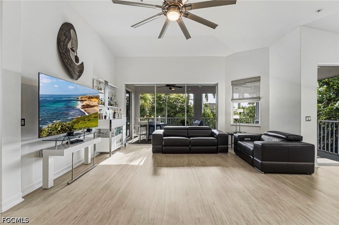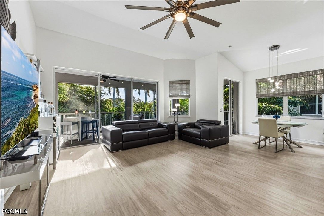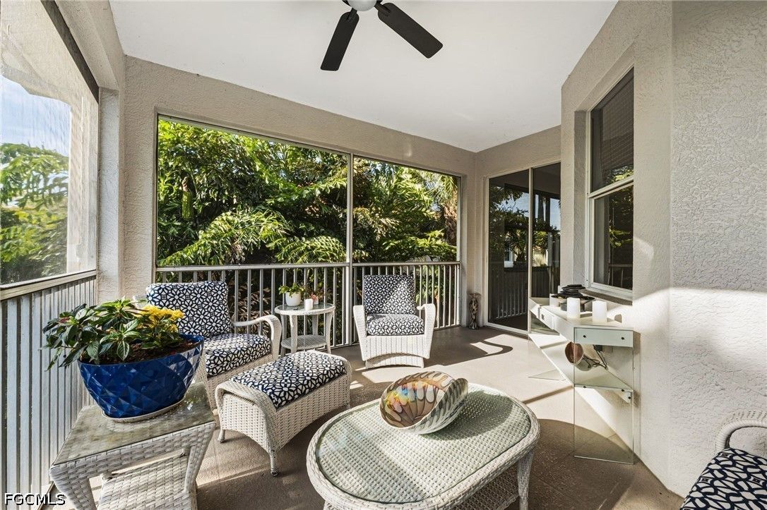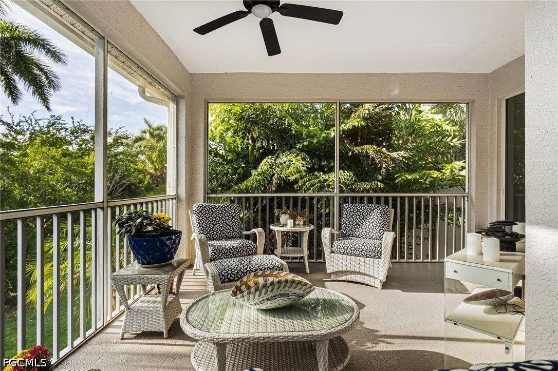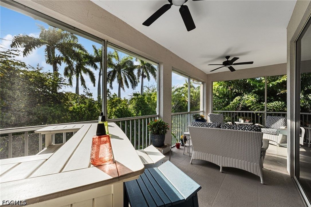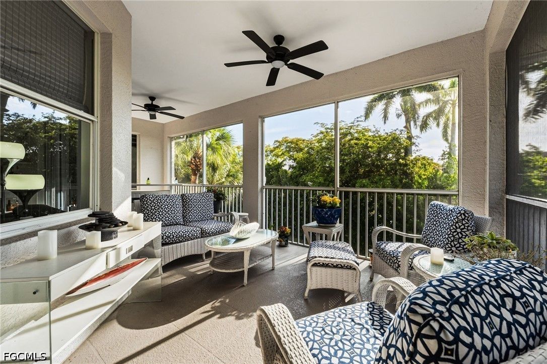 Fresh interior paint sets the stage with a pristine, neutral canvas—inviting you to curate and personalize a space that reflects your own vision of refined living. Nestled behind the gates of Gulf Harbour within the prestigious Mariposa community, this exceptional second-floor residence offers over 2,300 square feet of elegantly designed living space, enhanced by soaring 14-foot ceilings that create an immediate sense of grandeur in the main living area. Thoughtfully reimagined, the expansive three-bedroom plus den, two-bath floor plan showcases elevated finishes and a seamless, sophisticated flow throughout. Natural light pours into the impressive 260-square-foot wraparound screened lanai, ideally positioned with eastern exposure to capture soft morning light and tranquil, picturesque views—an inviting private sanctuary. Mariposa is one of the select communities within Gulf Harbour offering natural gas, adding both distinction and enhanced functionality to the lifestyle experience. The gourmet kitchen serves as the heart of the home, exquisitely appointed with Level 3 granite countertops, custom white cabinetry with pull-out shelving, a natural gas range, wine cooler, and layered upper and under-cabinet lighting that creates a warm, refined ambiance. Newer stainless steel appliances and a striking designer backsplash complete this culinary masterpiece, blending beauty with everyday practicality. Luxury vinyl flooring flows effortlessly throughout the main living areas, while plush carpeting on the staircase adds comfort and subtle elegance. A sport membership is available, granting access to Gulf Harbour’s premier amenities, with the community pool conveniently just steps away. The private primary suite offers a serene retreat, featuring direct lanai access, a sophisticated tray ceiling, a custom walk-in closet, and a spa-inspired bath adorned with dual vessel sinks, granite countertops, and a beautifully executed walk-in shower finished with floor-to-ceiling designer tile. Two additional generously sized guest bedrooms, each with walk-in closets, are complemented by a thoughtfully appointed guest bath showcasing a vessel sink and glass-enclosed shower. A comprehensive suite of upgrades enhances both comfort and peace of mind, including designer lighting and ceiling fans, LED garage lighting, updated sliding glass door components (2020), a 50-gallon water heater (2021), and a 4-ton Comfortmaker A/C system installed in March 2022. A new washer and dryer, along with a spacious two-car garage, complete this impeccably maintained, move-in-ready residence. Be sure to explore the two exceptional property videos to fully experience the elegance, lifestyle, and effortless sophistication this remarkable home provides.