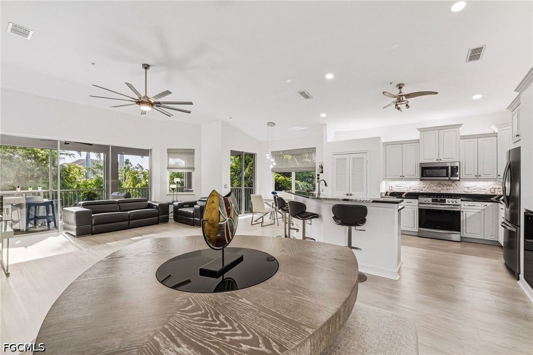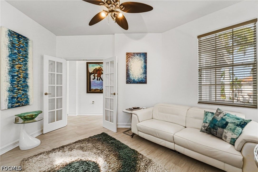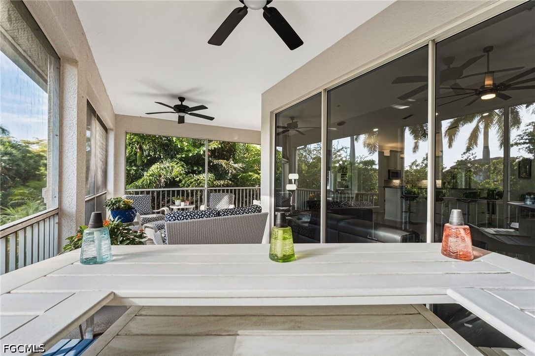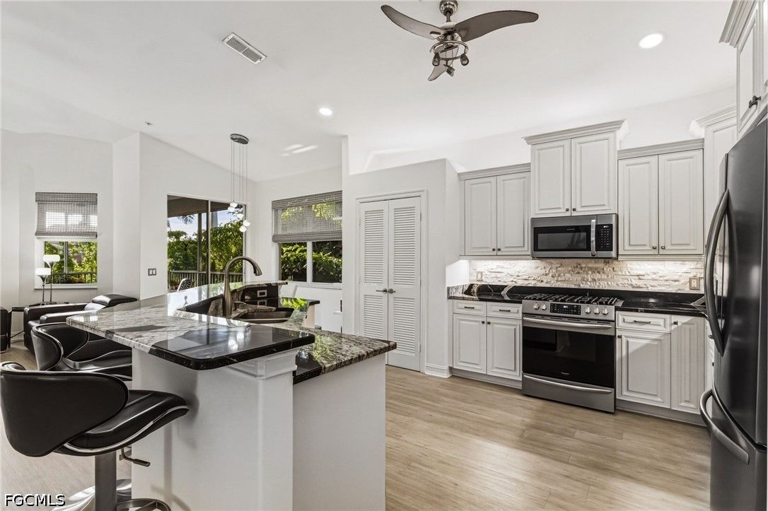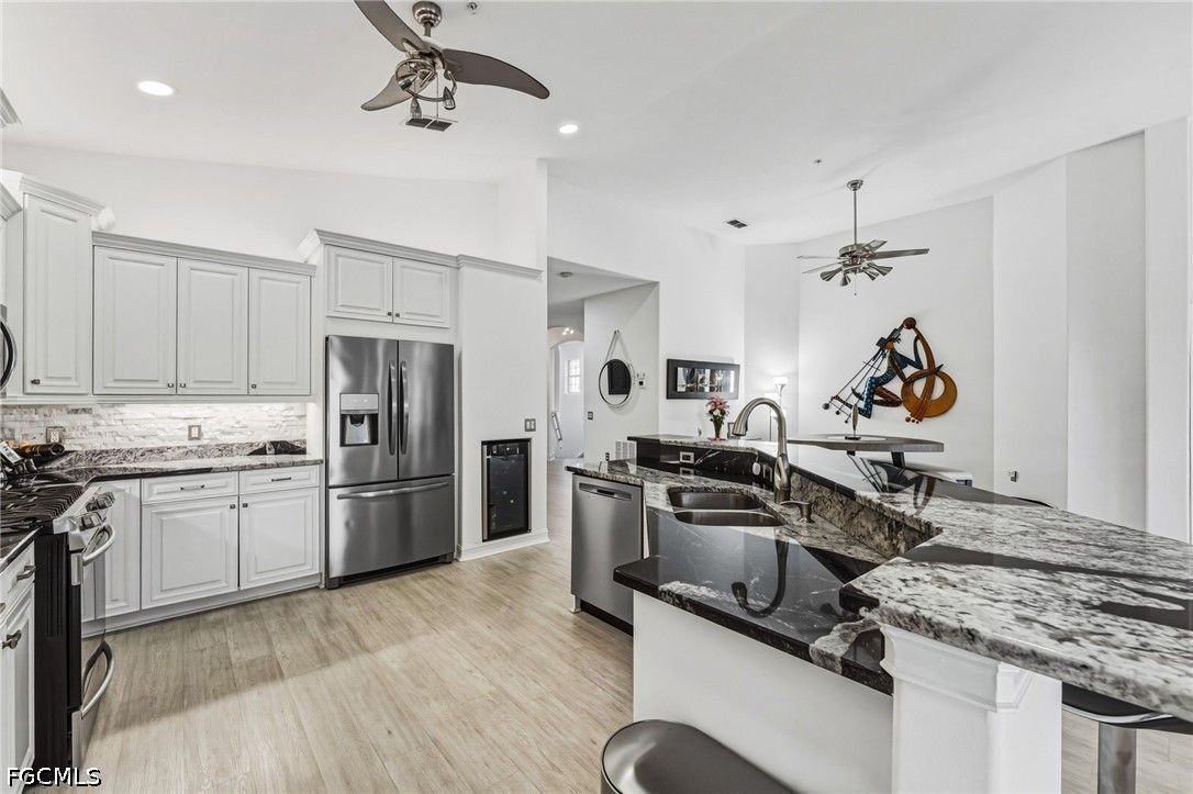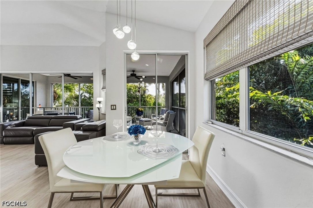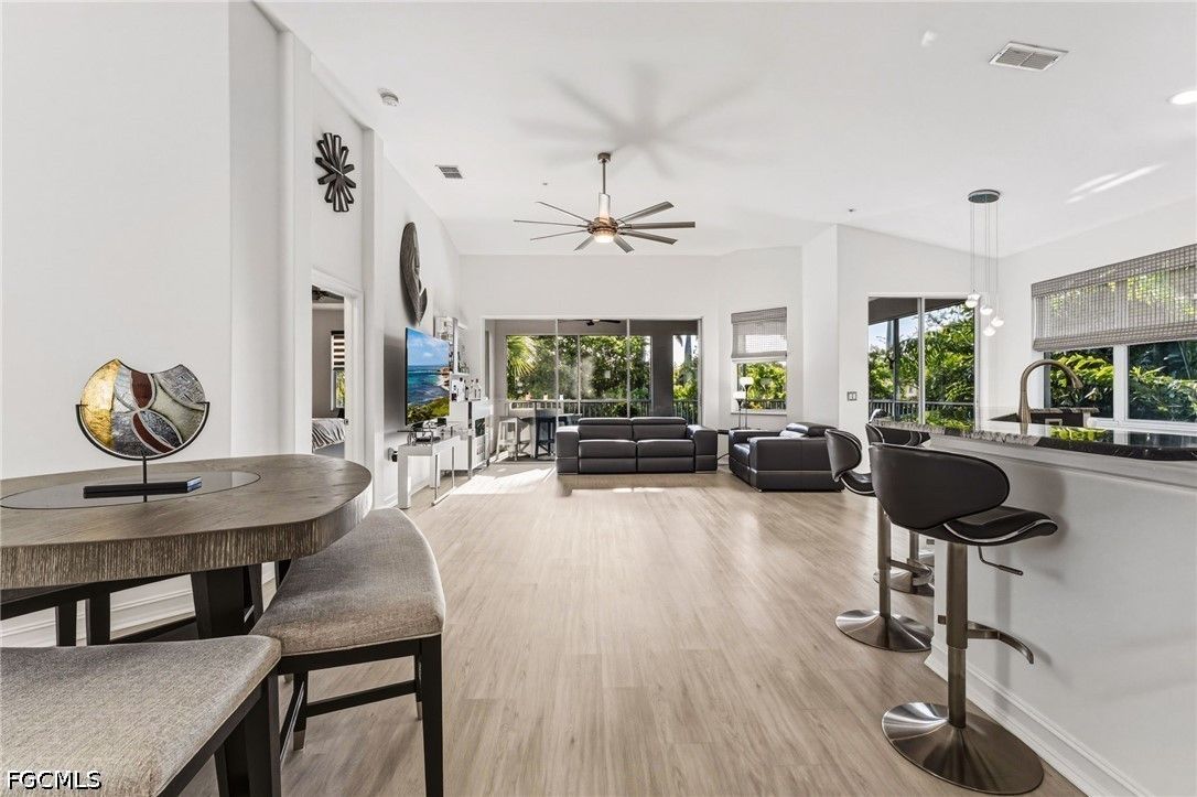 Fresh interior paint sets the stage with a pristine, neutral canvas—inviting you to curate and personalize a space that reflects your own vision of refined living. Nestled behind the gates of Gulf Harbour within the prestigious Mariposa community, this exceptional second-floor residence offers over 2,300 square feet of elegantly designed living space, enhanced by soaring 14-foot ceilings that create an immediate sense of grandeur in the main living area. Thoughtfully reimagined, the expansive three-bedroom plus den, two-bath floor plan showcases elevated finishes and a seamless, sophisticated flow throughout. Natural light pours into the impressive 260-square-foot wraparound screened lanai, ideally positioned with eastern exposure to capture soft morning light and tranquil, picturesque views—an inviting private sanctuary. Mariposa is one of the select communities within Gulf Harbour offering natural gas, adding both distinction and enhanced functionality to the lifestyle experience. The gourmet kitchen serves as the heart of the home, exquisitely appointed with Level 3 granite countertops, custom white cabinetry with pull-out shelving, a natural gas range, wine cooler, and layered upper and under-cabinet lighting that creates a warm, refined ambiance. Newer stainless steel appliances and a striking designer backsplash complete this culinary masterpiece, blending beauty with everyday practicality. Luxury vinyl flooring flows effortlessly throughout the main living areas, while plush carpeting on the staircase adds comfort and subtle elegance. A sport membership is available, granting access to Gulf Harbour’s premier amenities, with the community pool conveniently just steps away. The private primary suite offers a serene retreat, featuring direct lanai access, a sophisticated tray ceiling, a custom walk-in closet, and a spa-inspired bath adorned with dual vessel sinks, granite countertops, and a beautifully executed walk-in shower finished with floor-to-ceiling designer tile. Two additional generously sized guest bedrooms, each with walk-in closets, are complemented by a thoughtfully appointed guest bath showcasing a vessel sink and glass-enclosed shower. A comprehensive suite of upgrades enhances both comfort and peace of mind, including designer lighting and ceiling fans, LED garage lighting, updated sliding glass door components (2020), a 50-gallon water heater (2021), and a 4-ton Comfortmaker A/C system installed in March 2022. A new washer and dryer, along with a spacious two-car garage, complete this impeccably maintained, move-in-ready residence. Be sure to explore the two exceptional property videos to fully experience the elegance, lifestyle, and effortless sophistication this remarkable home provides.