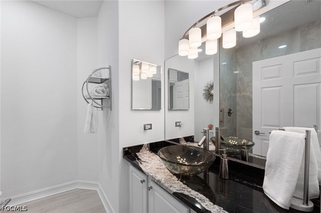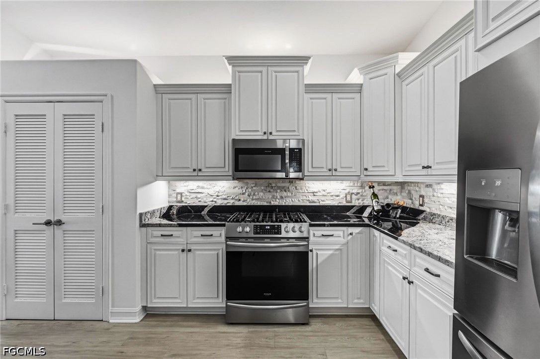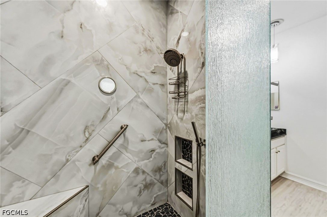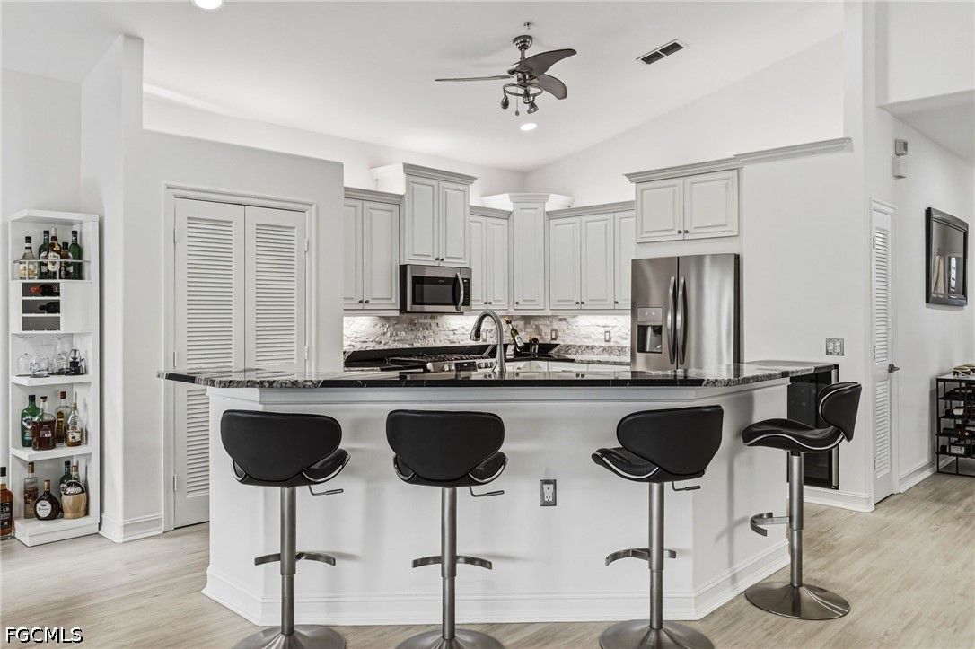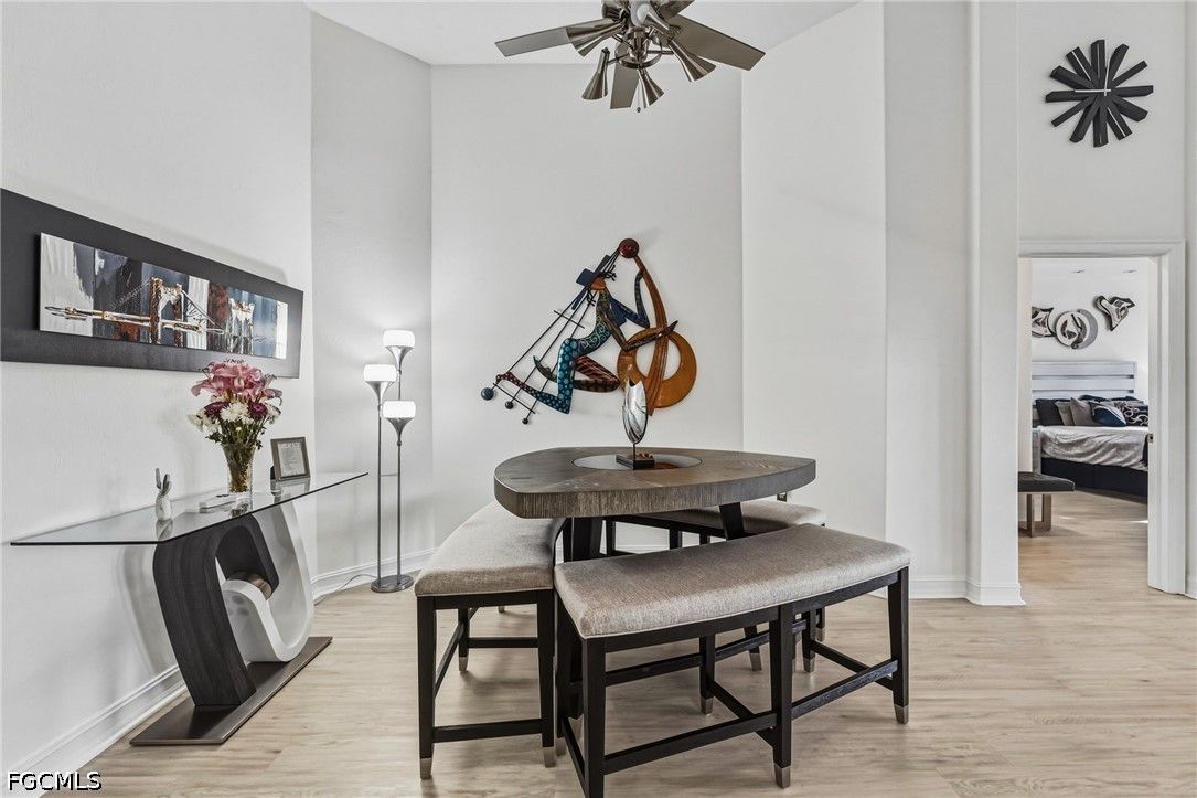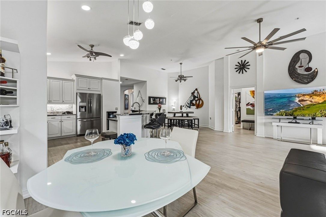 Fresh interior paint sets the stage with a pristine, neutral canvas—inviting you to curate and personalize a space that reflects your own vision of refined living. Nestled behind the gates of Gulf Harbour within the prestigious Mariposa community, this exceptional second-floor residence offers over 2,300 square feet of elegantly designed living space, enhanced by soaring 14-foot ceilings that create an immediate sense of grandeur in the main living area. Thoughtfully reimagined, the expansive three-bedroom plus den, two-bath floor plan showcases elevated finishes and a seamless, sophisticated flow throughout. Natural light pours into the impressive 260-square-foot wraparound screened lanai, ideally positioned with eastern exposure to capture soft morning light and tranquil, picturesque views—an inviting private sanctuary. Mariposa is one of the select communities within Gulf Harbour offering natural gas, adding both distinction and enhanced functionality to the lifestyle experience. The gourmet kitchen serves as the heart of the home, exquisitely appointed with Level 3 granite countertops, custom white cabinetry with pull-out shelving, a natural gas range, wine cooler, and layered upper and under-cabinet lighting that creates a warm, refined ambiance. Newer stainless steel appliances and a striking designer backsplash complete this culinary masterpiece, blending beauty with everyday practicality. Luxury vinyl flooring flows effortlessly throughout the main living areas, while plush carpeting on the staircase adds comfort and subtle elegance. A sport membership is available, granting access to Gulf Harbour’s premier amenities, with the community pool conveniently just steps away. The private primary suite offers a serene retreat, featuring direct lanai access, a sophisticated tray ceiling, a custom walk-in closet, and a spa-inspired bath adorned with dual vessel sinks, granite countertops, and a beautifully executed walk-in shower finished with floor-to-ceiling designer tile. Two additional generously sized guest bedrooms, each with walk-in closets, are complemented by a thoughtfully appointed guest bath showcasing a vessel sink and glass-enclosed shower. A comprehensive suite of upgrades enhances both comfort and peace of mind, including designer lighting and ceiling fans, LED garage lighting, updated sliding glass door components (2020), a 50-gallon water heater (2021), and a 4-ton Comfortmaker A/C system installed in March 2022. A new washer and dryer, along with a spacious two-car garage, complete this impeccably maintained, move-in-ready residence. Be sure to explore the two exceptional property videos to fully experience the elegance, lifestyle, and effortless sophistication this remarkable home provides.