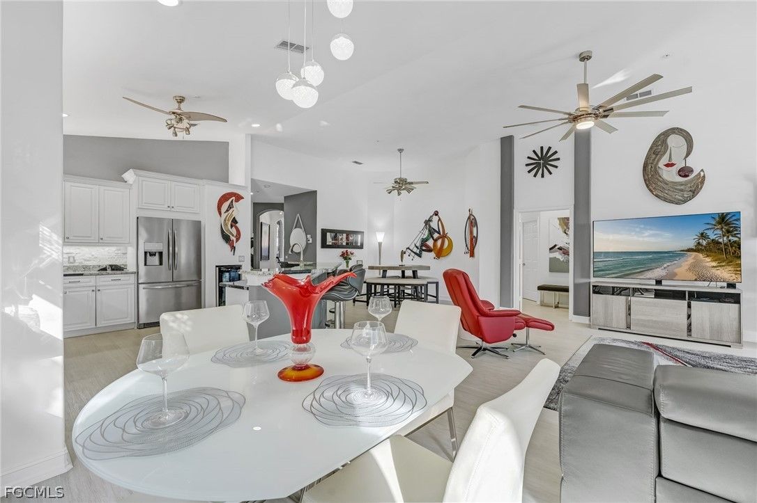 Tucked within the prestigious Mariposa community behind the gates of Gulf Harbour, this exceptional second-level residence offers over 2,300 square feet of sophisticated living space, highlighted by soaring 14-foot ceilings in the main living area. Expertly remodeled, the three-bedroom plus den, two-bath floor plan is appointed with elegant finishes and thoughtful design throughout. Natural light floods the expansive 260-square-foot wraparound screened lanai, east-facing for serene morning views, creating a tranquil and inviting ambiance that perfectly complements the home’s refined character. The gourmet kitchen is a true centerpiece, featuring Level 3 granite countertops, custom white cabinetry with pull out shelves, a natural gas range, upper and under-cabinet lighting, a wine cooler, and newer stainless-steel appliances. Stunning backsplash completes the look! Luxury vinyl flooring flows seamlessly throughout, while high-end carpeting on the staircase ensures ease and comfort when entering and exiting the home. Sport membership is available with this residence, offering access to the exquisite amenities that Gulf Harbour provides, including steps to the beautiful, relaxing community pool. The private primary suite boasts direct lanai access, a tray ceiling, a custom walk-in closet, and a spa-inspired bath with vessel sinks, granite countertops, and a designer walk-in shower finished in floor-to-ceiling tile. Two additional generously sized bedrooms feature walk-in closets, complemented by a second full bath with a vessel sink and glass-enclosed shower. Upgrades throughout enhance both comfort and modern living, including designer lighting and ceiling fans, plus LED garage lighting. Sliding glass door tracks, rollers, and handles were replaced in 2020 for effortless operation, a 50-gallon hot water heater was installed in 2021, and a 4-ton Comfortmaker A/C system was added in March 2022 for year-round efficiency. New washer and dryer. A spacious two-car garage completes this meticulously maintained, move-in-ready residence. 2 fabulous videos to watch!