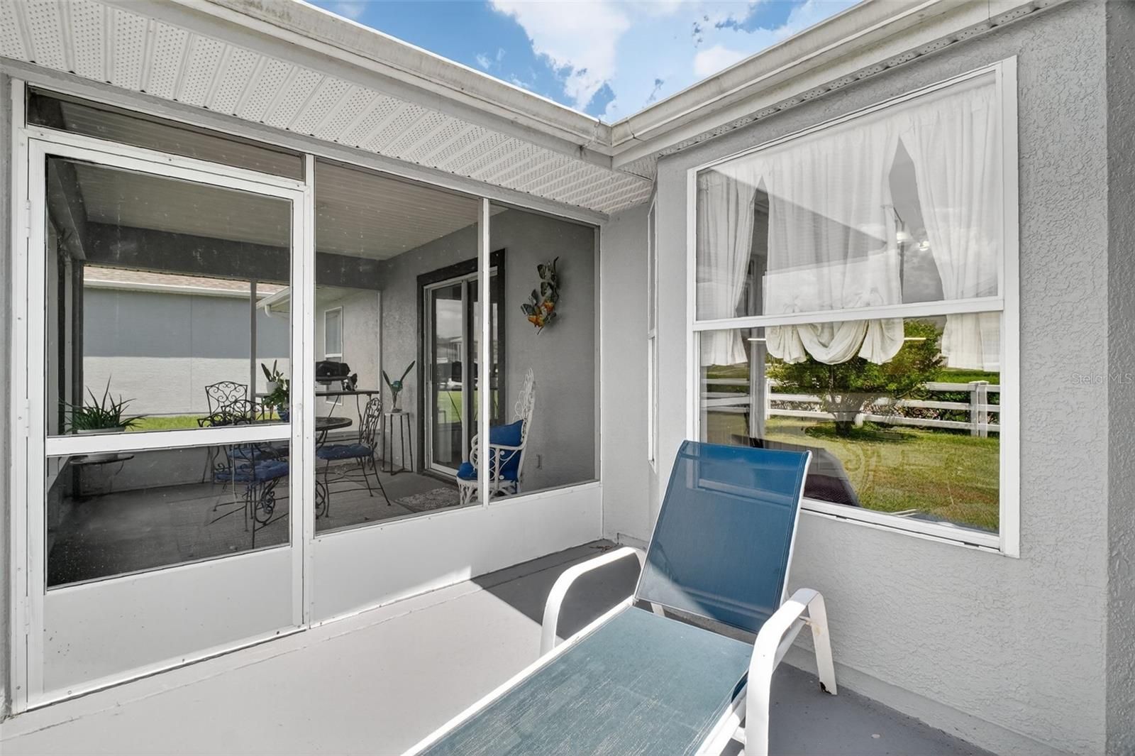 OWNER MOTIVATED--LARGE PRICE REDUCTION--Welcome to Stonecrest, a premier 55+ gated golf course community just two miles from The Villages by golf cart! This cozy, well-maintained 3-bedroom, 2-bath home is move-in ready and waiting for its new owner. Featuring NO CARPET and luxury vinyl plank flooring throughout, this popular Lily model offers an airy, open-concept layout ideal for comfortable living and entertaining. The split-bedroom floor plan offers privacy, featuring a primary suite on one side and two guest bedrooms on the other. One guest bedroom features direct access to a full EN-Suite bathroom with a tub/shower combination and vanity, ideal for visiting family or friends. The property also offers two-car garage parking with a screen. From the living room, sliding glass doors lead to a screened-in patio, ideal for relaxing or enjoying Florida's beautiful weather. Additional highlights include a new roof (installed in 2022) and a new HVAC system (installed in 2022), providing peace of mind. Located just 2 miles from local shopping, dining, and nightly entertainment in the Spanish Springs Town Square, 365 days a year.. With 24-hour security and amenities that rival a resort: 4 pools (1 indoor), a fitness center, an 18-hole championship golf course, a clubhouse, pickleball courts, softball, with over 50 active clubs, and more, you will find your days filled with many activities of your choice. Conveniently located close to restaurants, shopping, medical facilities, and entertainment—many accessible by golf cart! Stonecrest is a community with Private Roads. Nearby medical facilities and entertainment -- many accessible by golf cart. Overall, this home offers a combination of Tremendous Outdoor Space, luxurious features, and a desirable location. A WONDERFUL LIFESTYLE AWAITS YOU IN Stonecrest!