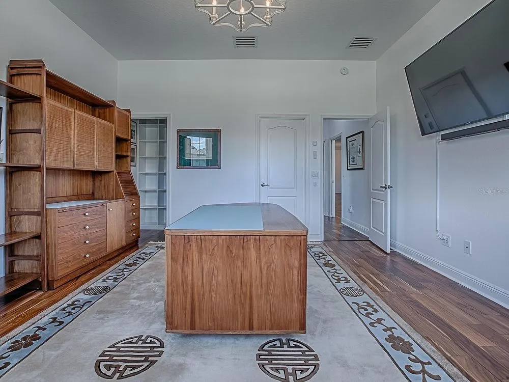- Ceiling Fan(s), Coffered Ceiling(s), Crown Molding, Eat-in Kitchen, High Ceilings, Open Floorplan, Main Level Primary, Smart Home, Solid-Wood Cabinets, Split Bedrooms, Stone Counters, Thermostat, Walk-In Closet(s)