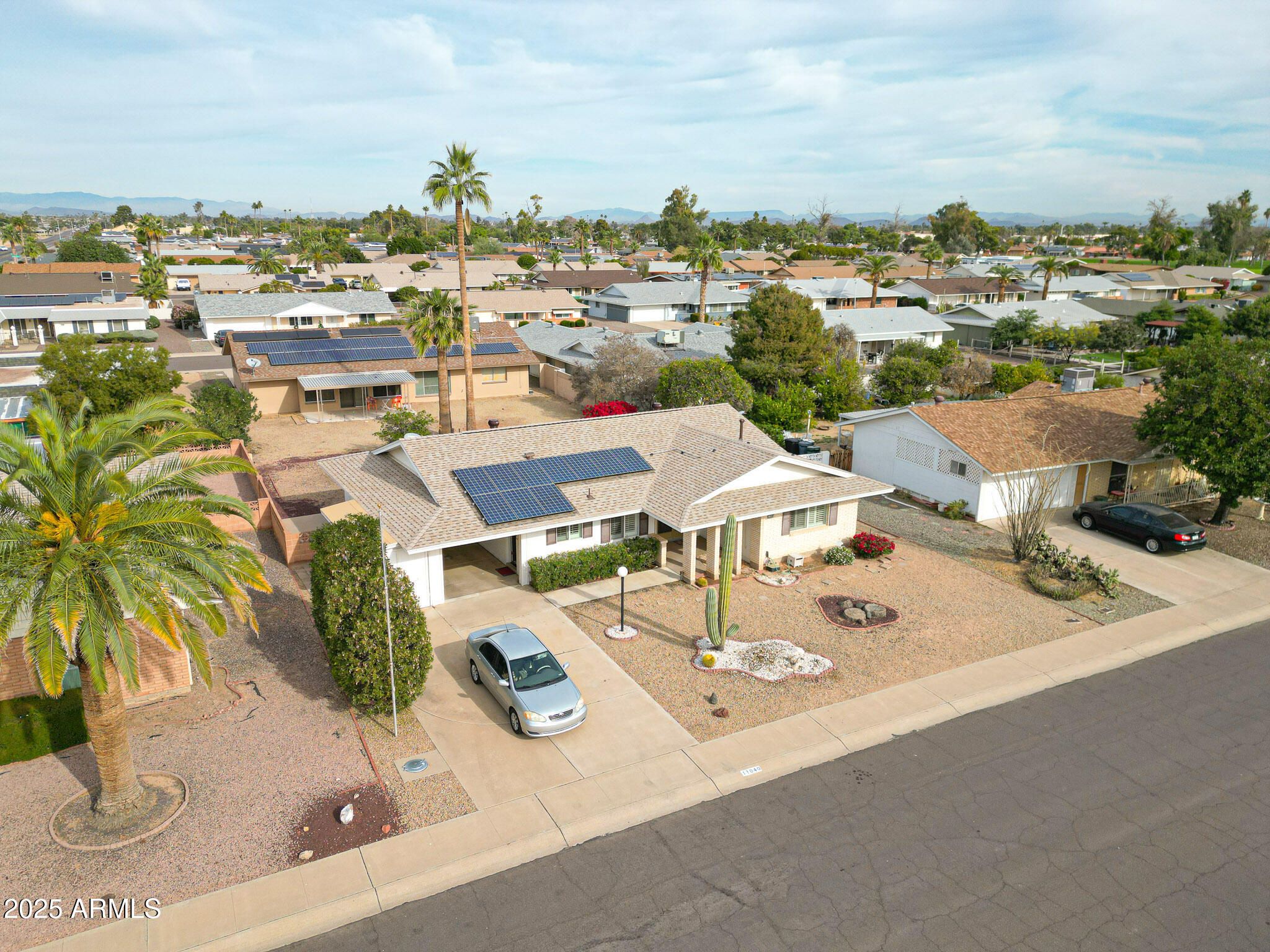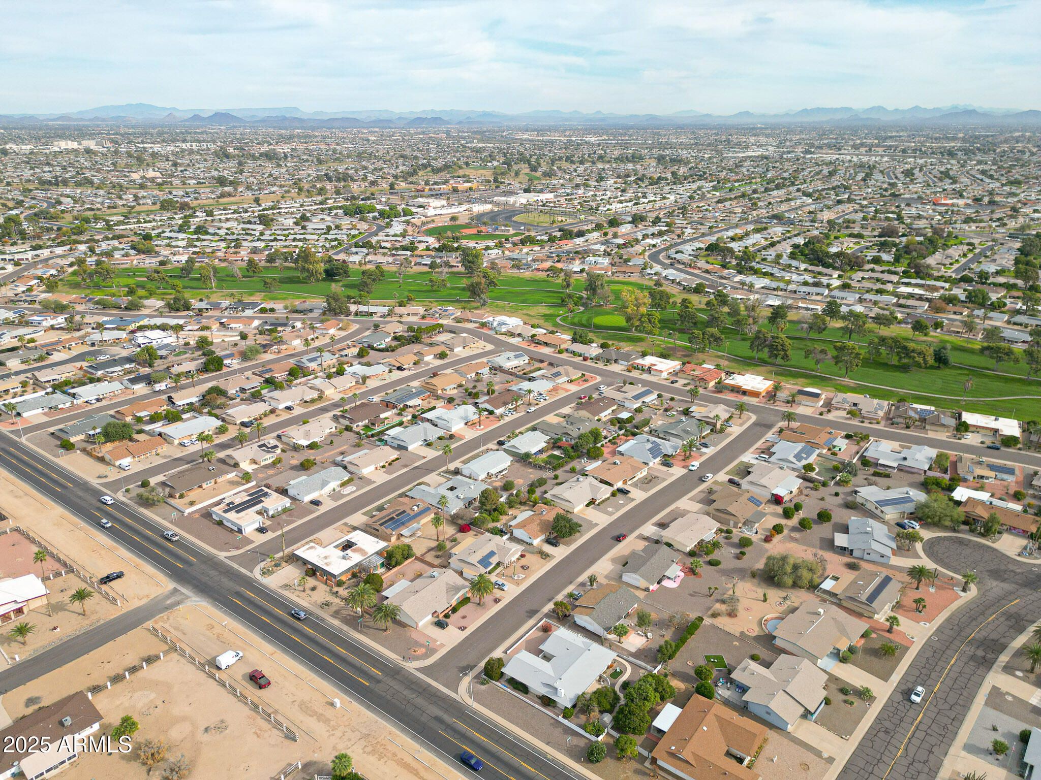 **Charming 2-Bed, 2-Bath Home with Golf Cart Garage—Move-In Ready!** Step inside this bright, sun-filled home featuring a galley kitchen perfect for entertaining and a large Arizona room with heating, cooling, and thermo-pane windows. Plantation shutters throughout add elegance, while low-maintenance front and back yards give you more time to relax. Enjoy modern updates including owned solar, a new roof, and a new sewer line (2019). The 1-car garage plus a separate golf cart garage with extra storage keeps everything organized. Plus, a **$5,000 carpet allowance** lets you personalize the flooring to your taste. With ideal north/south exposure and a prime location near a country club golf course, shopping, dining, and quick access to US60 & Loop 101, this home truly has it all ... Live, entertain, and relaxyour dream Arizona lifestyle starts here! SUN CITY COUNTRY CLUB & GOLF COURSE SUN BOWL AMPHITHEATRE FAIRWAY RECREATION CENTER MOUNTAIN VIEW RECREATION CENTER
