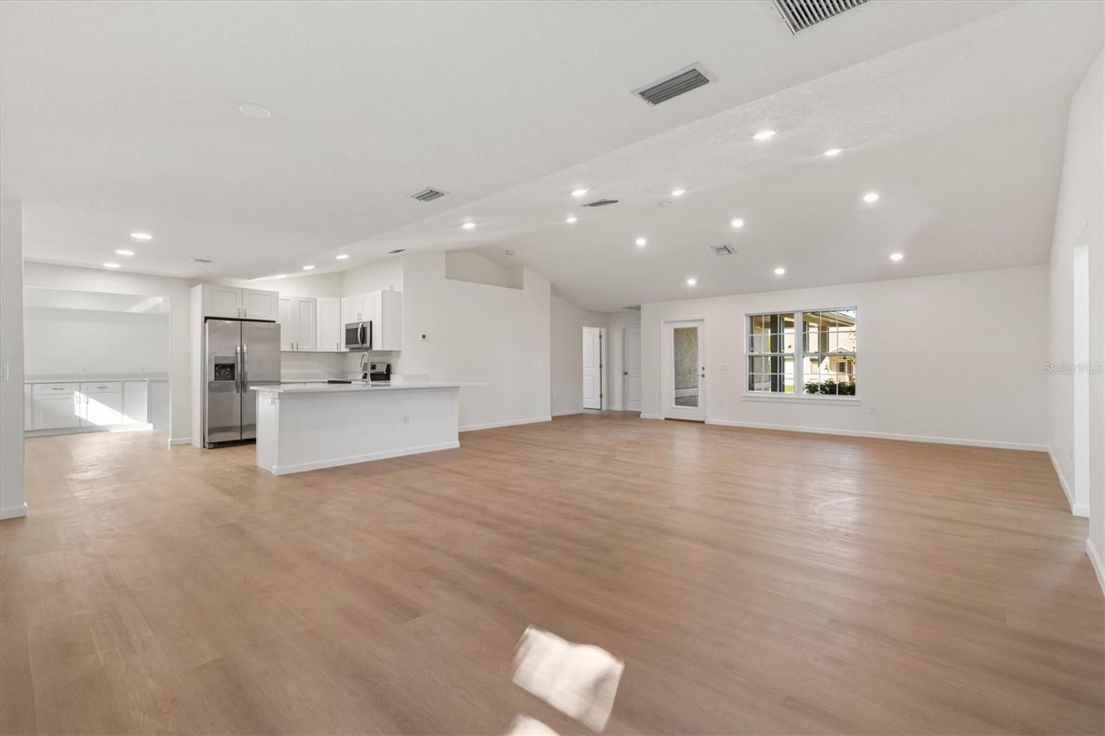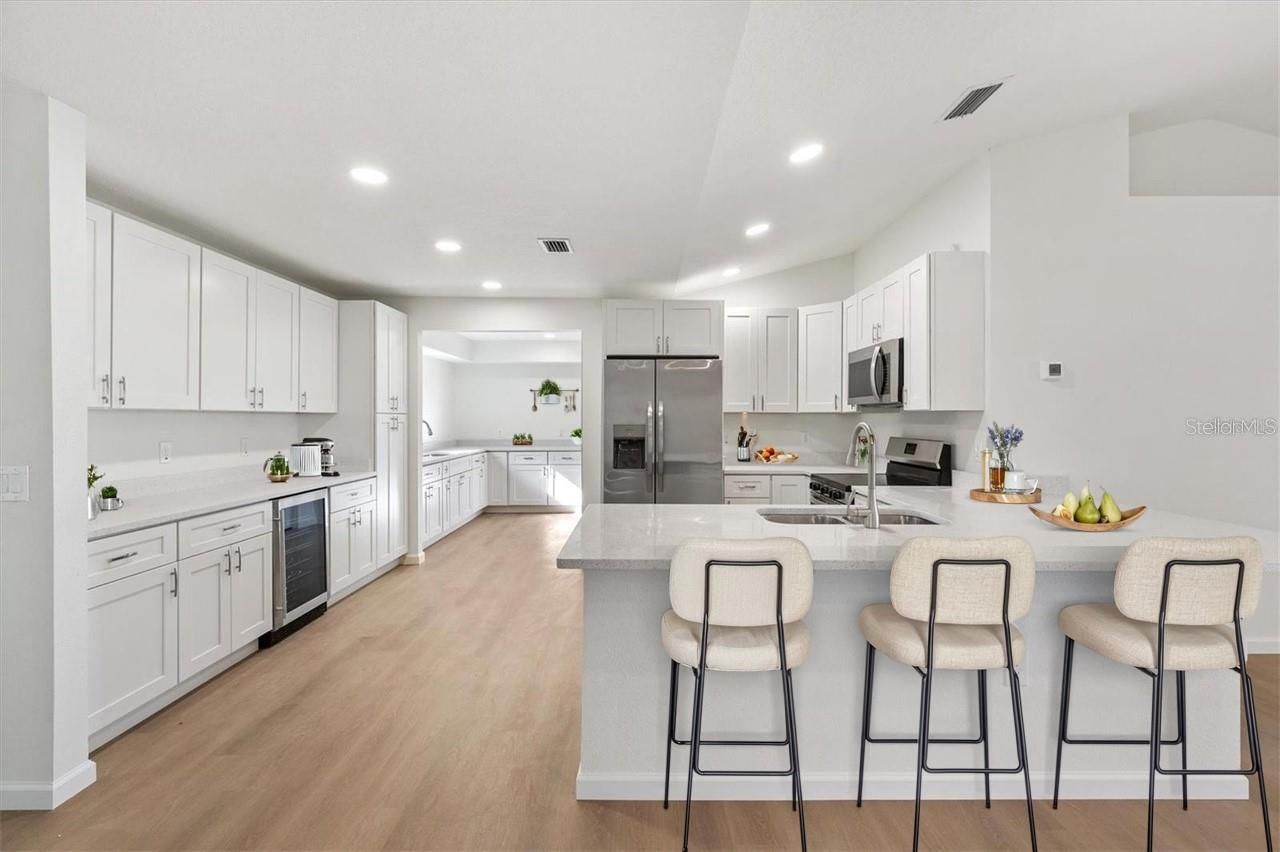 Discover this rare one-of-a-kind open floor plan featuring cathedral-style ceilings, abundant recessed lighting, and 4 bedrooms including a second ensuite—ideal for hosting friends and family. The expansive layout offers larger rooms, quartz counters, soft-close cabinets, a stylish dry bar with wine fridge, and an impressive oversized butler’s pantry with a second sink, along with inside laundry for added convenience. The primary suite includes a giant walk-in closet, a beautifully tiled shower, and a private water closet, while another bathroom enjoys the natural light of a skylight. Thoughtful finishes create a versatile design palette suited to many styles. Additional highlights include a recently landscaped exterior, brick driveway, irrigation system, and close proximity to community amenities and the nearby swimming pool. Located in Stonecrest, a premier 55+ gated golf course community with private roads, 24-hour security, multiple pools, pickleball, softball, an 18-hole championship course, the Broad Stripes Golf & Social Club, and over 80 clubs to join, this home blends luxury, comfort, and an unmatched lifestyle—a wonderful way of living awaits you in Stonecrest! Low HOA fees!