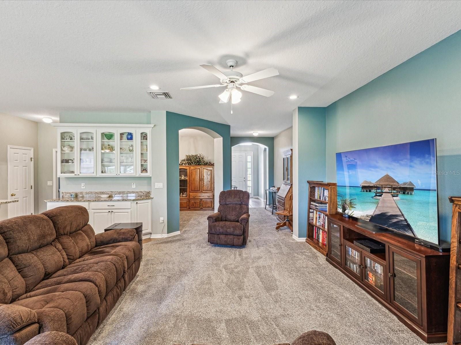 - High Ceilings, Kitchen/Family Room Combo, Open Floorplan, Main Level Primary, Solid Surface Counters, Solid-Wood Cabinets, Split Bedrooms, Walk-In Closet(s), Window Treatments