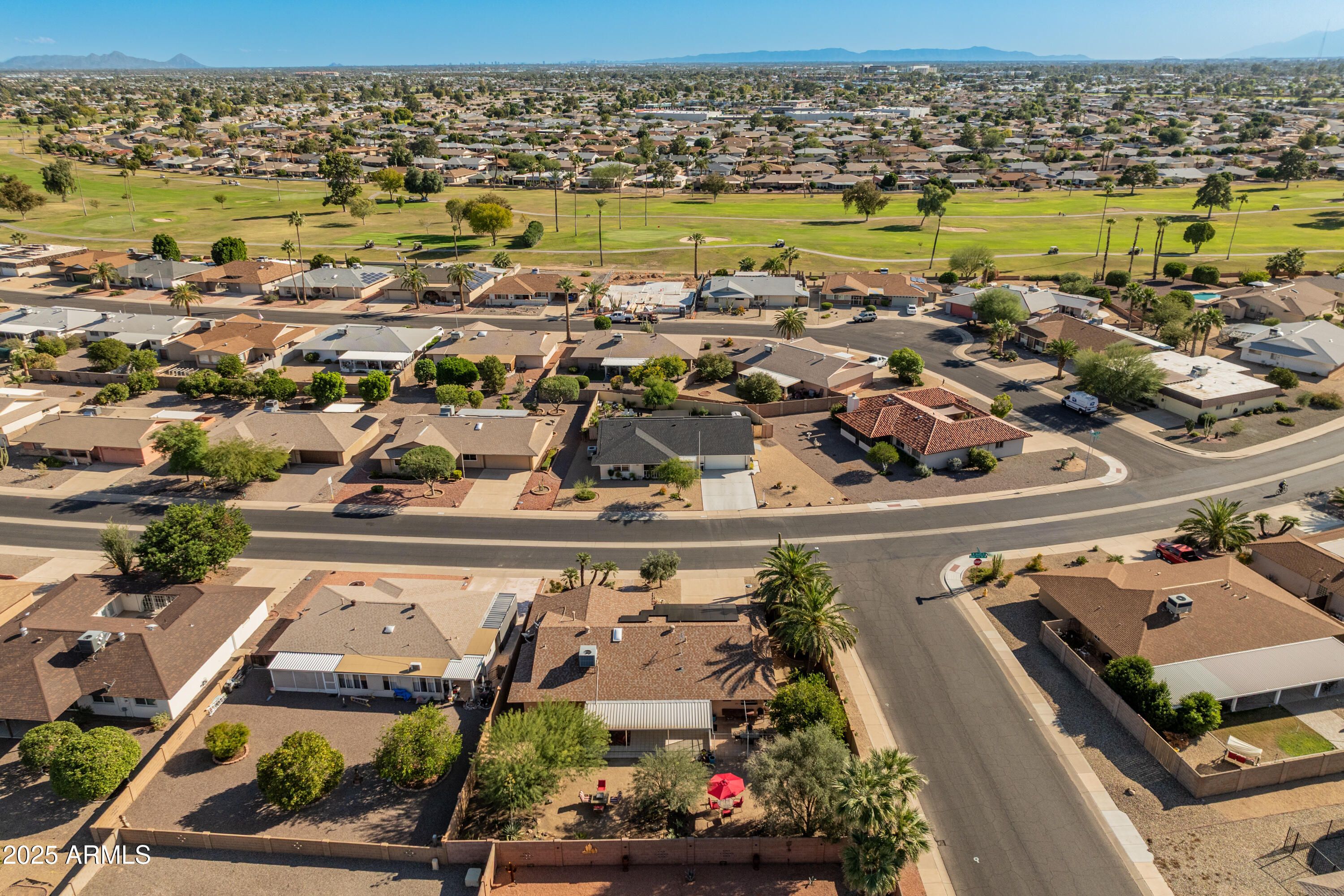 Welcome home to this beautifully renovated 2-bedroom, 2-bath residence in the heart of Sun City, where modern comfort meets effortless desert living. Nearly every inch of this home has been thoughtfully updated, offering peace of mind, energy efficiency, and an inviting contemporary style. Step inside to discover brand-new luxury vinyl plank flooring and plush new carpet in the bedrooms, complemented by fresh interior paint throughout. The open, light-filled kitchen is a true showstopper, featuring a spacious island, gleaming quartz countertops, stainless steel sink, new appliances, and sleek LED recessed lighting on dimmer switches—perfect for entertaining or relaxing evenings at home. Enjoy year-round comfort with high-efficiency windows, upgraded HVAC ducting with AeroSeal programmable thermostat, and a striking new leaded-glass front door that sets the tone the moment you arrive. Popcorn ceilings have been removed, creating a smooth, modern aesthetic, while updated baseboards and ceiling fans enhance the home's polished look. The spacious hobby room can be easily converted to a 3rd bedroom. The bathrooms are equally impressive with stylish vanities and quartz countertops. Outside, desert landscaping provides easy maintenance, while a fully fenced block wall, two front gates, and an RV side gate offer privacy and functionality. The backyard irrigation system has been redone and includes a programmable controller for added convenience. This home also boasts an owned 8.9 kW solar system installed in 2025keeping energy bills lowalong with a new sewer line from the house to the street and a beautiful new paver walkway and entry. Move-in ready and packed with premium upgrades, this home is ideal for those seeking quality, efficiency, and style in an active adult community known for its amenities, golf, and lifestyle. This is a rare finddon't miss your opportunity to make it yours.