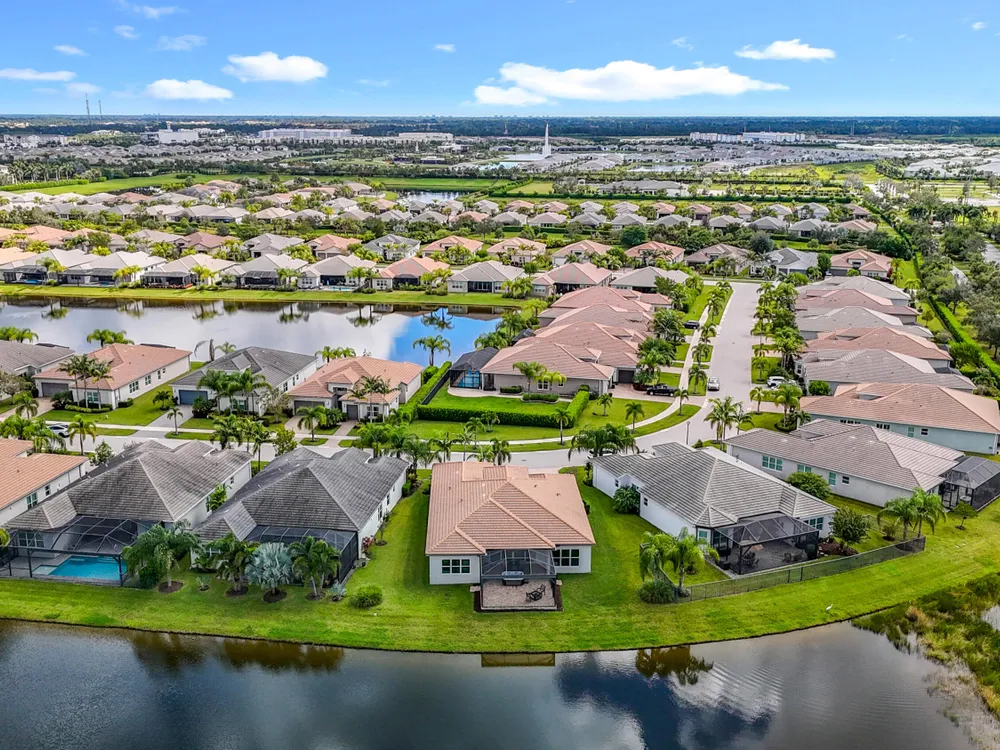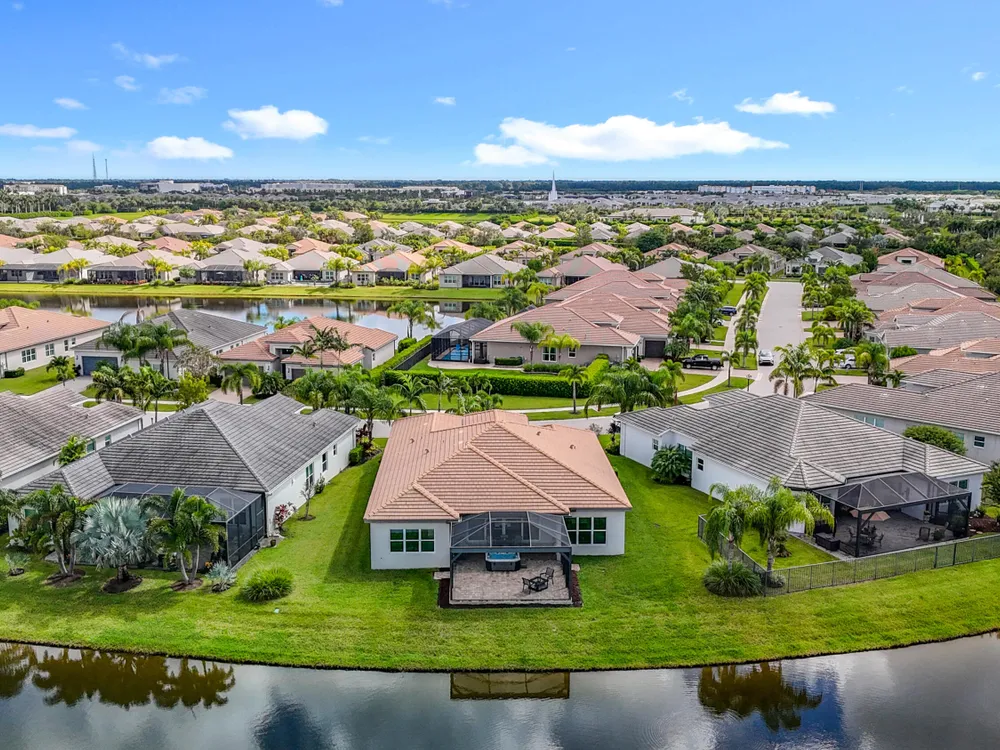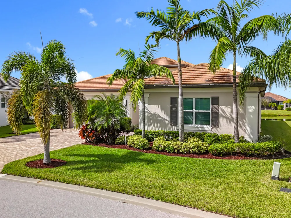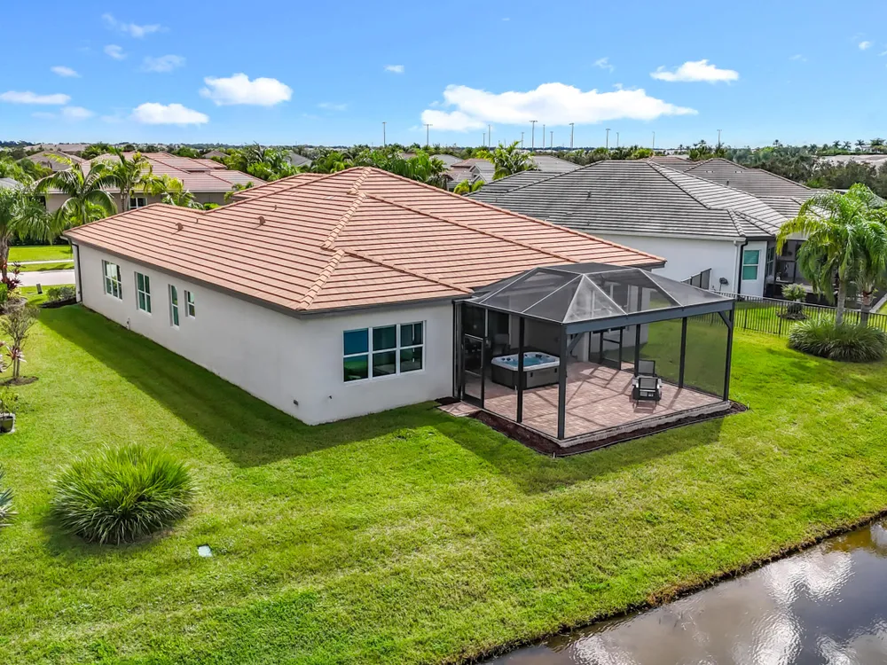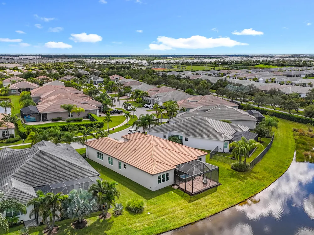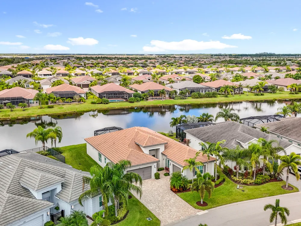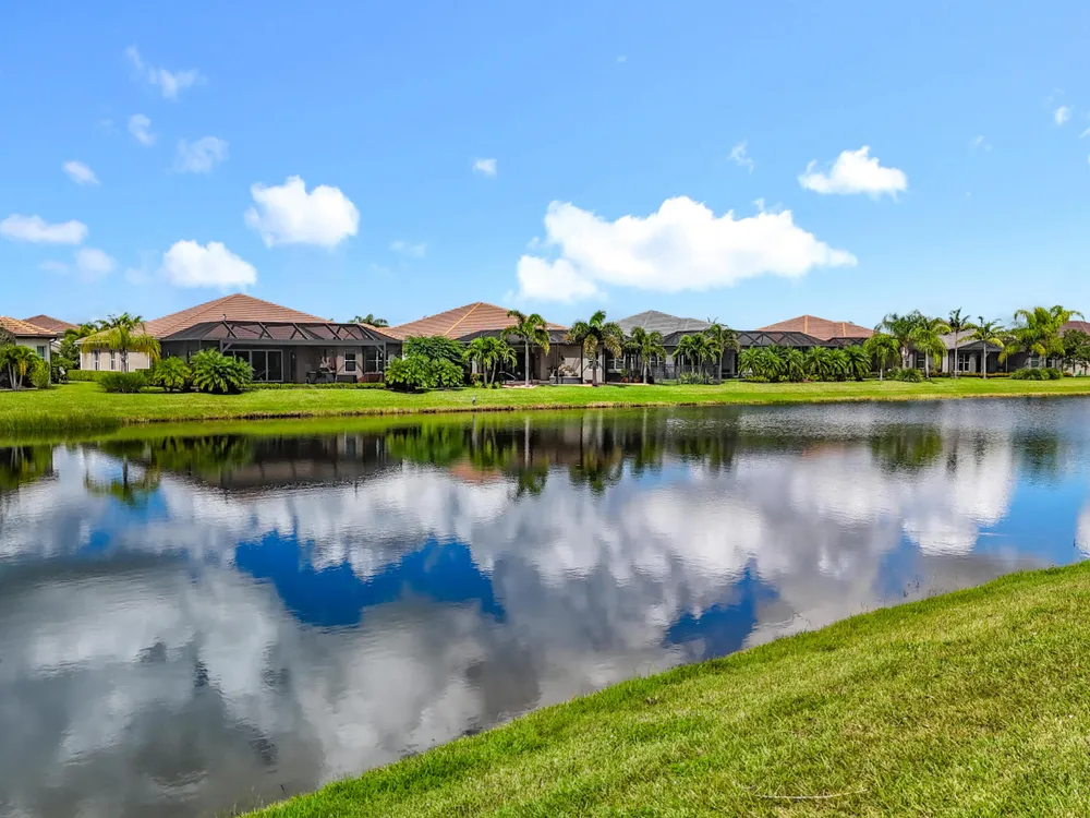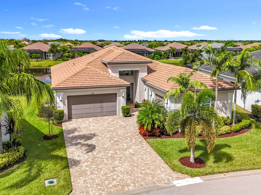 Lake Views Popular Caroline Model 2580 SF open floor plan features 2 bedrooms 2-1/2 bath den/game room/3rd bedroom 3 car garage many upgrades include cabinets quartz counter tops polished tile custom window treatments seamless glass shower enclosure in Master B Cat 5 window/doors monitored security system tile roof 8 ft garage doors extended paver driveway outdoor water oasis includes extended screen lanai kitchen & grill rough-in Valencia Cay located in Riverland a vibrant retirement community known for top tier amenities including resort pools, restaurants, River fresh Cafe, fitness center pickleball Arts & Culture Ctr City Parks The Town Center Publix grocery store recently opened The 35-acre ctr when complete will feature shops & rest