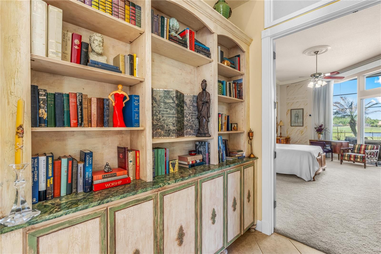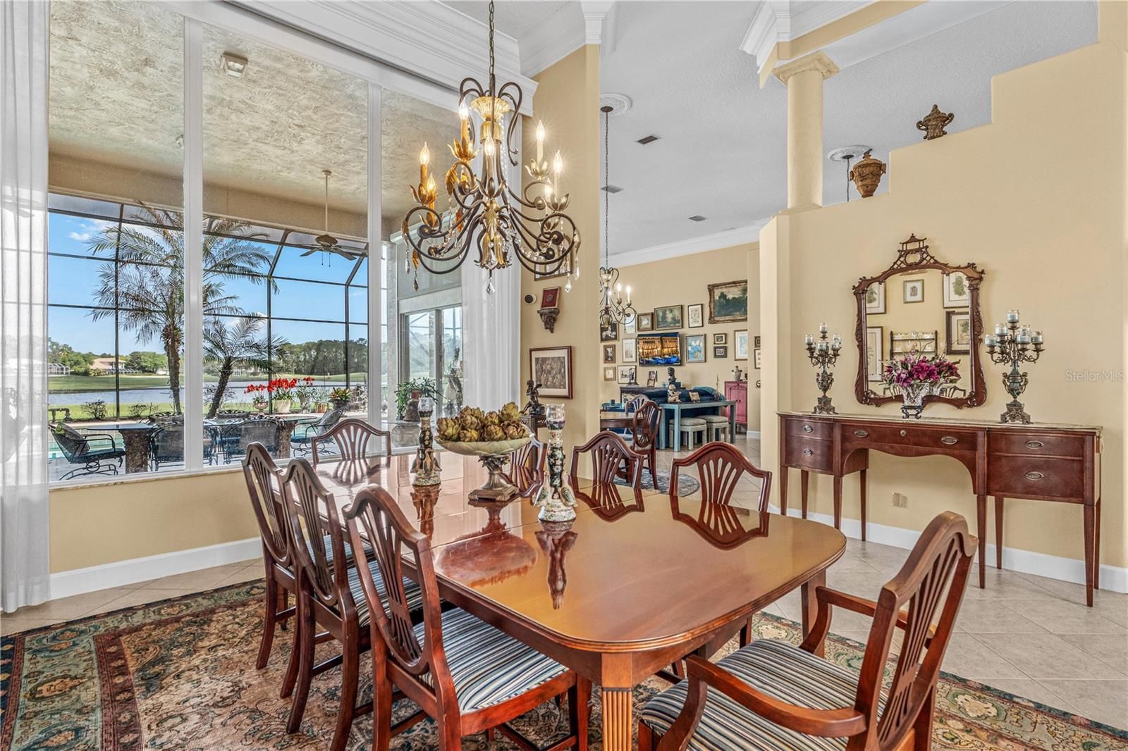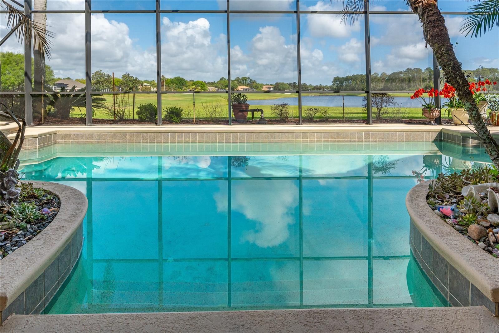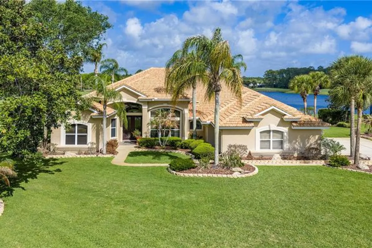 The TRIPLE VIEW-golf course, lake, preserve. Welcome to 1106 Oxbridge Lane, an exceptional 4 bedroom, 3.5 bathroom, 3 car garage estate home with a pool and elevated jacuzzi, .61 acre lot, perfectly positioned with breathtaking golf course and lake views in the prestigious Plantation Bay Golf & Country Club. Enter through custom double glass front doors and be immediately captivated by panoramic views of the pool, lake, and golf course, framed by soaring 14-foot ceilings and an open, light-filled layout. The formal living room showcases tile floors, expansive windows, custom drapes and blinds, and elegant double crown molding. The formal dining room features large windows capturing serene views, custom chandelier, extensive trim work, tile laid on the diagonal, and 14-foot ceilings. The oversized kitchen offers granite countertops and backsplash, 42-inch all-wood dovetail soft-close cabinetry, GE Profile stainless steel appliances including built-in oven and range with double oven feature, farmhouse sink, reverse osmosis system, dry bar, additional built-ins, and a large walk-in pantry. The breakfast nook is surrounded by grand windows with continued trim work and tile flooring. The family room features massive windows, extended crown molding, 14-foot ceilings, gas fireplace, built-in surround sound, electric sun shades, and three sliders to the lanai. The private master suite is in its own wing with double door entry, wall of sliders, custom drapes and shades, and stunning views. Enhanced by 12-foot ceilings with crown molding. The updated master bath includes quartz countertops, dual vanities with makeup area, jetted tub, large walk-in shower with mosaic tile and waterfall showerhead, private commode, and a grand walk-in closet with custom built-ins. Guest bedrooms are spacious with walk-in closets, including a rear bedroom with lake and golf views. Secondary baths feature extended vanities, tile tub/shower combos, and designer finishes. The fourth bedroom on the master wing offers a built-in desk and 3rd bath. Laundry room includes additional dishwasher, sink, cabinetry, and folding space. Additional features: two hot water heaters (2020, 2021), 2 zoned AC, Culligan water system, custom drapery, and sunshades. Outdoor living includes a covered lanai, oversized heated pool with elevated gas heated jacuzzi, koi pond (new liner and pump March 2026), gas grill hookup, and sweeping views. Pool 1/2 bath adds convenience. Oversized three-car side-entry garage with built-ins. Situated on over half an acre with fresh landscaping, lighting, tile roof, full gutters, and cul-de-sac location with no neighbor to the left. Plantation Bay offers optional membership with 45 holes of golf, clubhouse, fitness, tennis, pickleball, pools, dining, and social events. Buyers receive a substantial discount on initiation fee—ask listing agent. A rare opportunity for exceptional views, privacy, and luxury living.