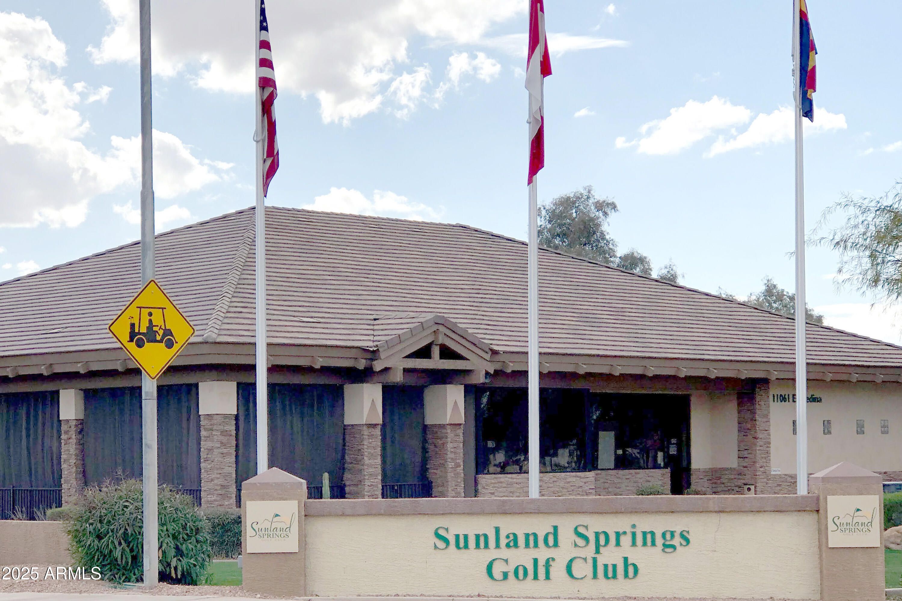 Welcome to this beautiful, mostly furnished two-bedroom, two-bathroom condo, perfectly situated for golf lovers in the highly sought-after Sunland Springs Village 55+ Community. This home is turn-key and ready for its new owner! You'll appreciate the fantastic curb appeal with its manicured landscape and convenient two-car garage. Key structural updates include a new roof underlayment, installed in 2022. Step inside the inviting, sun-drenched great room with large window overlooking the golf course. It features a neutral color palette, soaring 9-foot ceilings, and durable tile and laminate flooring throughout, creating an open and airy feel. The kitchen is fully equipped with attractive wood cabinetry, elegant granite counters, built-in appliances, and a tiered breakfast bar for casual dining. The main suite serves as a peaceful, private retreat, complete with a dedicated bathroom, convenient dual sinks, and a spacious walk-in closet. Finally, step outside to your south-facing covered patio, the ultimate spot to relax and enjoy the serene view as golfers play by or to entertain family and friends. Added convenience comes from the electronic roller shades on the south window and patio, providing customizable comfort and shade that completes this perfect retreat. Don't miss this opportunity for maintenance-free, resort-style living! Beyond the home, an active and engaging 55+ lifestyle awaits with an impressive array of amenities. The community boasts top-notch recreational facilities, including bocce ball, pickleball, shuffleboard and tennis courts, a softball field, two state-of-the-art fitness centers, two pools, and a variety of clubs and activities to suit almost every interest.