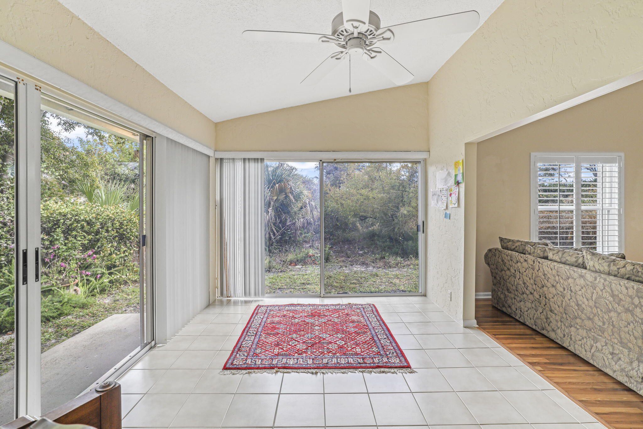 Welcome to a very private end unit in Sea Pines of Hobe Sound. Well maintained and updated 2/2 with high ceilings, lots of sunshine, CBS construction , a 1 car garage and ready for you to move in. Sea Pines, a 55+ community, offers a great location, minutes to the beach and shopping, an active clubhouse and pool where you can be as active as you like, private roads for walking, pet and people friendly. This end unit has a native preserve in the back and adjoins a large preserve on the corner. You will like the flow of the great room to the sunny Florida room and the extra space it offers. The impact glass entrance lets you open up to enjoy the porch and easy access to the garage. Whether you are still working or retired This is a great place to call home.