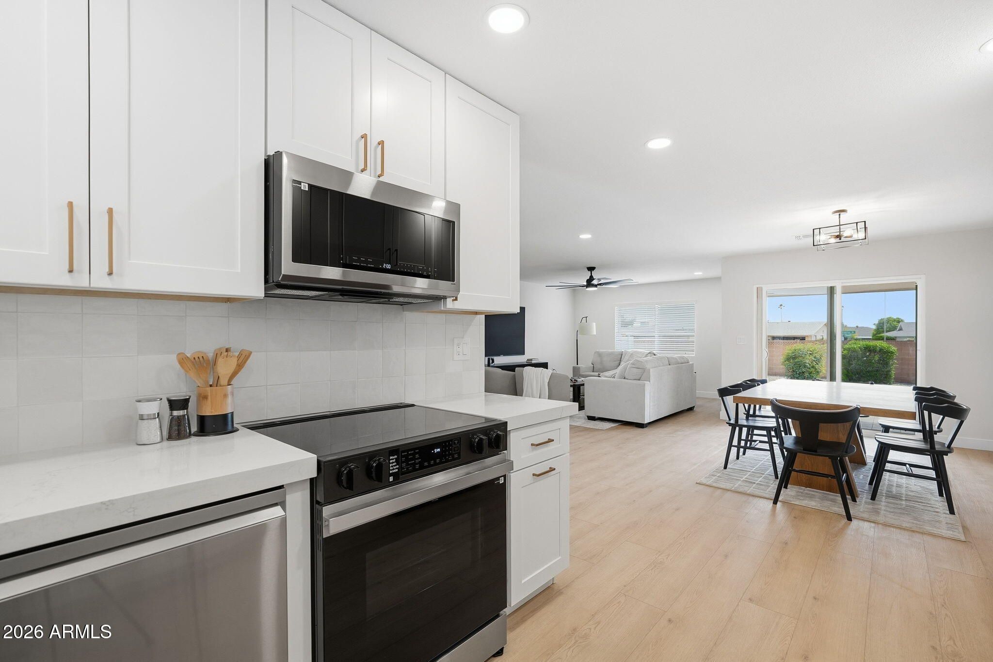 - Refrigerator, Built-in Microwave, Dishwasher, Disposal, Electric Range