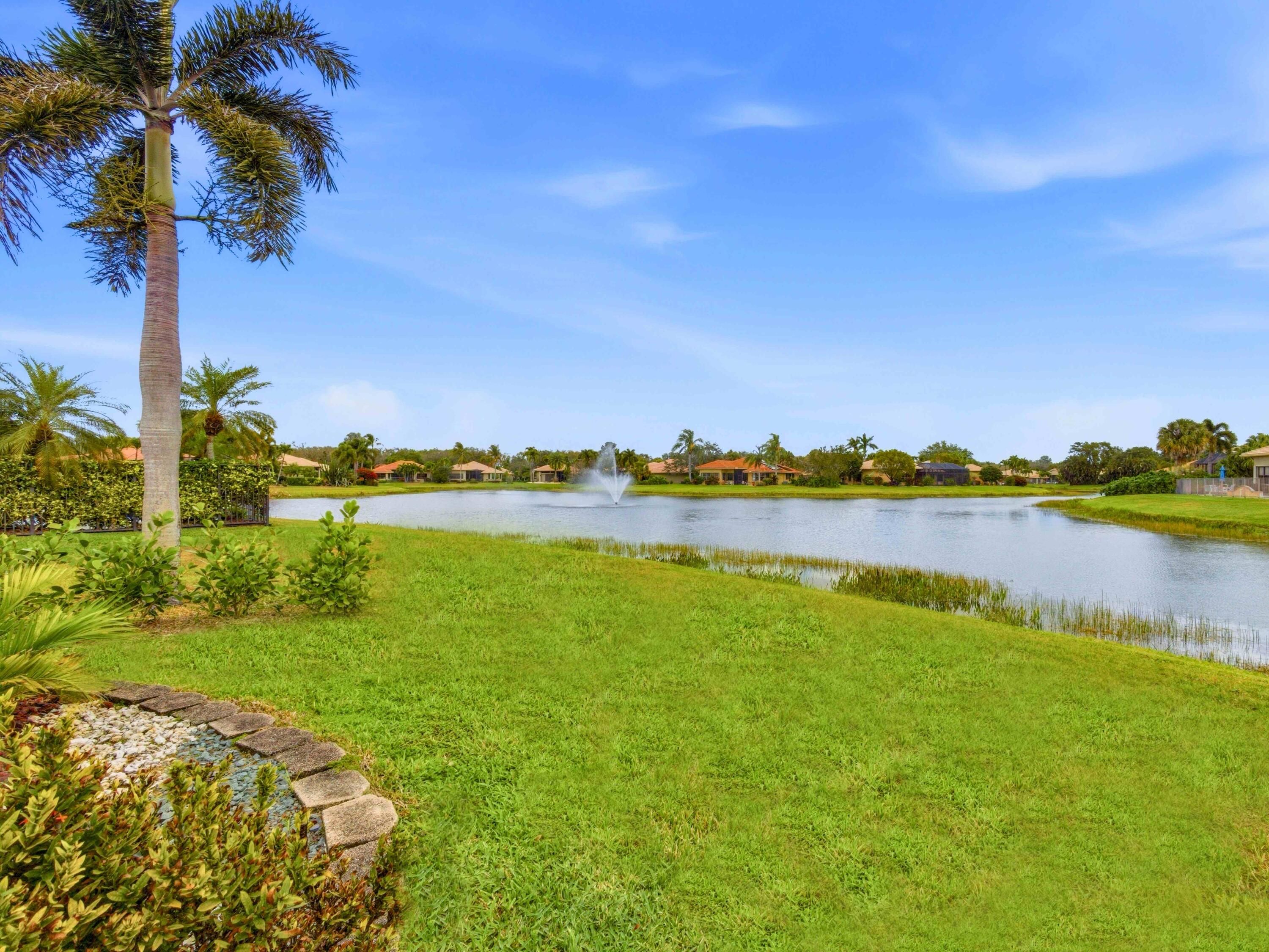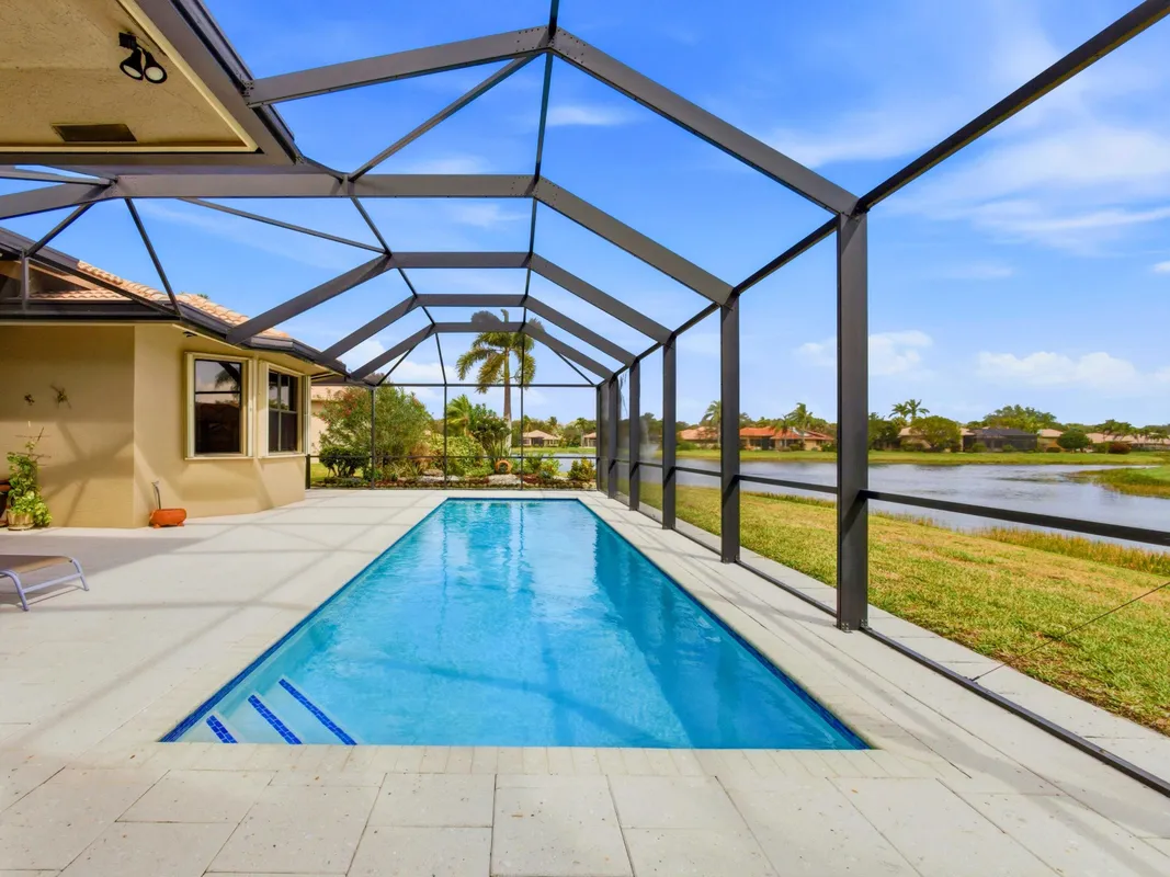 Welcome to peaceful lakeside living in this beautifully maintained home, nestled within a prestigious 55+ gated community. Perfectly positioned to capture magnificent lake views, this elegant one-story home offers both privacy and sophistication in a serene setting. The home features three spacious bedrooms, a versatile den, and three full bathrooms. Its thoughtfully designed three-way split floor plan provides exceptional privacy for both homeowners and guests. A welcoming foyer introduces the home's elegant interior, leading to a formal dining room, a refined living room, and a separate family room, all enhanced by crown molding that adds a touch of sophistication throughout the main living areas. The spacious open kitchen is thoughtfully designed for both functionality and style. It features granite counter top, stainless-steel refrigerator, microwave. Other features include a dishwasher, range, and dual wall ovens--perfect for everyday living and entertaining. Abundant cabinetry provides ample storage, while the generously sized kitchen island offers additional workspace and a natural gathering place for family and guests. The open layout allows the kitchen to flow seamlessly into the surrounding living areas, creating a bright and welcoming heart of the home. The primary suite is a true retreat, featuring two walk-in closets, a dedicated dressing table, and an en-suite bath with a separate soaking tub and walk-in shower. You will wake up to the breathtaking lake views right from your bedroom. Outdoor living is equally impressive. Step outside to your private screened patio showcasing a stunning 10' x 35' in-ground pool overlooking the tranquil lake. The pool was resurfaced and the pool deck redone in 2021. The new screen enclosure was installed at the same year. Accordion hurricane shutters provide added peace of mind, and the 2-car garage door is reinforced with hurricane-resistant beams. Additional updates include dual air-conditioning systems replaced in 2023 and 2024, ensuring year-round comfort. Beautifully designed landscaping enhances the home's curb appeal and reflects the exceptional care this property has received. The HOA fee covers lawn care and basic cable, along with exterior painting and roof cleaning every four years for added convenience. The community amenities feature a newly renovated clubhouse, resort-style pool, fitness center, card room, tennis courts, pickleball courts, and on-site management. The association requires a capital contribution equal to two quarters of HOA fees, and there is currently a special assessment of $341 per quarter for community updating. This well-maintained lakefront home offers the perfect blend of elegance and comfort living -- ready to welcome its next owner.