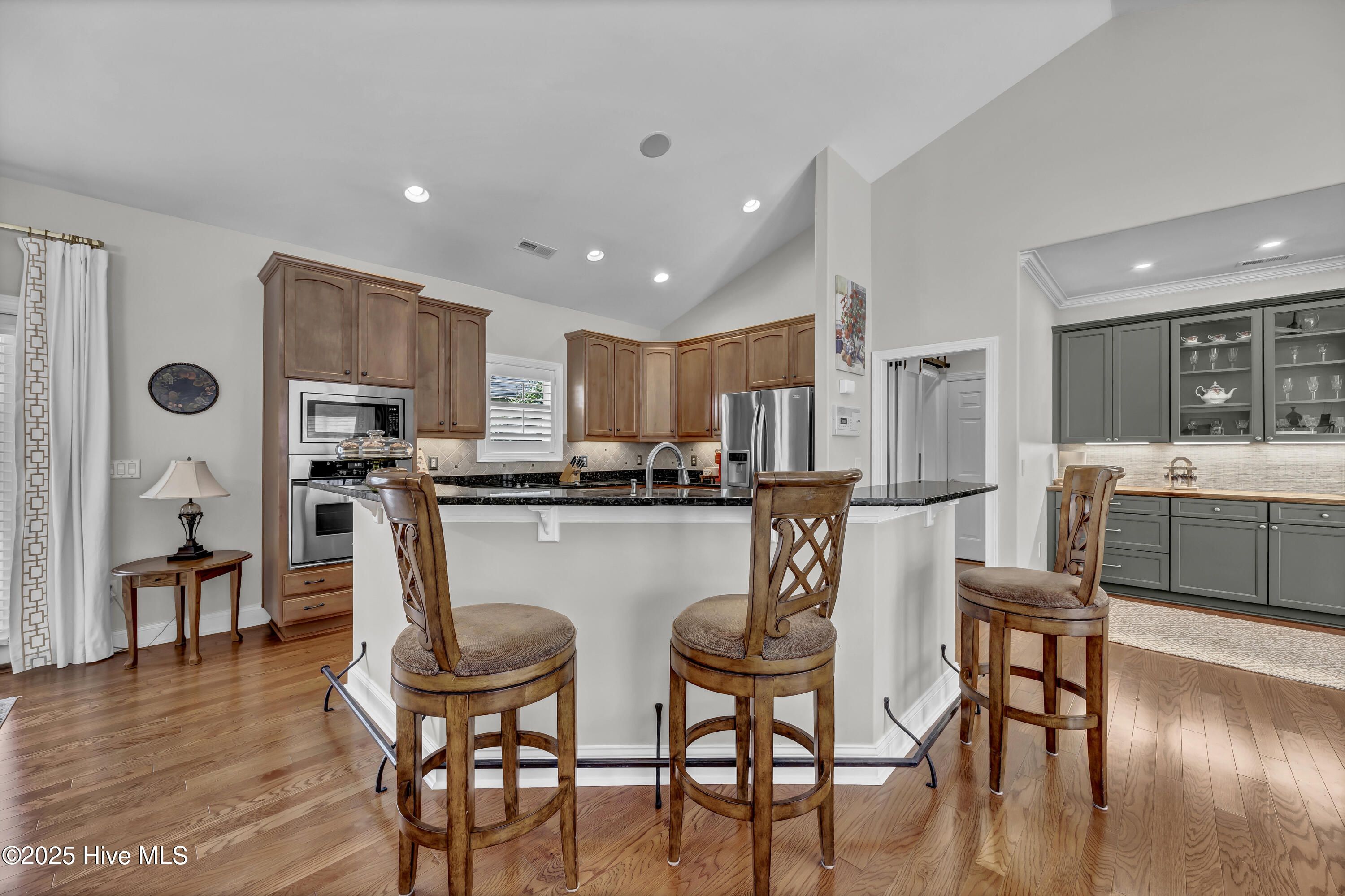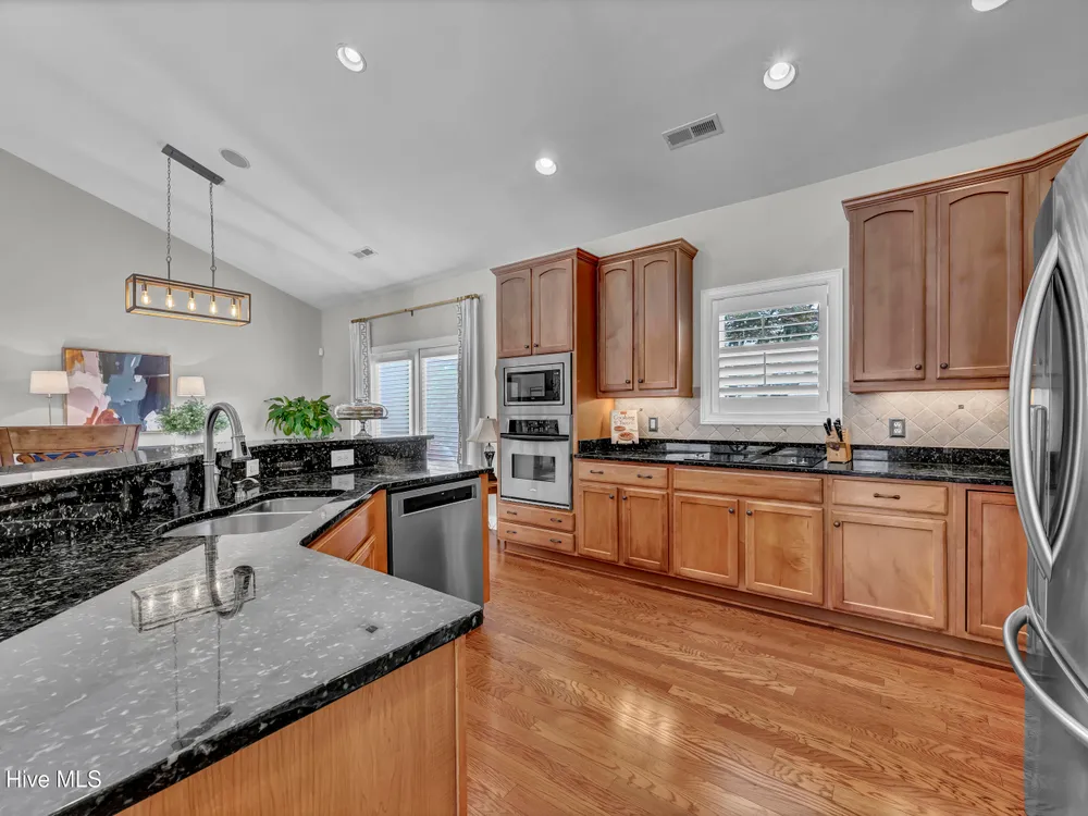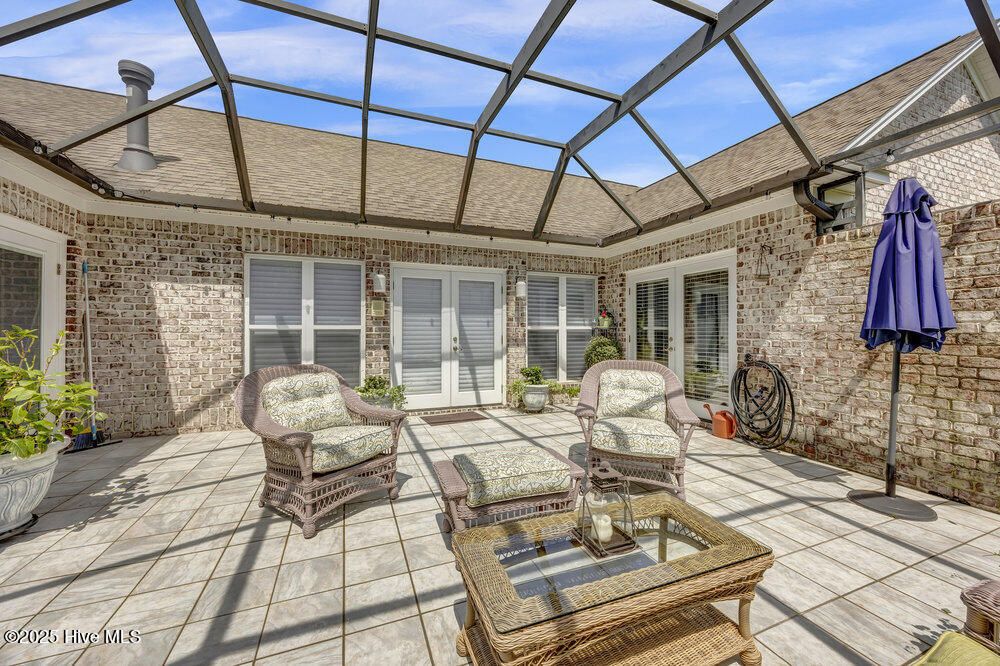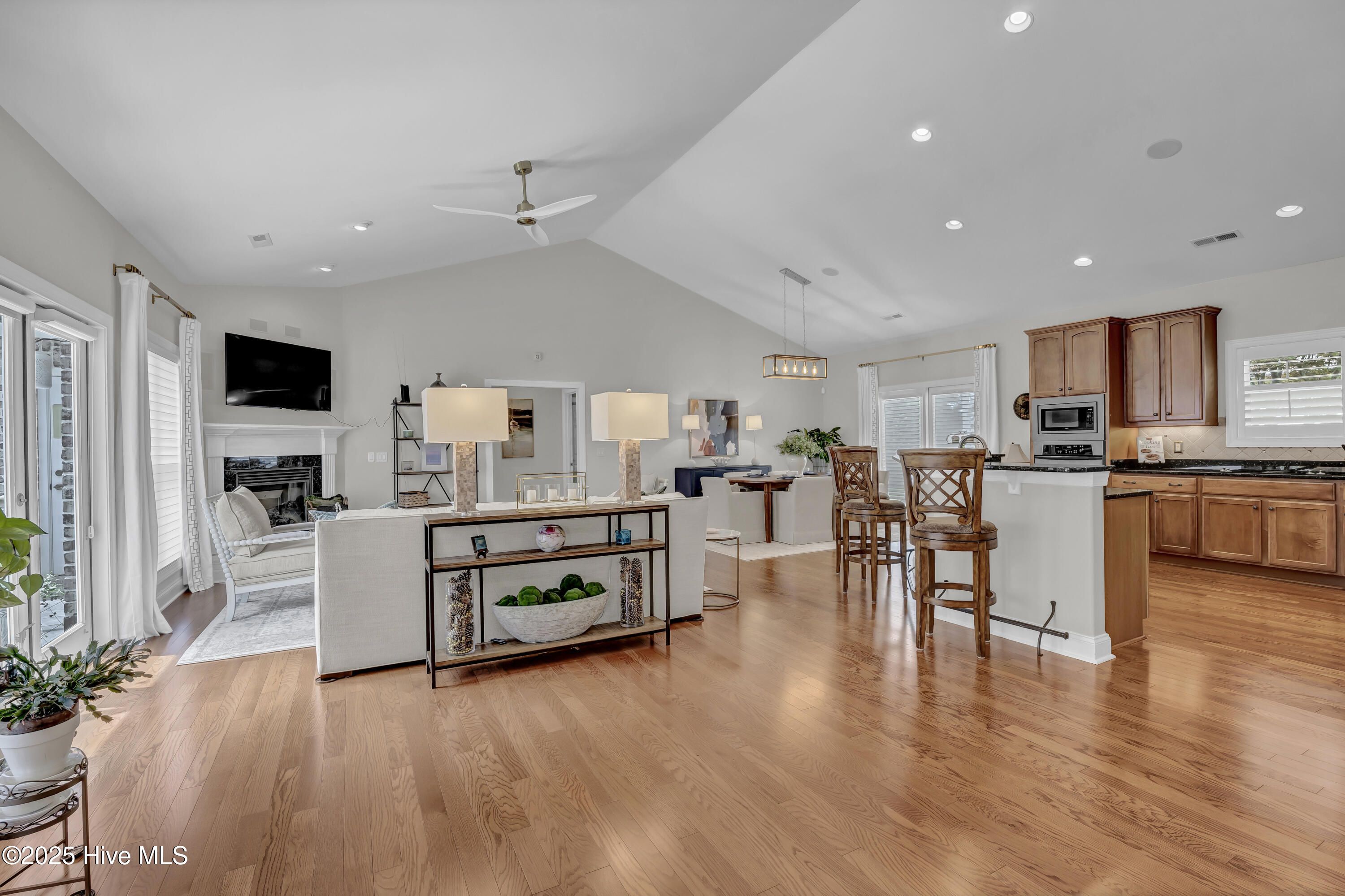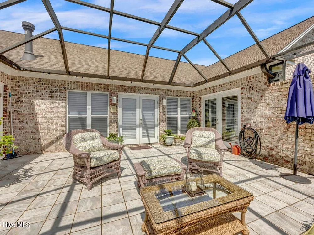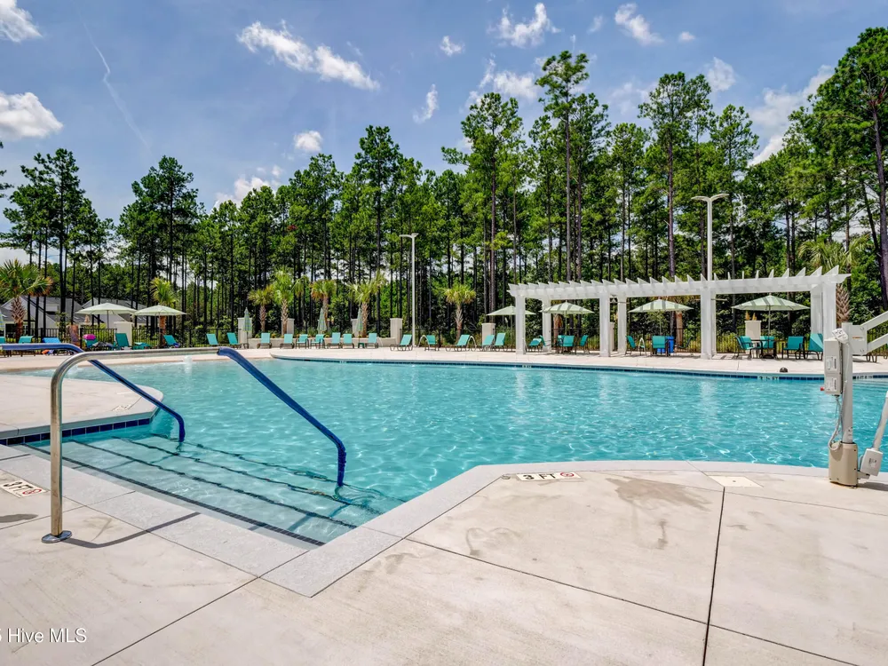 Located in a cul-de-sac within the Jefferson Landing neighborhood of Brunswick Forest, this beautifully updated, move-in ready home offers 2,227 sq ft of thoughtfully designed living space with tasteful upgrades throughout. The 3-bedroom, 2.5-bath layout includes select accessibility modifications, such as widened doorways and halls in certain areas, offering added functionality without sacrificing style.The main living area features soaring vaulted ceilings that create an open and airy feel, seamlessly connecting to the kitchen and dining areas. The kitchen boasts granite countertops, stainless steel appliances, and abundant cabinet space -- plus a custom-installed dry bar perfect for entertaining. A versatile office or flex space sits at the front of the home, ideal for working remotely or relaxing.The spacious primary suite includes a walk-in closet and a spa-like bathroom with a soaking tub, tiled walk-in shower, and double vanity. Engineered hardwood floors can be found throughout the home. Outdoor living is a highlight, with two distinct spaces: a covered lanai on one side of the home and a separate patio with a pergola on the other -- offering flexibility for both relaxing and hosting. Additional features include an epoxy-coated garage floor and freshly painted garage walls. Updated mechanicals include a new HVAC system in 2018 and hot water heater in 2021.Set on a 0.31-acre lot in one of the area's most popular master-planned communities, this home offers comfort, quality, and convenience in a sought-after location just minutes from downtown Wilmington.