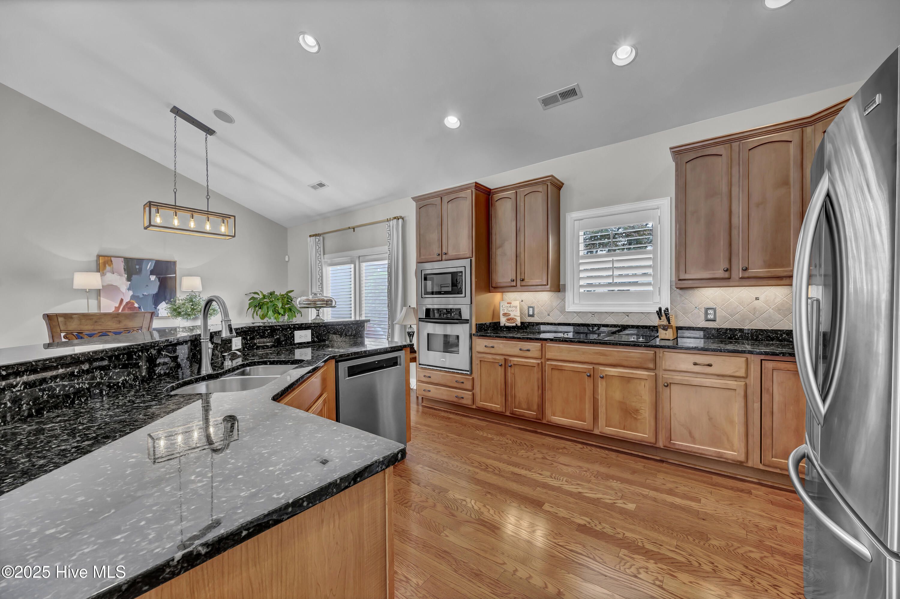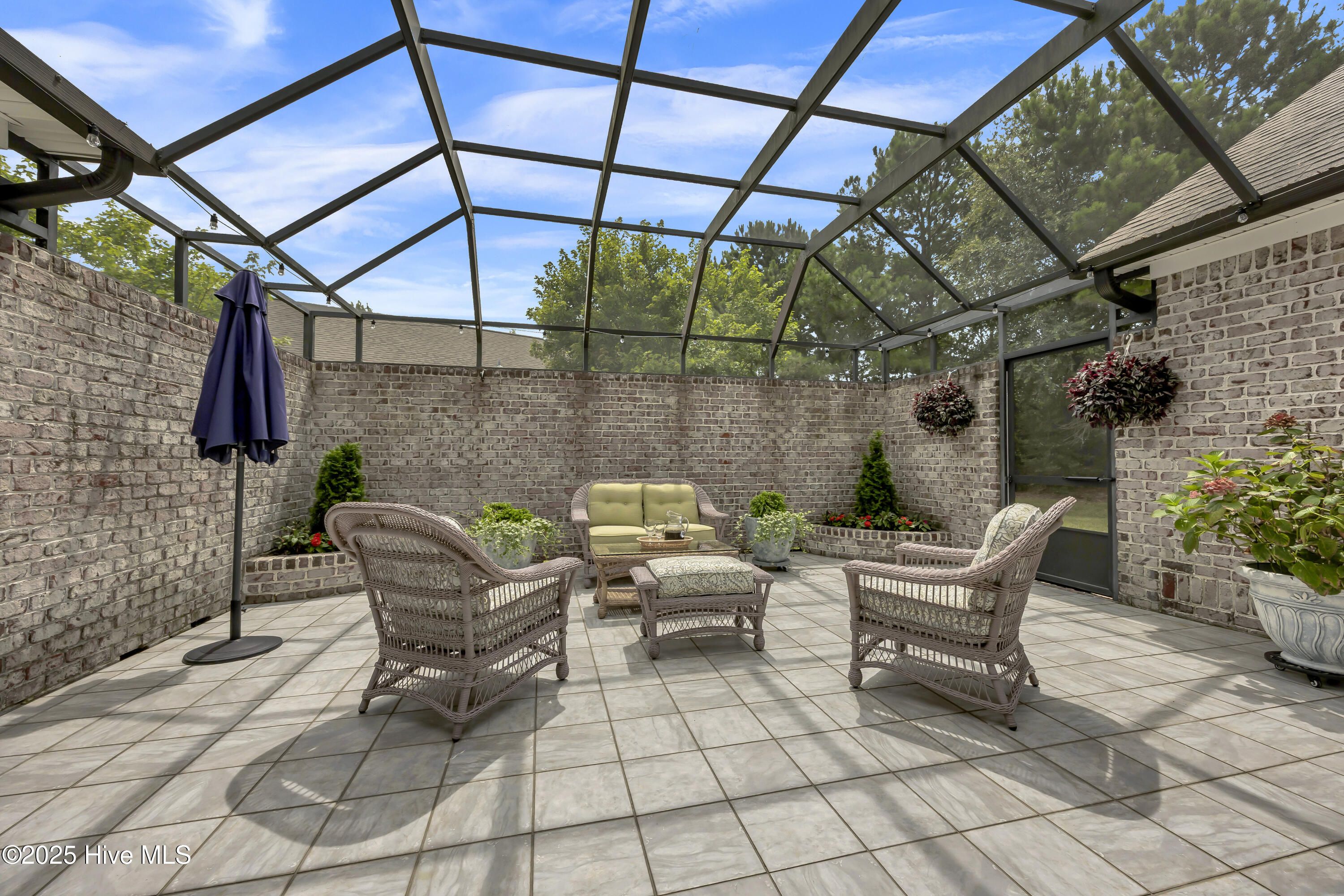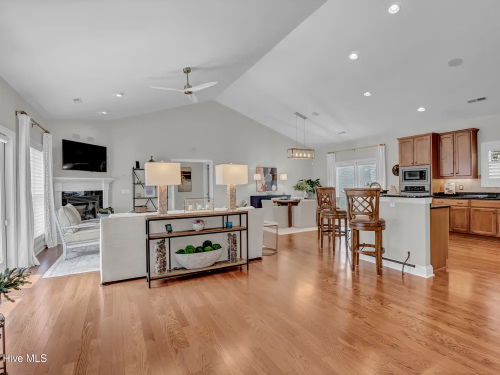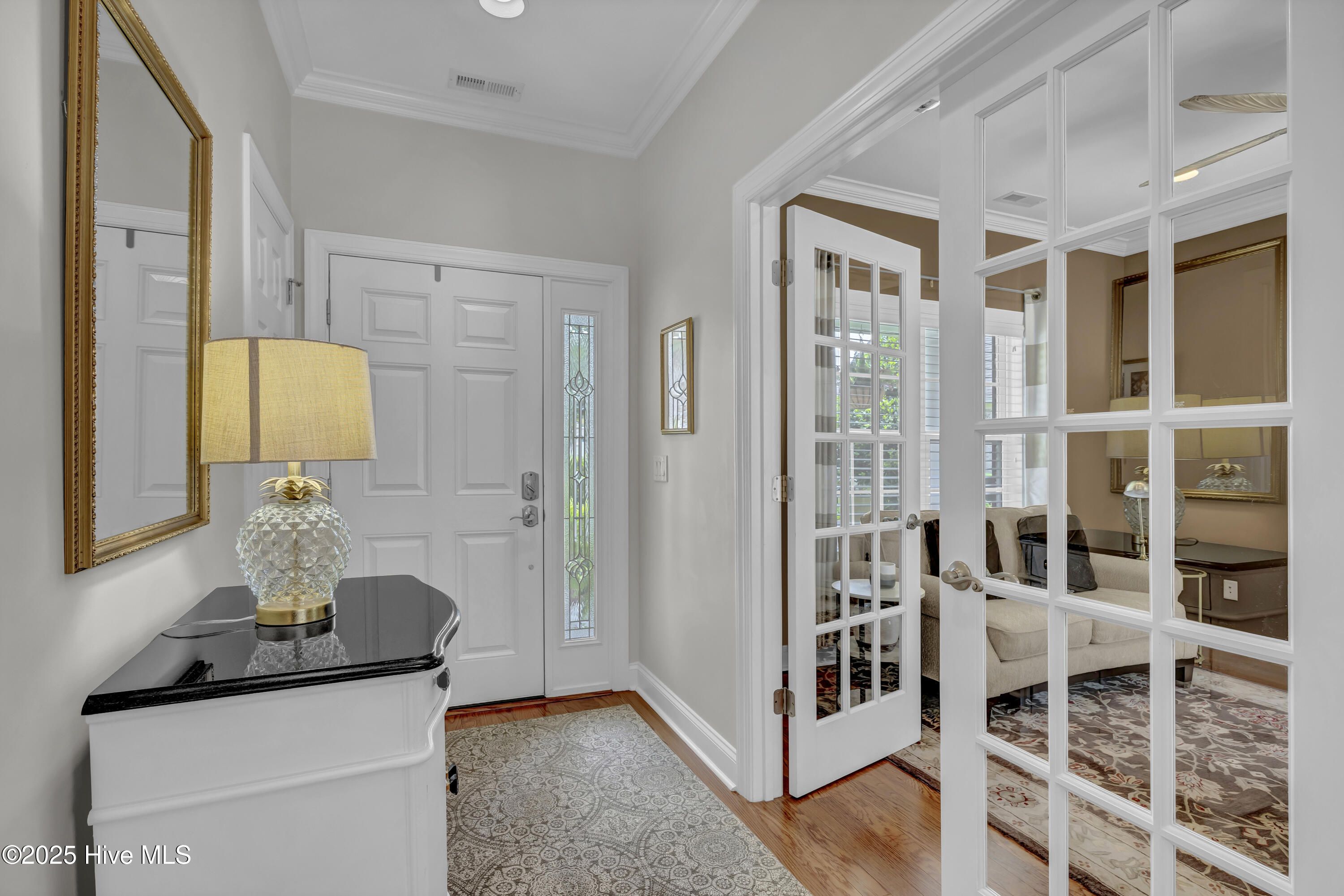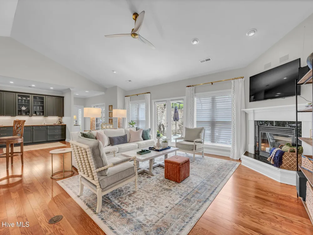 Located in a cul-de-sac within the Jefferson Landing neighborhood of Brunswick Forest, this beautifully updated, move-in ready home offers 2,227 sq ft of thoughtfully designed living space with tasteful upgrades throughout. The 3-bedroom, 2.5-bath layout includes select accessibility modifications, such as widened doorways and halls in certain areas, offering added functionality without sacrificing style.The main living area features soaring vaulted ceilings that create an open and airy feel, seamlessly connecting to the kitchen and dining areas. The kitchen boasts granite countertops, stainless steel appliances, and abundant cabinet space -- plus a custom-installed dry bar perfect for entertaining. A versatile office or flex space sits at the front of the home, ideal for working remotely or relaxing.The spacious primary suite includes a walk-in closet and a spa-like bathroom with a soaking tub, tiled walk-in shower, and double vanity. Engineered hardwood floors can be found throughout the home. Outdoor living is a highlight, with two distinct spaces: a covered lanai on one side of the home and a separate patio with a pergola on the other -- offering flexibility for both relaxing and hosting. Additional features include an epoxy-coated garage floor and freshly painted garage walls. Updated mechanicals include a new HVAC system in 2018 and hot water heater in 2021.Set on a 0.31-acre lot in one of the area's most popular master-planned communities, this home offers comfort, quality, and convenience in a sought-after location just minutes from downtown Wilmington.