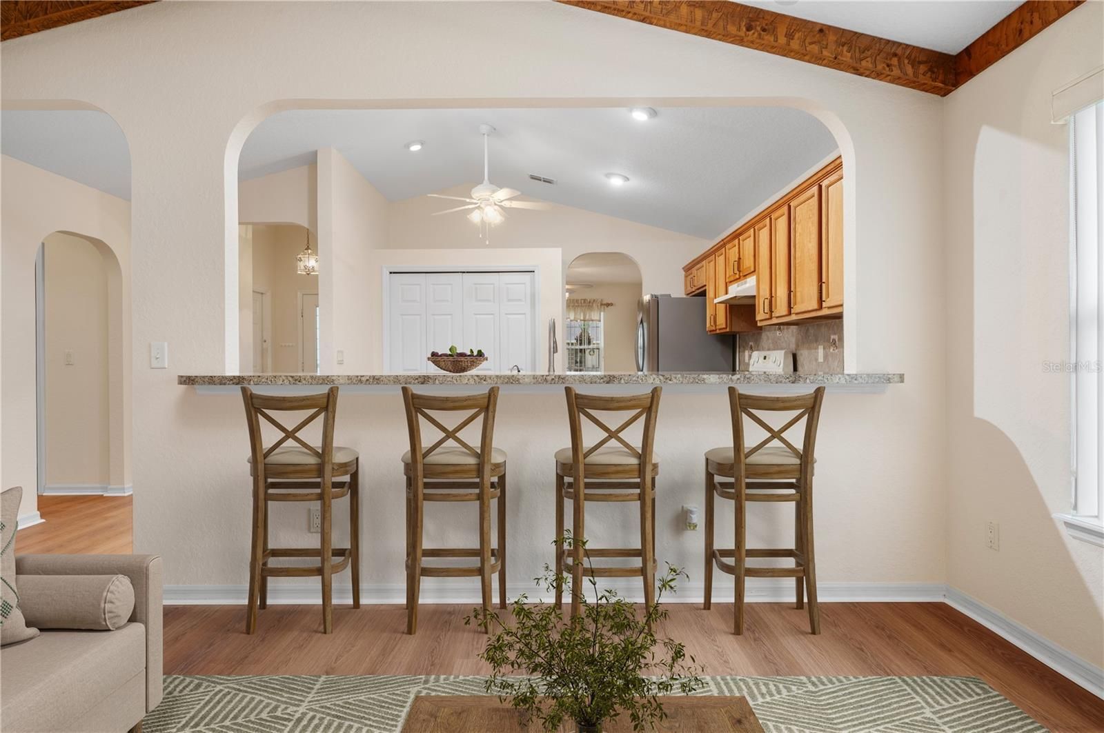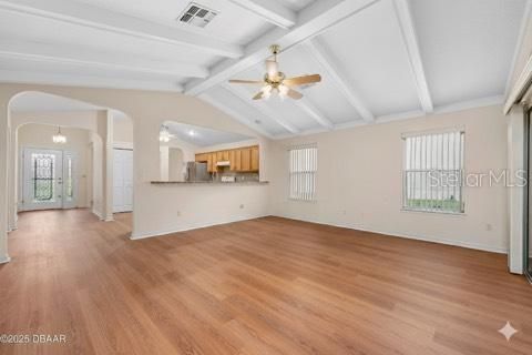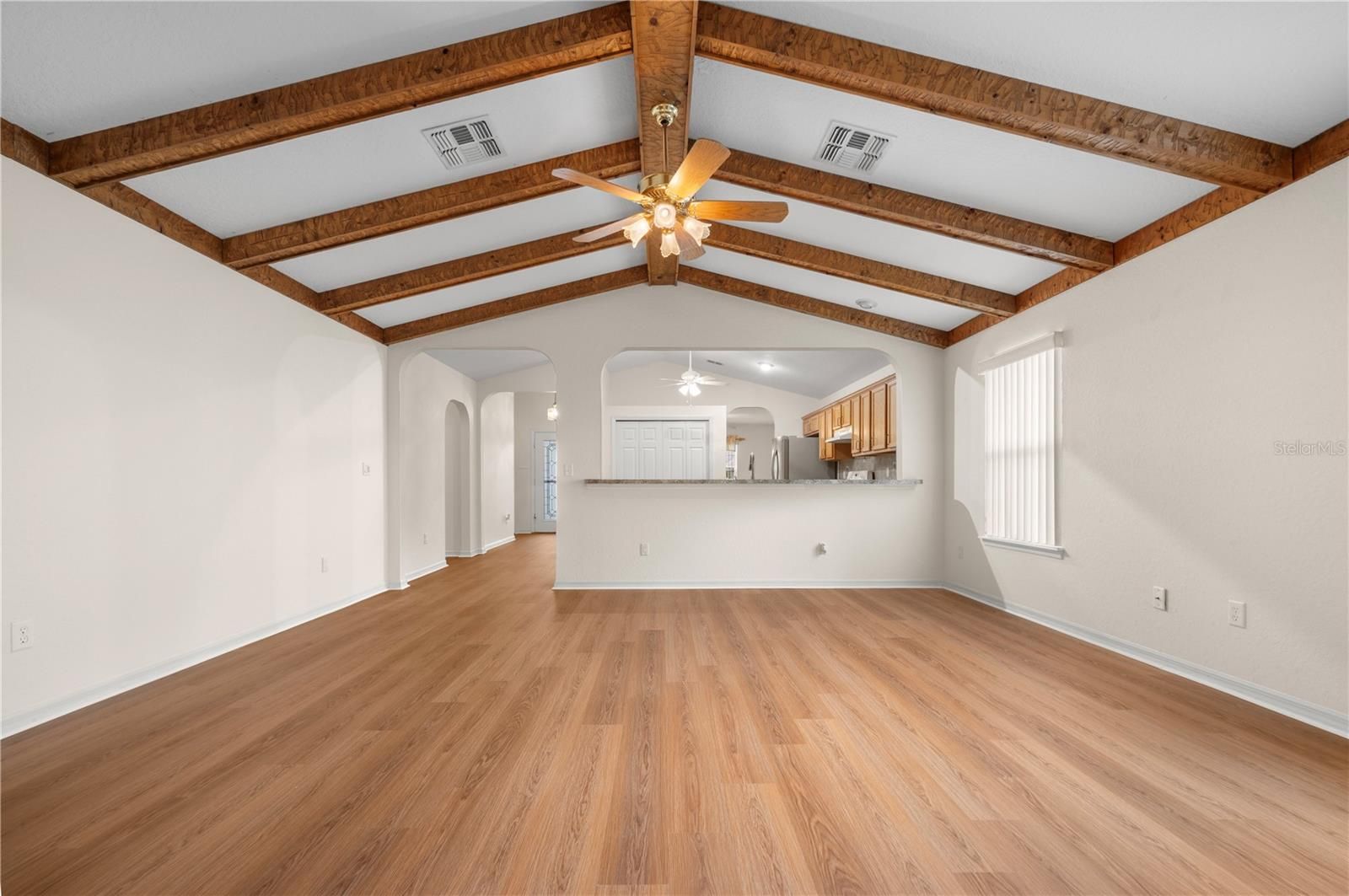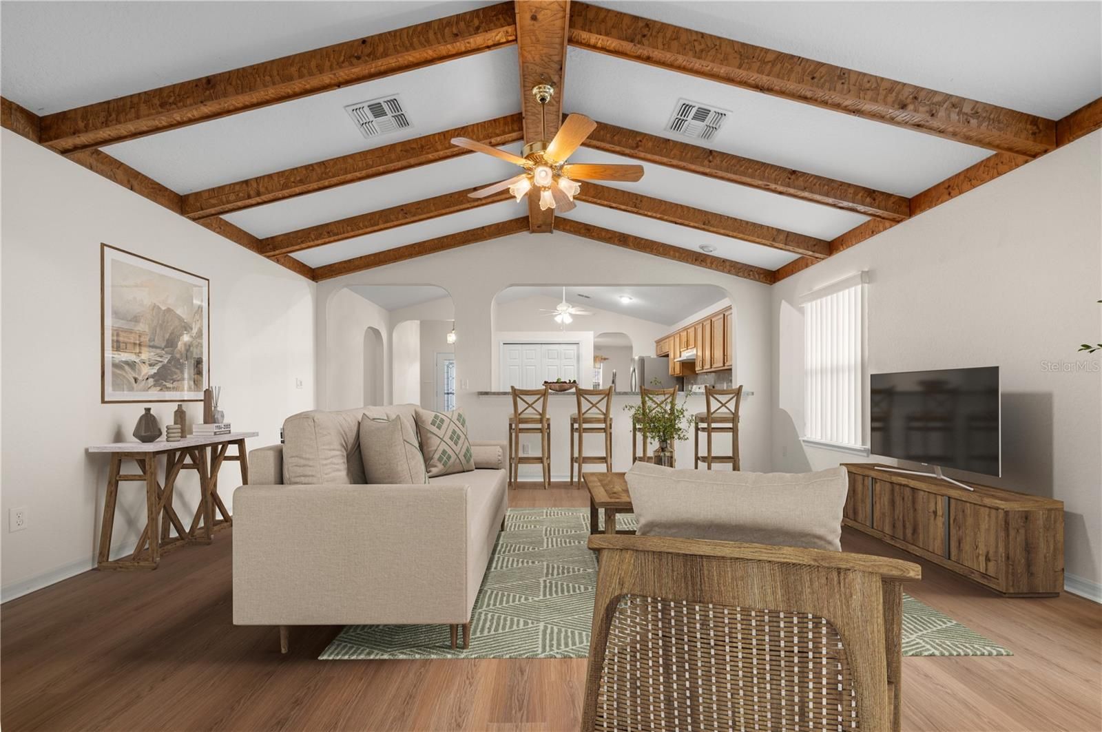 Welcome to life in Stonecrest — one of Central Florida’s most sought-after 55+ active adult communities, nestled in the scenic rolling hills of Summerfield. This beautifully maintained 3-bedroom, 2-bathroom home offers the perfect blend of comfort, style, and community living - WITH BRAND NEW FLOORING. Step inside and you’ll immediately notice the light and airy feel of the open floor plan, made even more stunning by soaring vaulted ceilings with gorgeous exposed beams that add a touch of charm and character. The spacious living room flows seamlessly into the eat-in kitchen, where you’ll find plenty of counter space and natural light — perfect for your morning coffee or entertaining friends. The split-bedroom layout offers privacy for both you and your guests. The primary suite is generously sized and features an en suite bathroom and walk-in closet, while the two guest bedrooms sit on the opposite side of the home. Throughout the home, beautiful wood flooring adds warmth, with ceramic tile in the bathrooms for easy upkeep. You’ll also love the convenience of an indoor laundry room and the peace of mind that comes with a brand new roof in 2024 and a reverse osmosis water purification system already in place. Step out back to relax in your screened-in lanai with acrylic windows, allowing you to enjoy the Florida weather in comfort all year long. Living in Stonecrest means enjoying a country club lifestyle without ever leaving your neighborhood. This amenity-rich, gated golf cart community features a 12-acre world-class Recreation Complex, four sparkling pools (including a saltwater pool), two off-leash dog parks, state-of-the-art fitness center, two clubhouses, tournament-quality billiards, tennis, shuffleboard, bocce, and more. With a full-time onsite Activities Director, over 80 social clubs and interest groups, live entertainment, and a golf course with its own restaurant — every day can feel like a vacation. Don’t miss the chance to enjoy all that this vibrant lifestyle has to offer — schedule your private showing today! ***SELLER WILL HAVE THE BEAMS PAINTED ANY COLOR THE BUYER WANTS, WITH ACCEPTABLE OFFER***