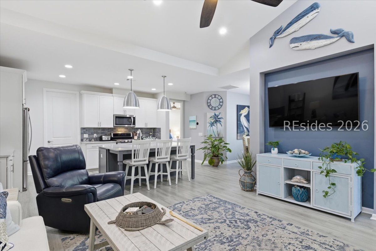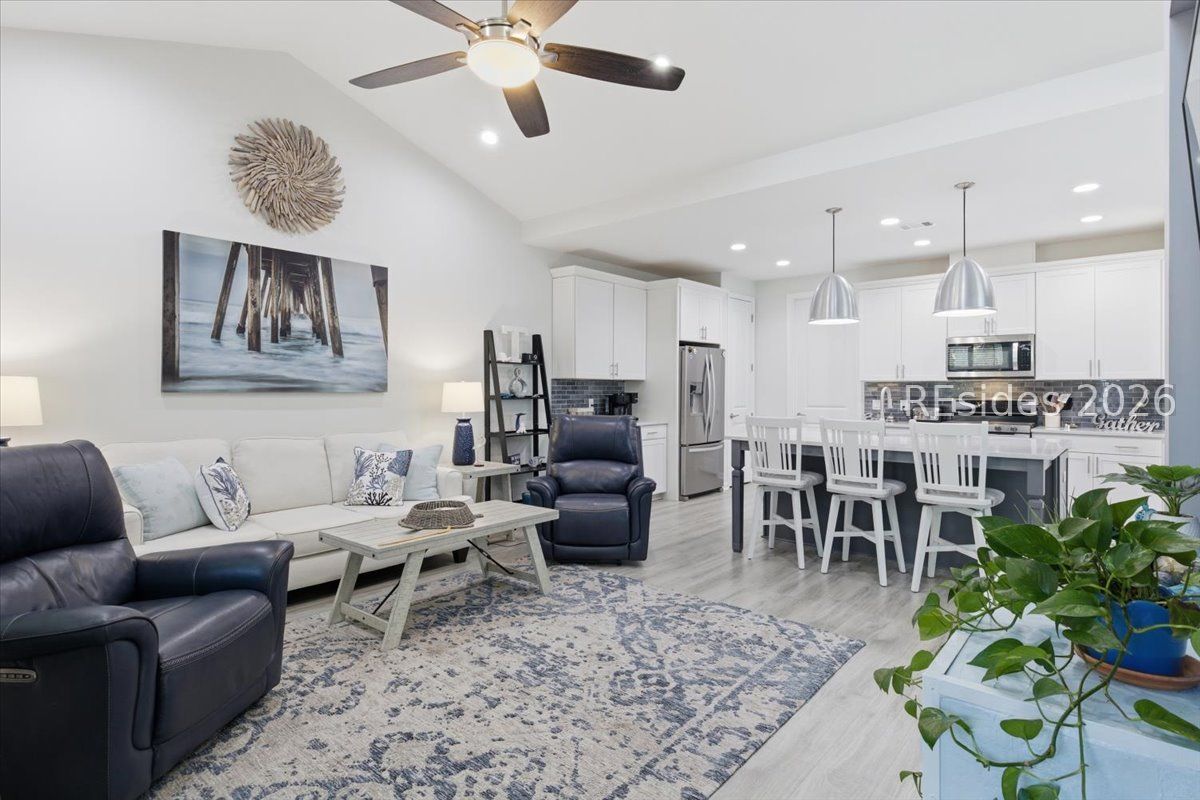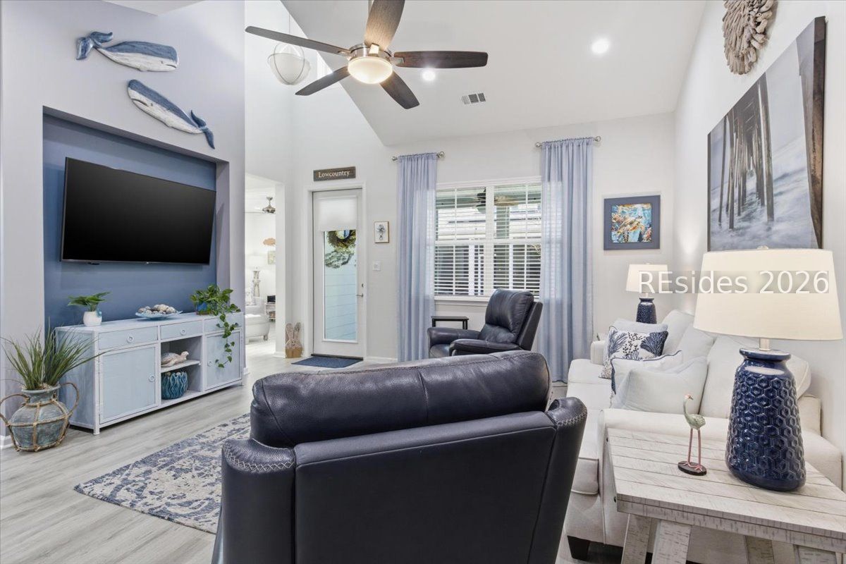 Welcome to your own slice of paradise in the vibrant, resort-style community of Latitude Margaritaville Hilton Head! This beautifully appointed Camellia Cottage offers the perfect blend of comfort, style, and laid-back coastal living. Designed with an open-concept layout and soaring vaulted ceilings, the home features two spacious bedrooms and two full bathrooms, along with a bright and airy living room that seamlessly flows into a dedicated dining area-ideal for both everyday living and entertaining.The gourmet kitchen is a true centerpiece, complete with a double oven gas range, extended island counter, 42" cabinetry with elegant crown molding, a generous pantry, and custom lighting complemented by recessed fixtures throughout. Thoughtful upgrades continue with 8-foot interior doors, a well-equipped laundry room with built-in cabinetry, and a guest bathroom featuring a beautifully tiled bathtub. The two-car garage boasts a durable epoxy floor, adding both function and style.Step outside to unwind in your private screened-in lanai-perfect for enjoying morning coffee or evening breezes in total comfort.Living in Latitude Margaritaville means embracing a lifestyle that feels like a permanent vacation. Residents enjoy world-class amenities including a resort-style pool with beach entry, a state-of-the-art fitness center, pickleball and tennis courts, walking and biking trails, an on-site restaurant and bar, live music and entertainment at the amphitheater, and a full calendar of social clubs, classes, and events designed to keep you as active-or relaxed-as you choose. This is more than a home; it's a lifestyle where every day feels like a getaway.