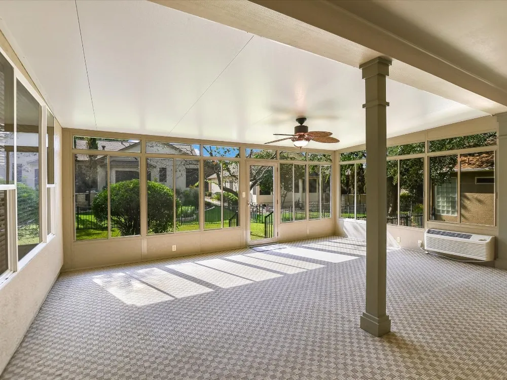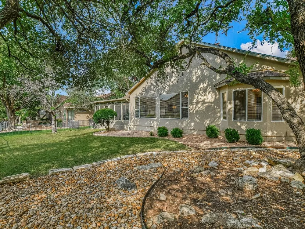 Discover the spacious charm of this beautifully modified Travis plan, perfectly situated in the heart of Sun City Texas. Designed for ease and comfort, this home features no-step entries, providing effortless access at every entrance—a thoughtful detail that enhances daily living and peace of mind. The welcoming great room is truly the centerpiece of the home, featuring a cozy fireplace framed by custom cabinetry and two walls of windows that bathe the space in natural light—an ideal setting for gatherings with family and friends. The kitchen blends timeless Old-World character with modern functionality, showcasing antique white cabinetry, tiled countertops, rubbed bronze hardware, and sleek stainless-steel appliances. Just off the foyer, a formal dining area sets the stage for memorable meals, while an adjoining sitting room offers a versatile space that could host a baby grand piano or showcase your favorite collectibles. A highlight of this home is the expansive 20’ x 20’ sunroom, offering flexible living space perfect for entertaining, hobbies, or simply relaxing. The private primary suite is tucked away in its own alcove and overlooks the backyard. Its spa-inspired bath features a raised garden tub illuminated by a glass block window, creating a serene retreat. On the opposite side of the home, guests will appreciate the privacy of a spacious bedroom with a bay win dow and treed views. A third bedroom, complete with built-in desks and cabinetry, makes for a well-appointed home office.Additional features include a cozy craft room conveniently located off the garage entry and an extended garage with a gleaming epoxy floor, utility sink, and generous storage to keep everything organized. With easy access to all three Sun City golf courses and within walking distance to the main activity and fitness centers as well as the nearby commercial hub, this home offers the perfect balance of comfort, style, and convenience for an active Sun City lifestyle.