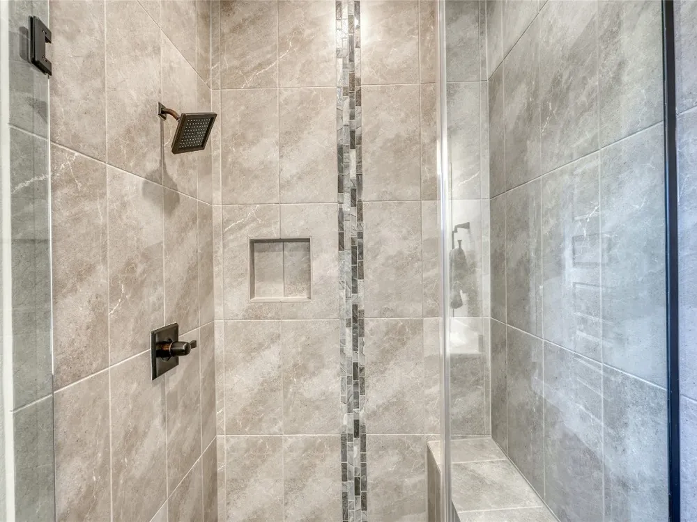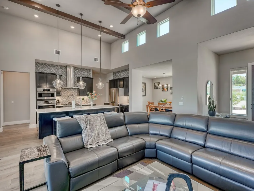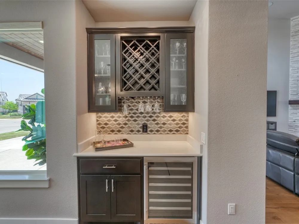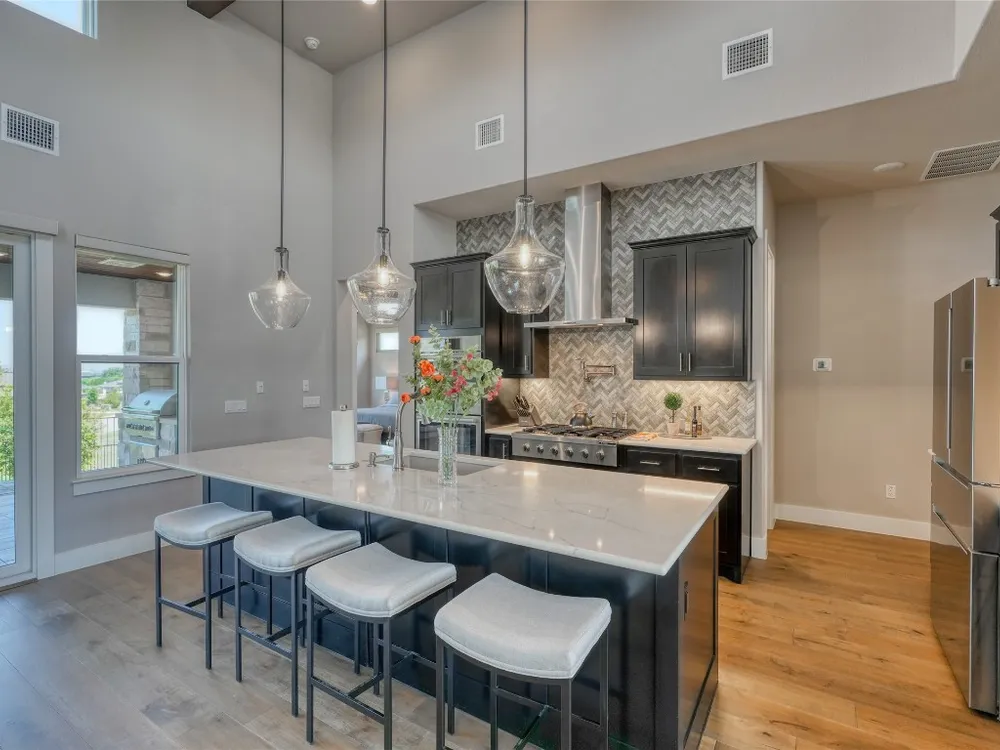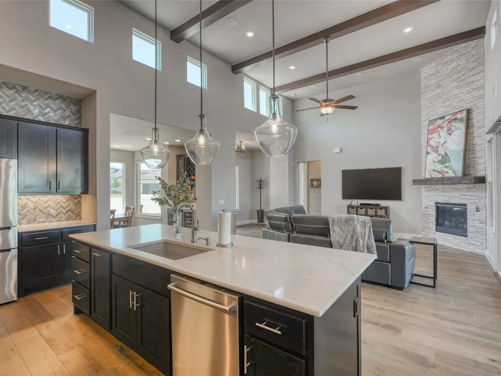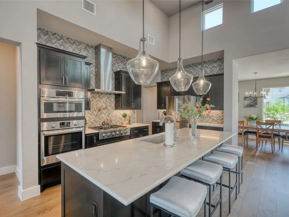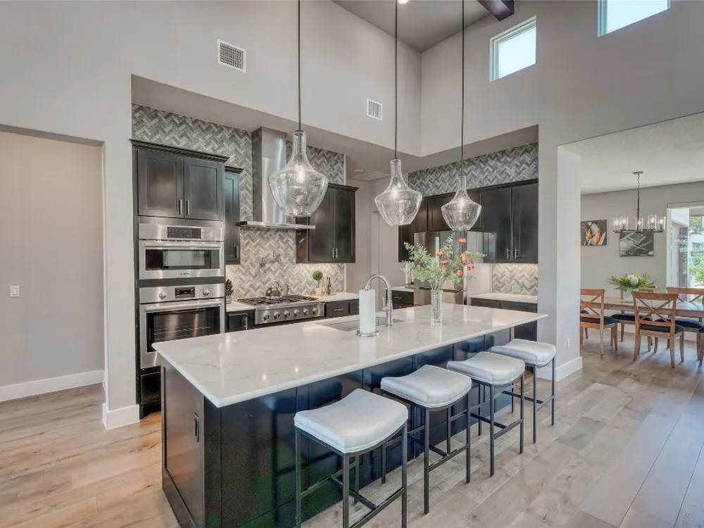 - Breakfast Bar, Built-in Features, Cathedral Ceiling(s), Dry Bar, Double Vanity, Entrance Foyer, Eat-in Kitchen, High Ceilings, Kitchen Island, Main Level Primary, NoInteriorSteps, Open Floorplan, Pantry, Quartz Countertops, Stone Counters, Sound System, Storage, Smart Thermostat, Tile Counters, Wired for Data, Bar