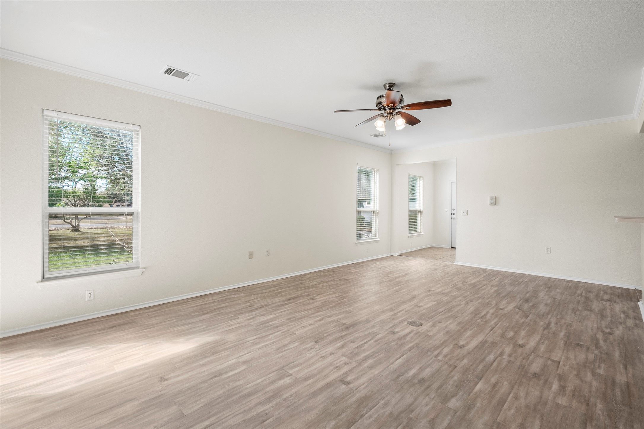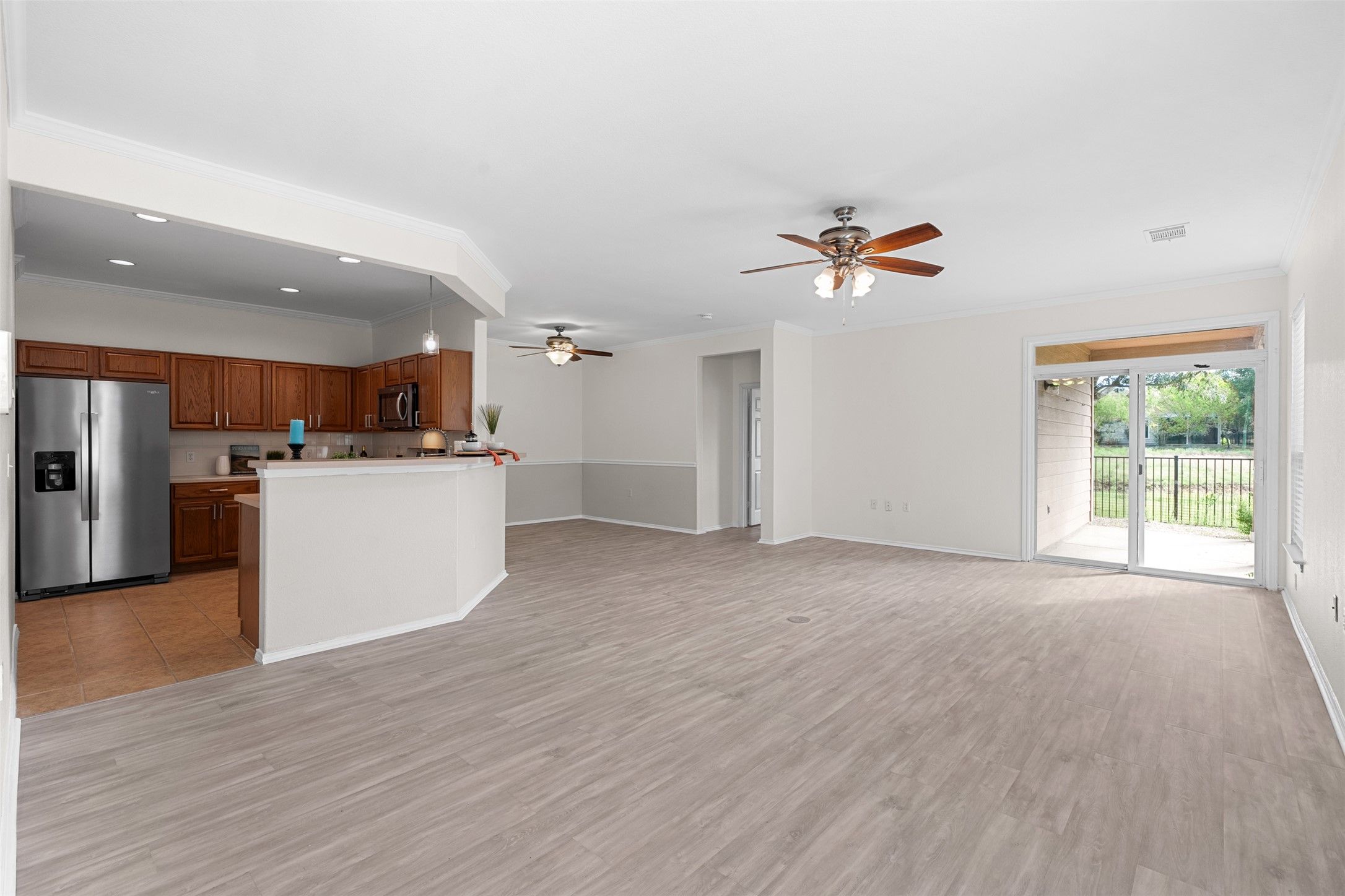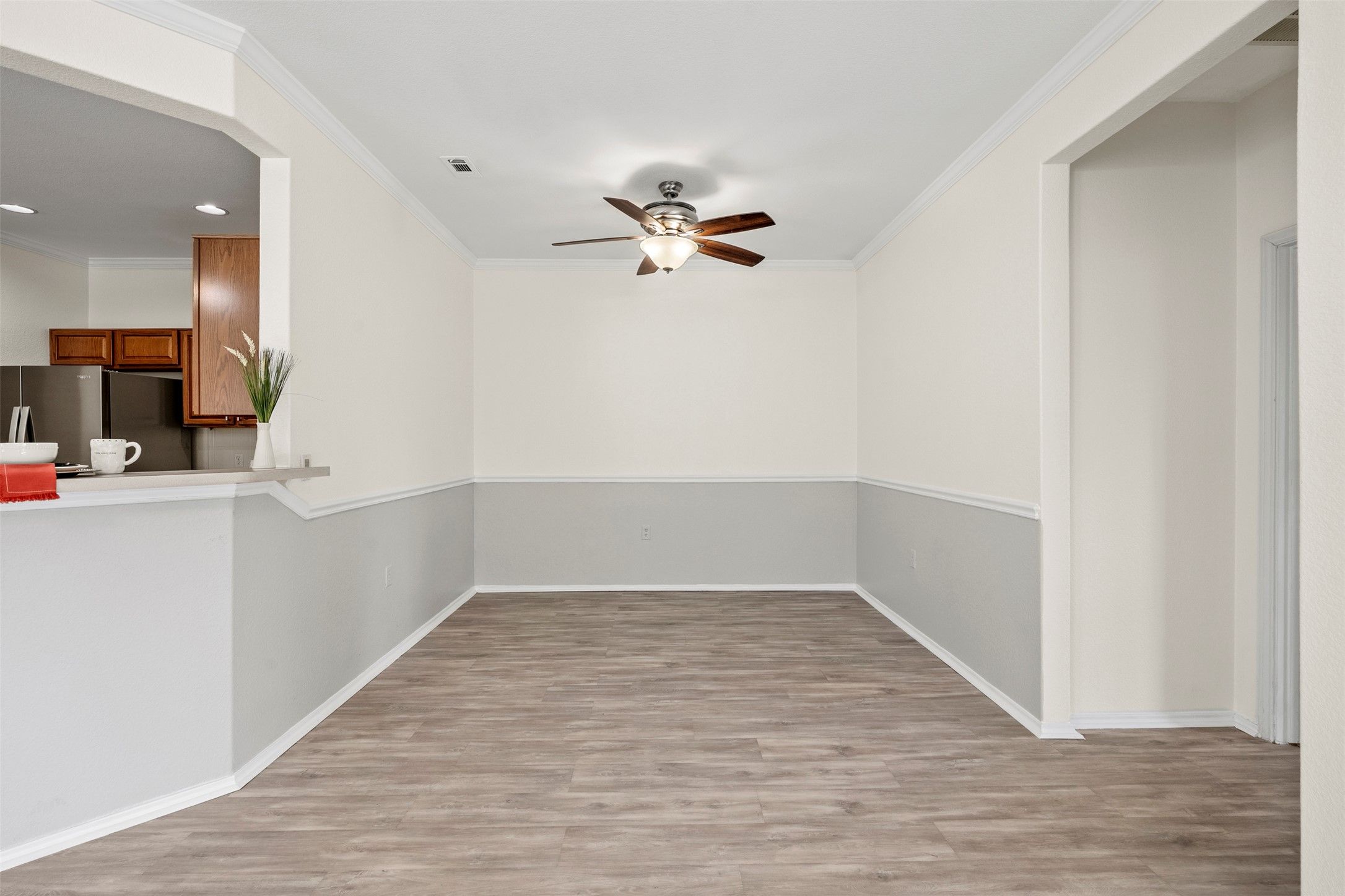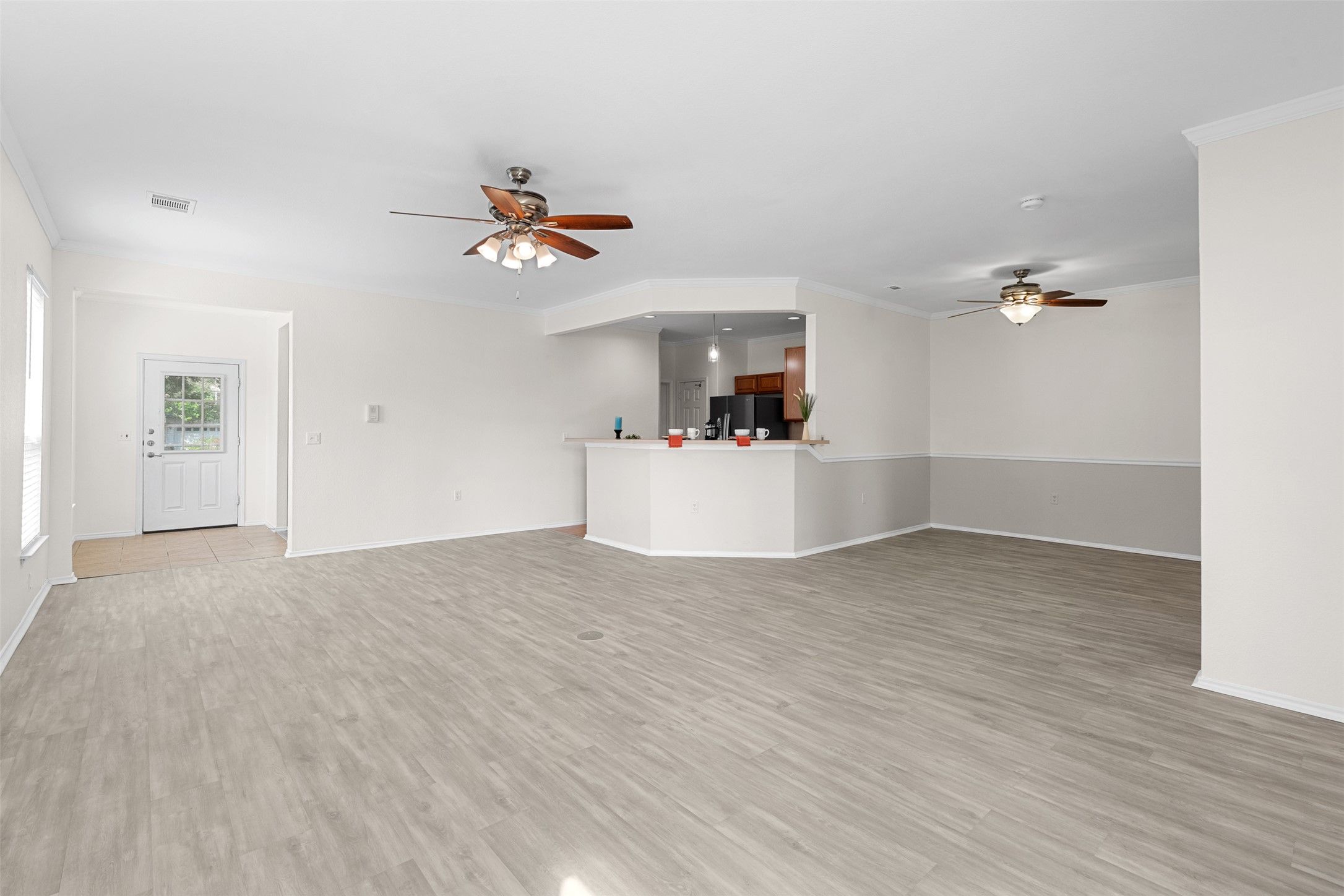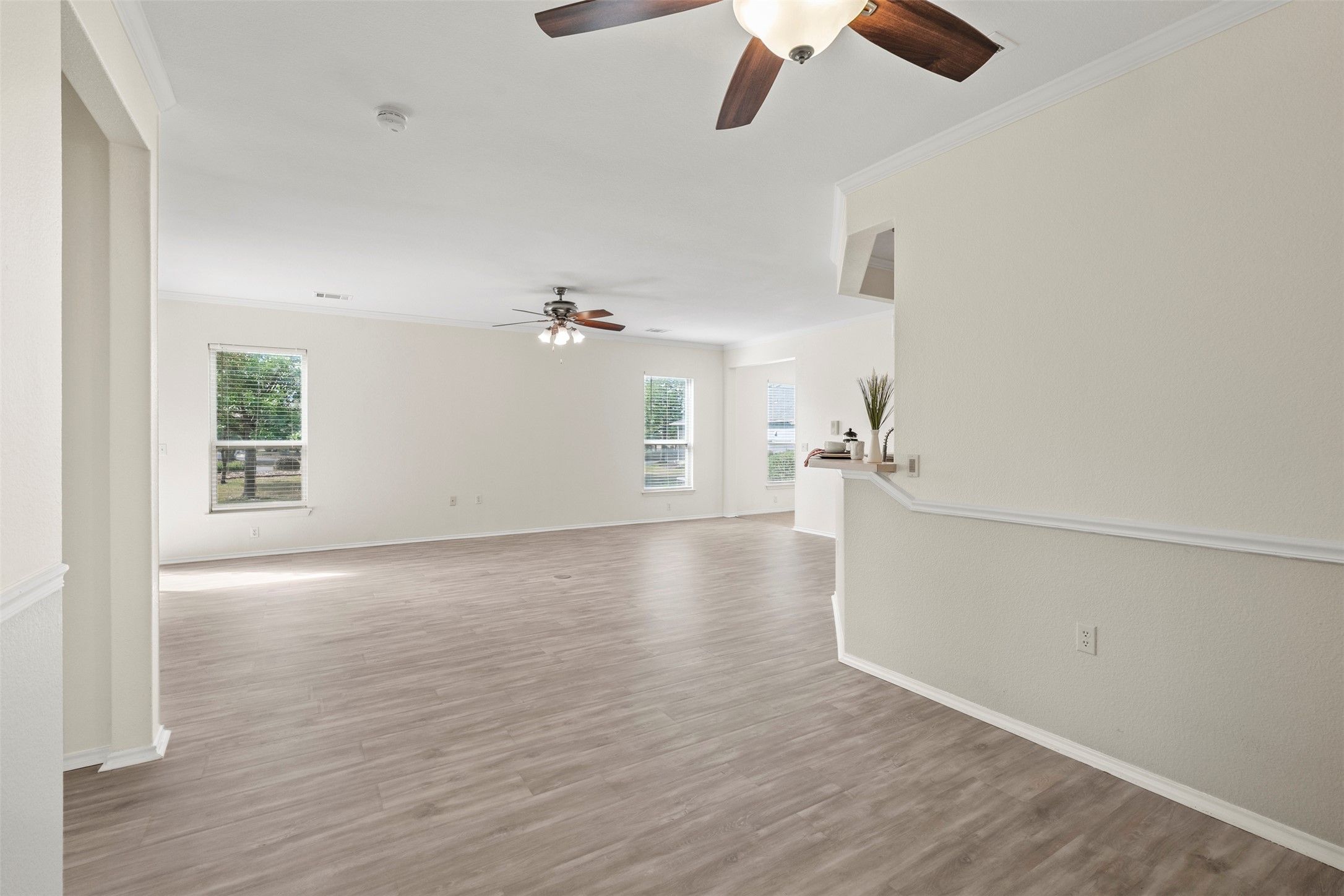 - Ceiling Fan(s), Crown Molding, Kitchen Island, Laminate Counters, NoInteriorSteps, Open Floorplan, Recessed Lighting