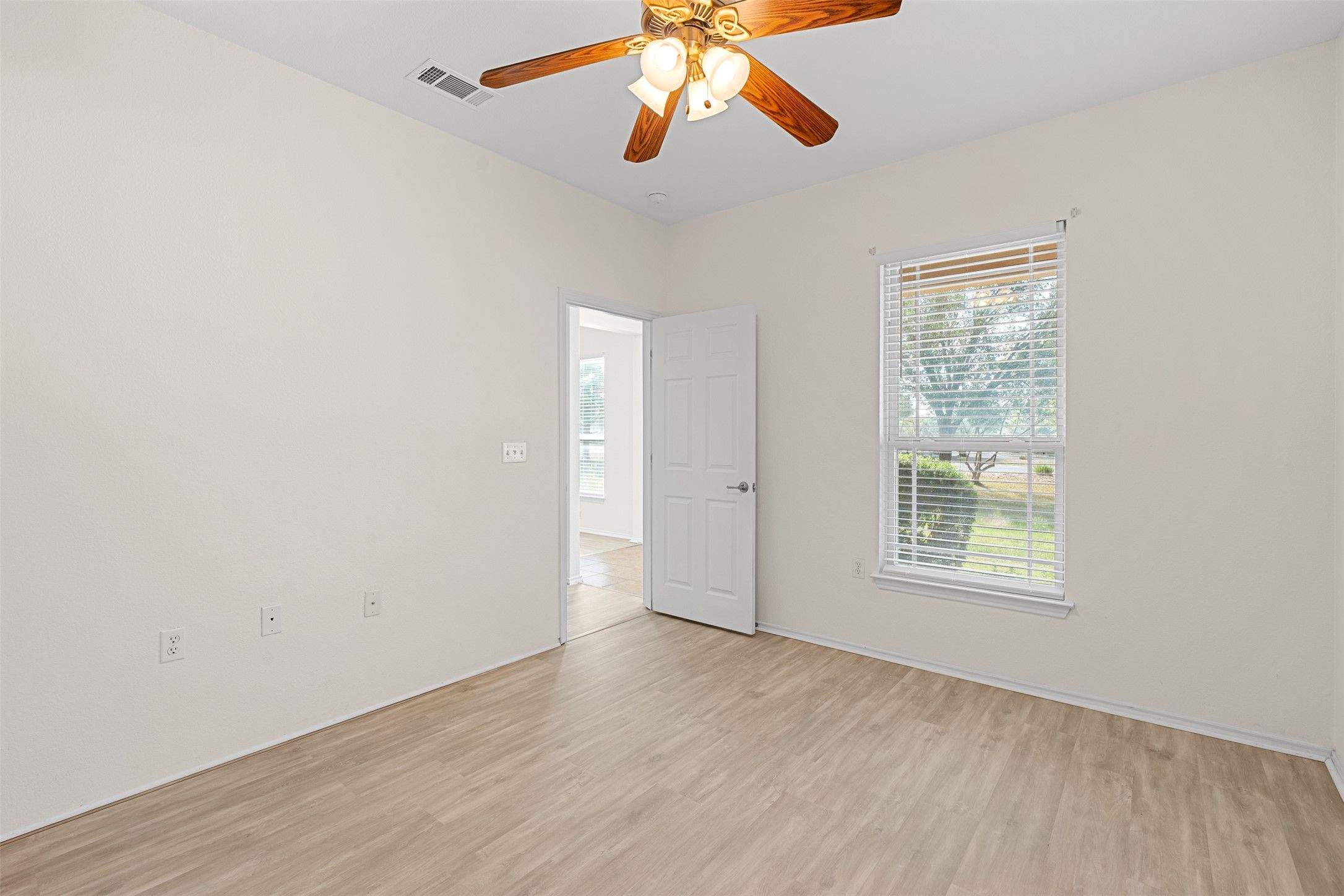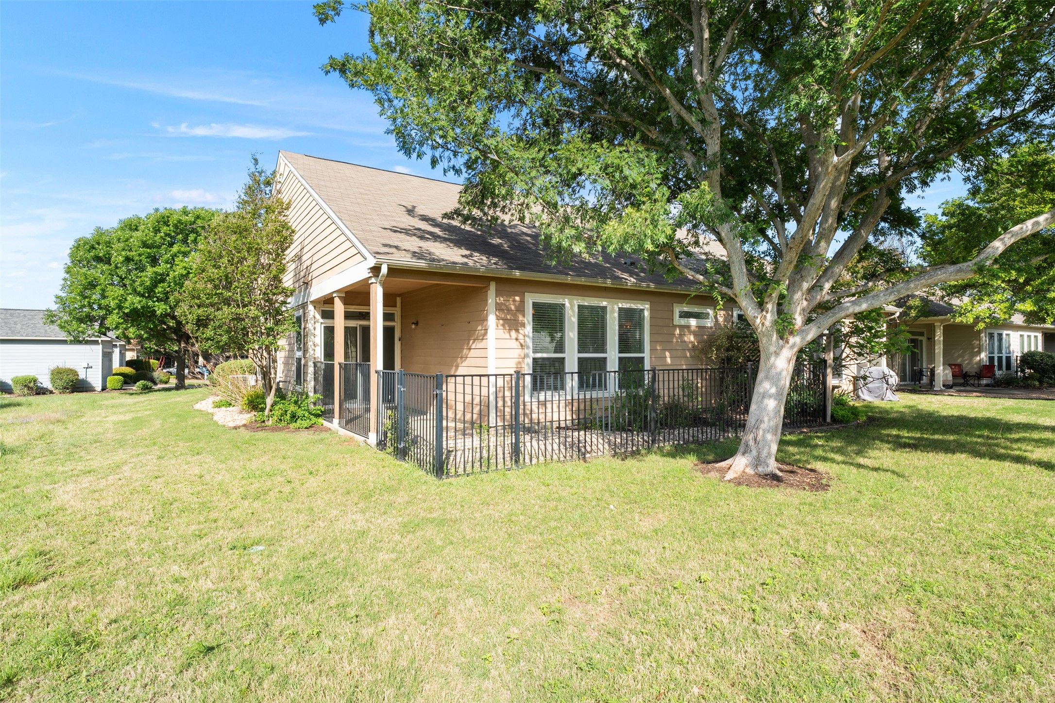 Lock-and-leave living in Sun City, Georgetown! Tucked away on a quaint cul-de-sac in the heart of Sun City, this Newport Cottage floorplan offers 1,397 square feet with 2 bedrooms and 2 bathrooms. Hard flooring runs throughout, complemented by neutral interior paint for a clean, move-in-ready feel. Priced to sell and currently the lowest-priced home at the time of listing. The open-concept layout is ideal for entertaining, creating an easy flow between the living, dining, and kitchen spaces. The kitchen features stainless steel appliances, Formica countertops, and an updated decorative light fixture above the sink. The spacious primary suite includes an ensuite bath with dual vanities, a walk-in shower, and a walk-in closet. A secondary bedroom provides flexibility for guests or a home office, while the guest bath includes a vanity and tub. Step outside to the covered back patio and enjoy peaceful ribbon greenspace views behind the property. There is also a small fenced yard area, perfect for a pet, with that space maintained by the homeowner. Additional features include updated faux wood blinds, updated ceiling fans in select rooms, and updated stainless appliances. This home is part of the yard maintenance plan, making it an ideal easy-care lock-and-leave option in sought-after Sun City.