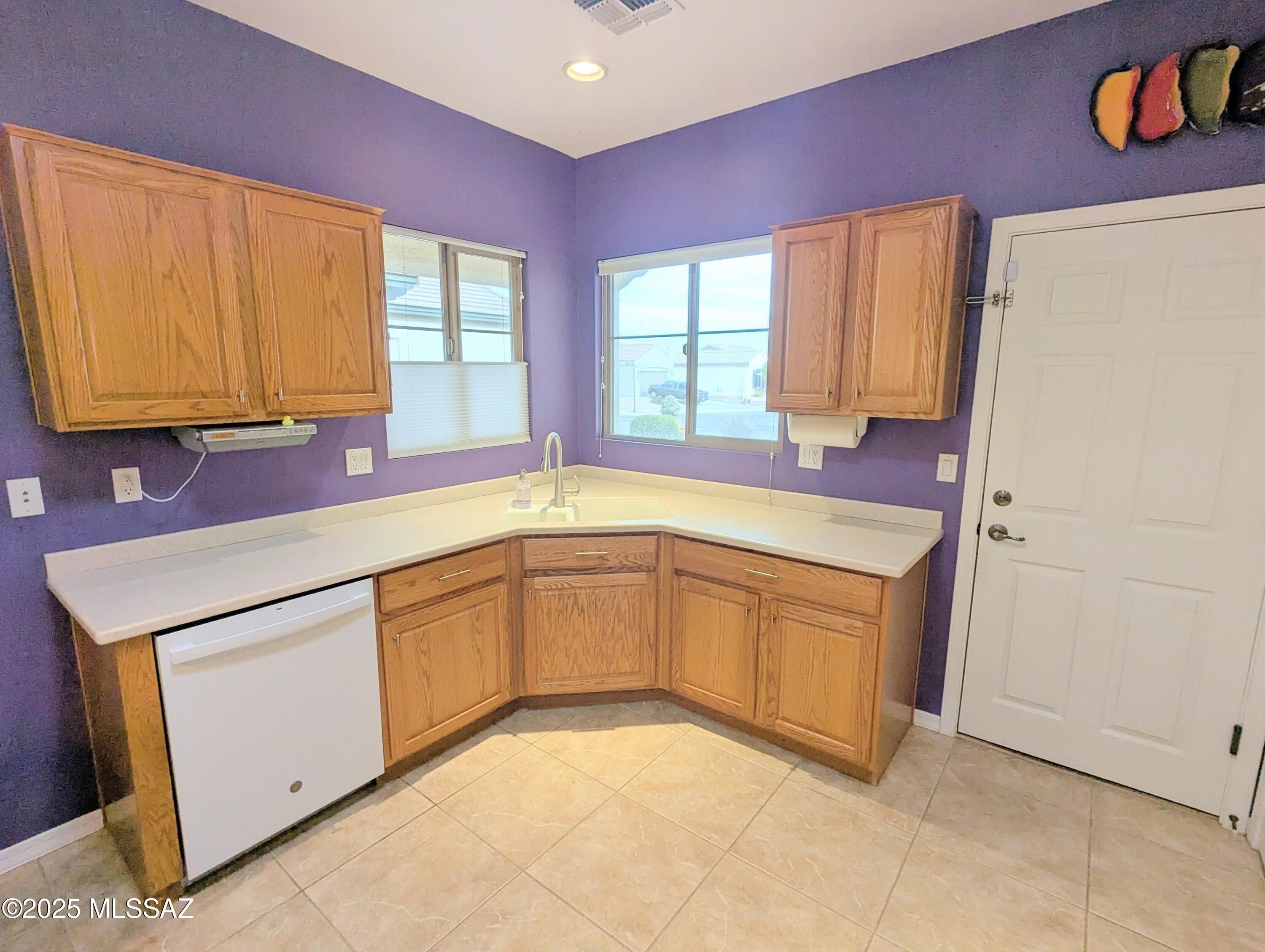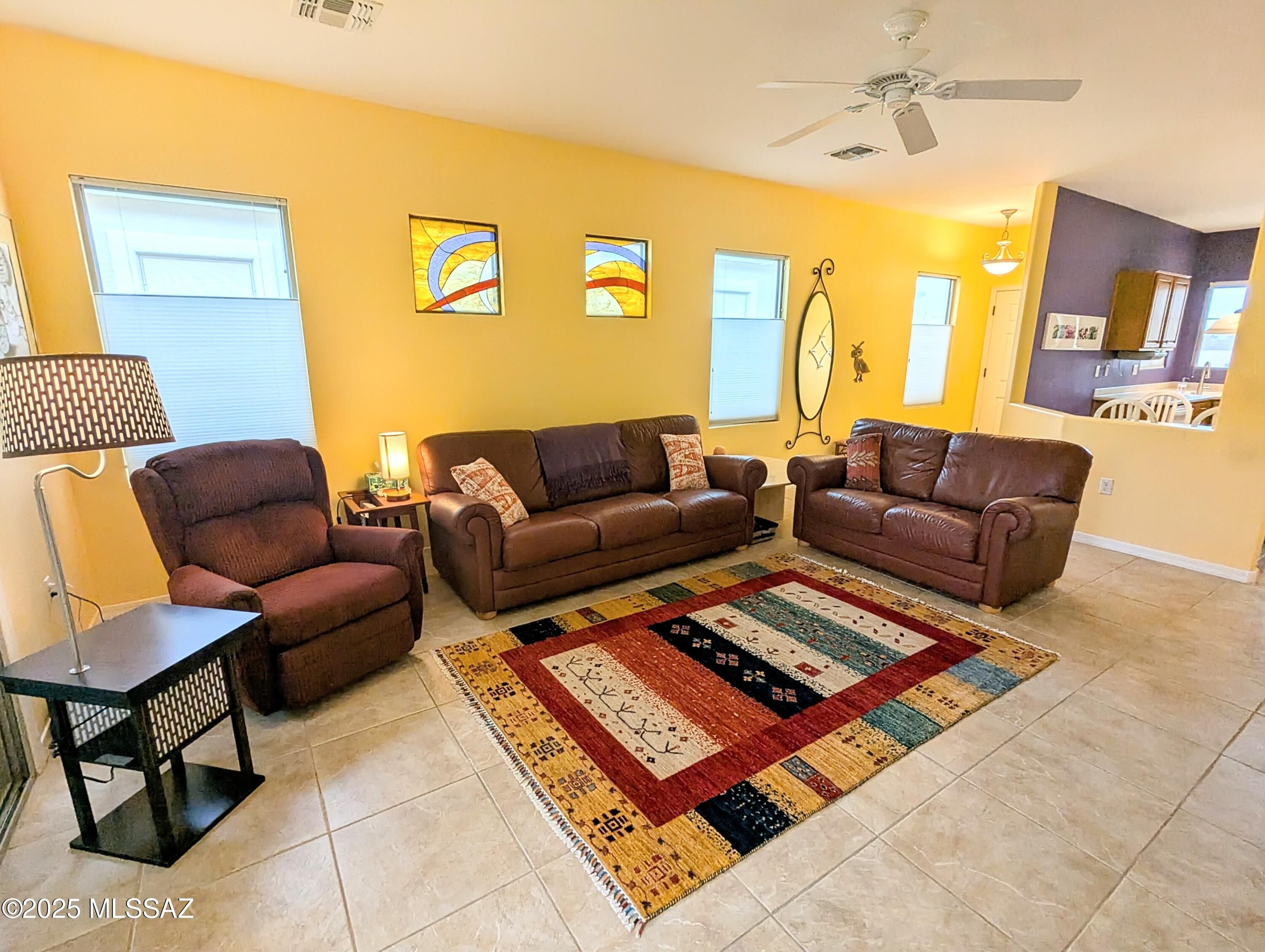 This absolutely charming and well-maintained home is being sold fully furnished and is move in ready. The combination of upgraded tile flooring throughout, Corian countertops, and beautiful mountain views, really makes it stand out. The enclosed patio and retractable awning add to the overall privacy and outdoor comfort, making it ideal for enjoying peaceful evenings. The wrought iron security door, front courtyard, widened driveway, and built-in cabinets in the garage, show how much attention to detail has been put into this home. It's the perfect place for either full-time or part-time living, especially with the quiet neighborhood and access to the Del Webb clubhouse. Rancho Sahuarita is just waiting for you to enjoy all of the award winning amenities.