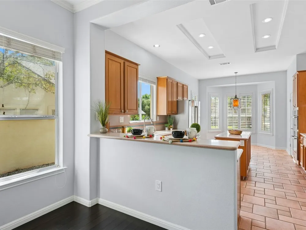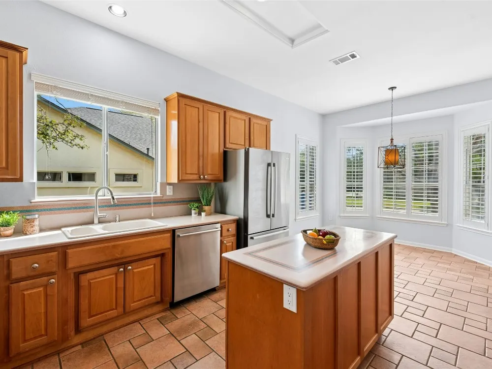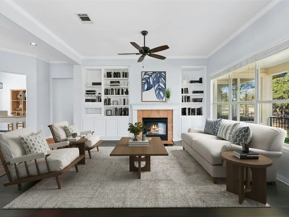 This Del Webb-built Trinity floor plan home sits on a private stretch of Sun City greenbelt — no backyard neighbors here. A stylish 8’ glass front door opens to tall 10’ ceilings and an open, comfortable layout. The kitchen includes Corian counters, a center island, Bosch appliances, gas cooktop, pantry, and a sunny bay window breakfast area. In the living room, a cozy fireplace is flanked by built-in shelves, ideal for displaying books or decor. Dark bamboo hardwood flooring adds warmth to the living and dining areas, study, and both bedrooms. Plantation shutters plus updated lighting and ceiling fans throughout bring a fresh, modern feel. The owner’s suite features a bay window with peaceful greenbelt views. The main bath has been upgraded with a jetted tub, frameless glass shower, and dual vanities with quartz counters. A separate laundry room includes a wash basin and extra space perfect for hobbies, crafts storage. Out back, the fully fenced yard opens to a deep greenbelt, offering plenty of privacy and space to relax. Bonus features include a decked attic and a brand-new roof installed in October 2025! 2011 HVAC. 2009 Water Heater.