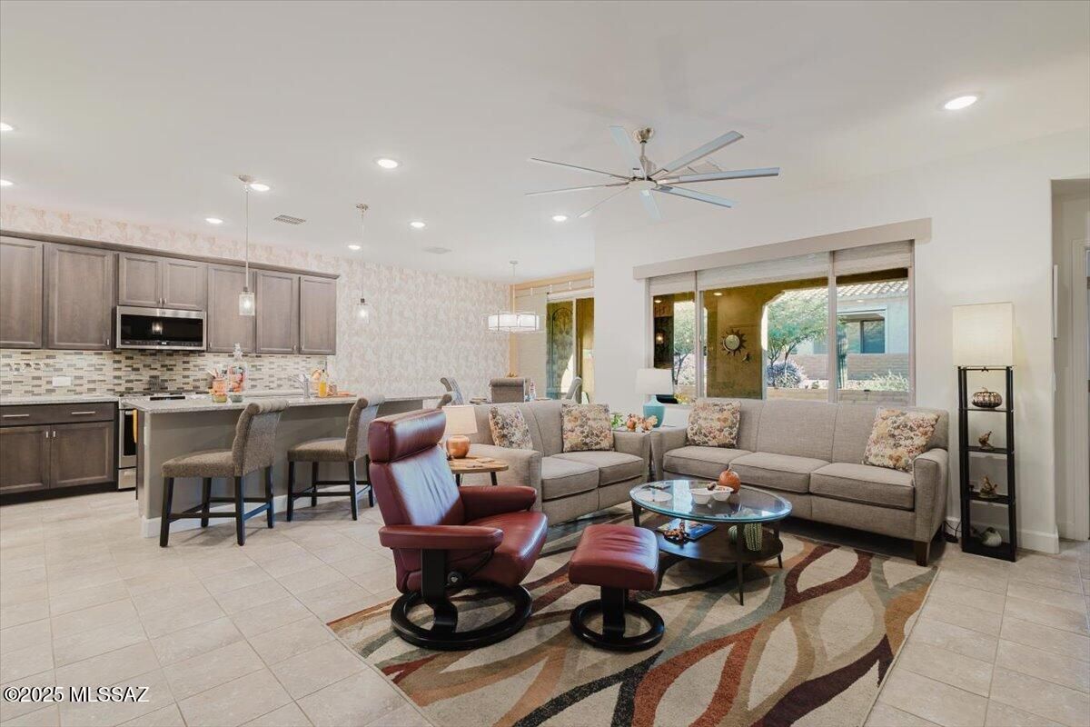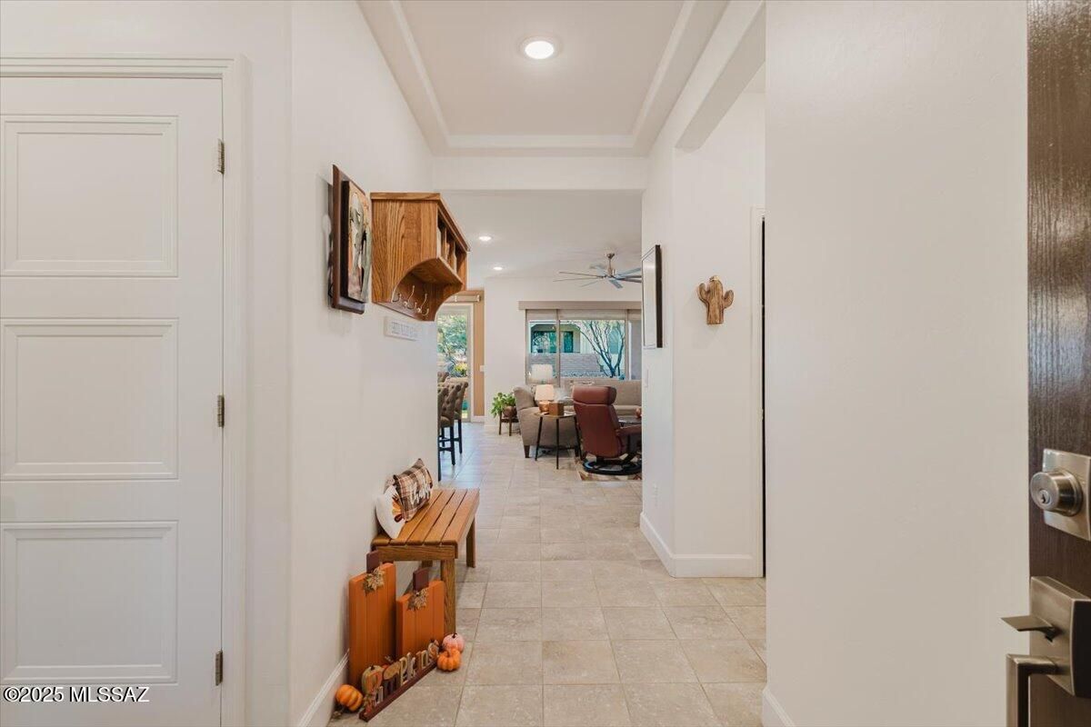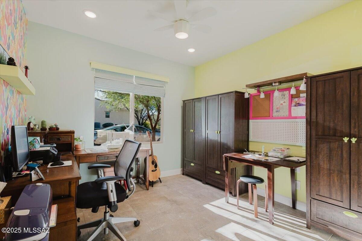 Discover the best of resort-style living in this beautiful Cholla model 3-bedroom, 2-bath Villa located in the luxurious 55+ Gated community of Quail Creek. Offering 1,399 sq ft of thoughtfully designed living space, this home combines comfort and convenience with HOA-maintained front yard care and roof repair. When you enter into the Foyer, you know that this home is special. Kitchen offers Granite countertops, Gas range, 42'' executive height cabinets, beautiful backsplash and accent lighting. Granite countertops in all bathrooms. Large sink in Laundry Room. Step outside and enjoy world-class amenities including golf, pickleball, tennis, a sparkling pool, and a vibrant recreation center. Quail Creek offers not just a home, but a wonderful lifestyle -- where every day feels like a getaway
